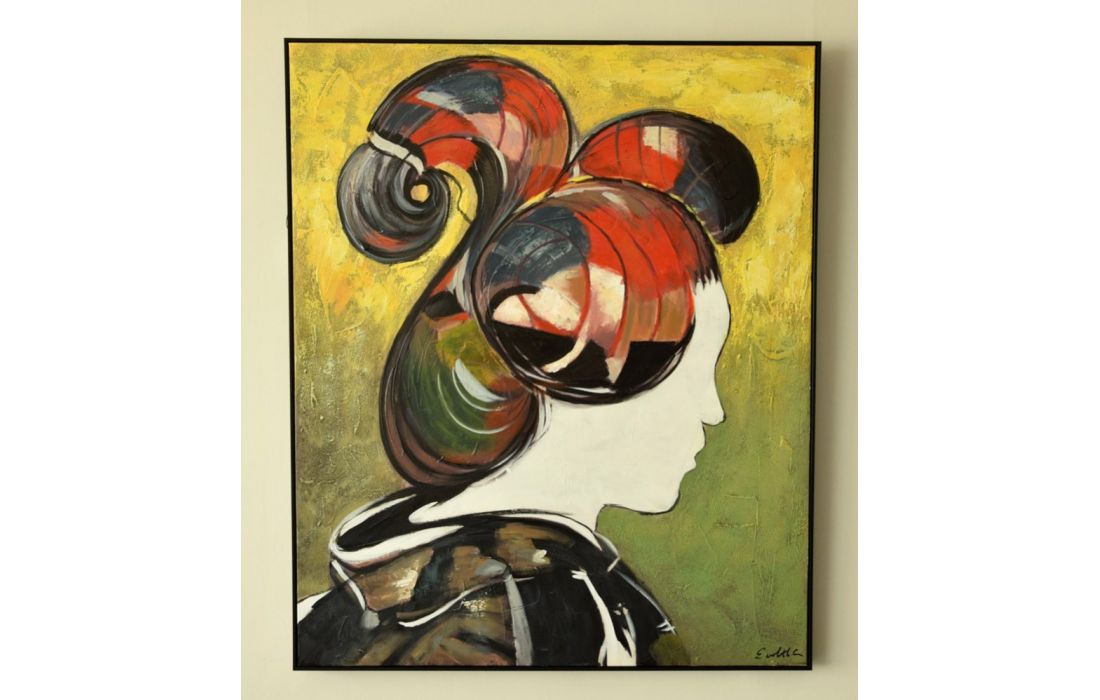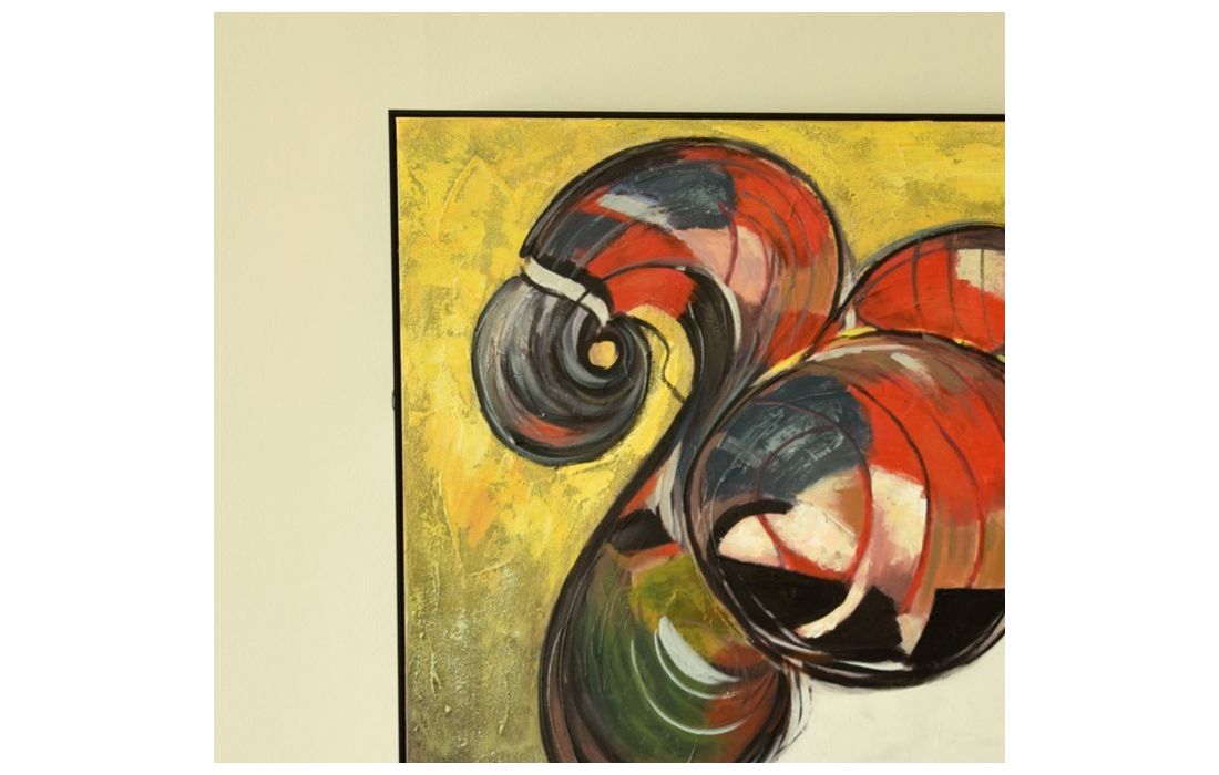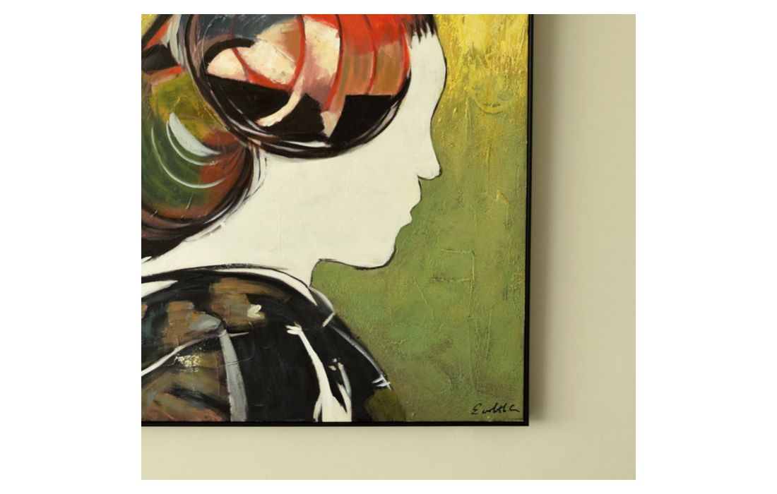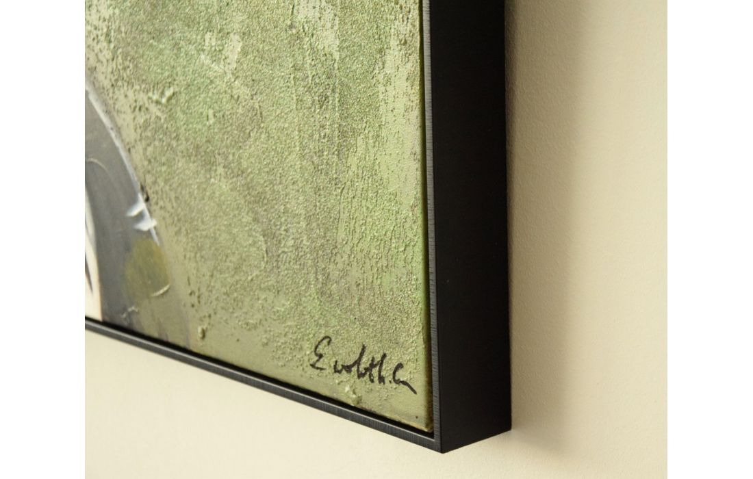 Pintura pintada á mão em tela com moldura de madeira cor preta.