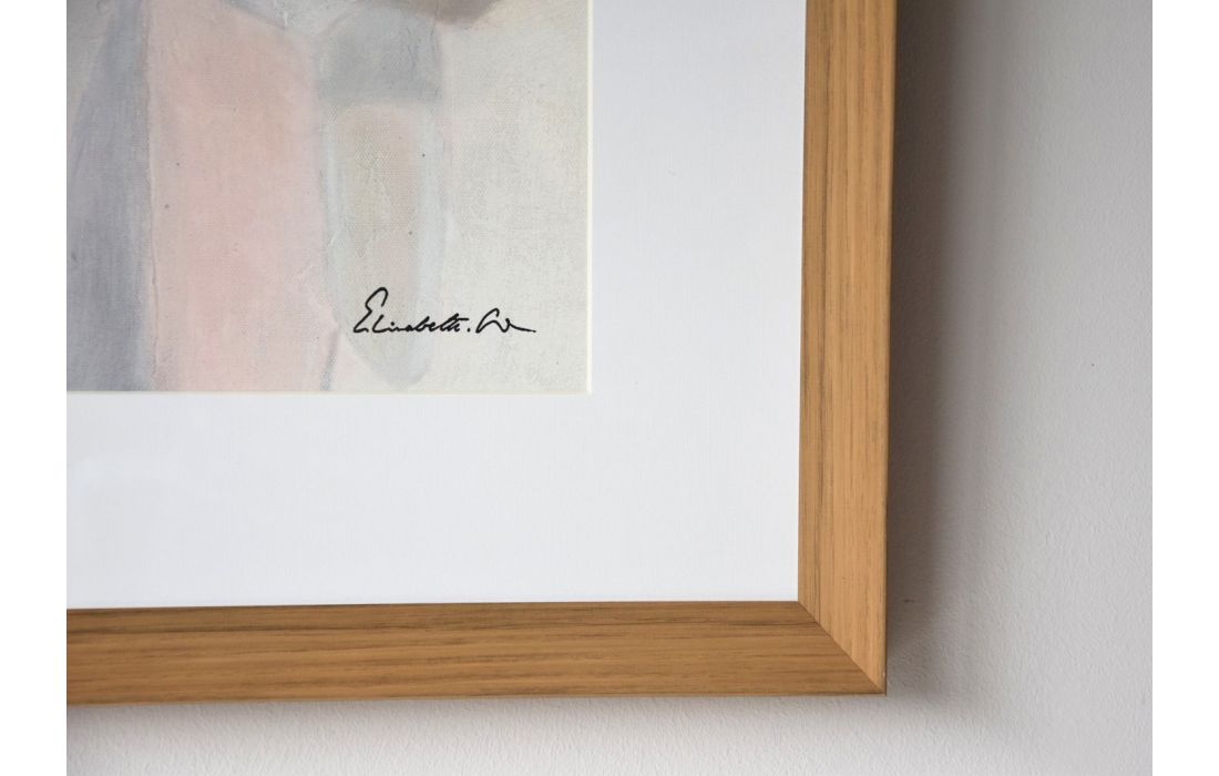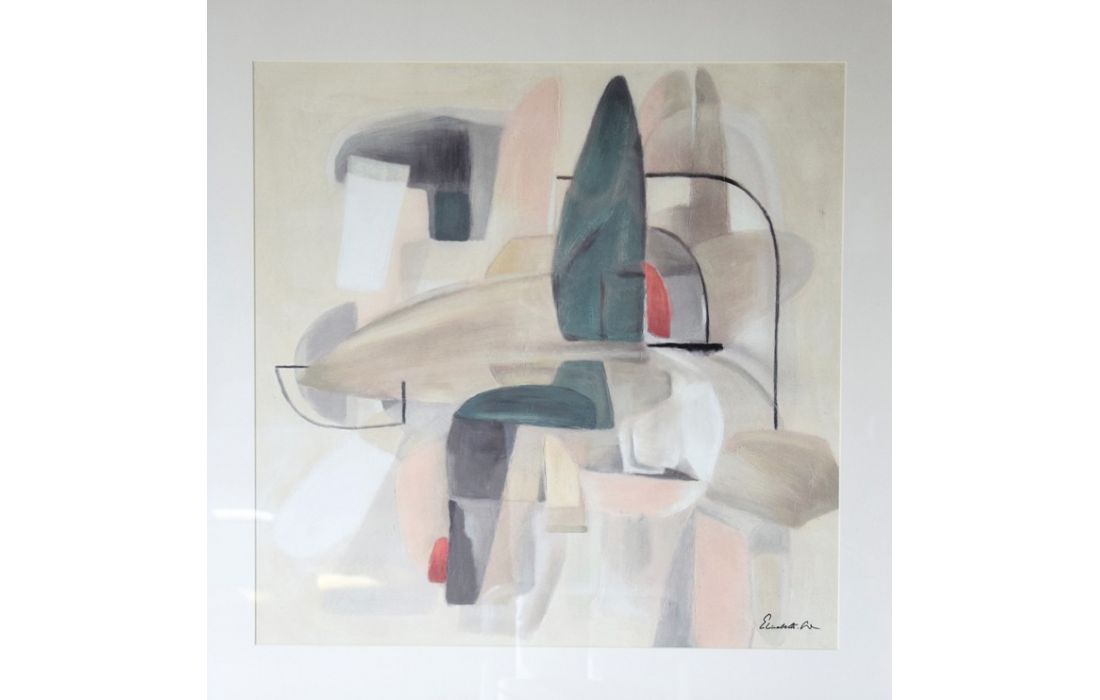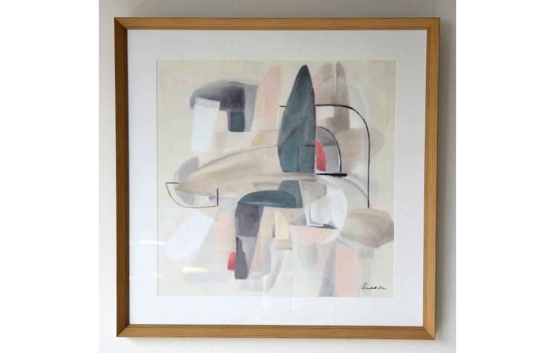 Pintura abstrata pintada á mão em papel emoldada em vidro com moldura de madeira natural