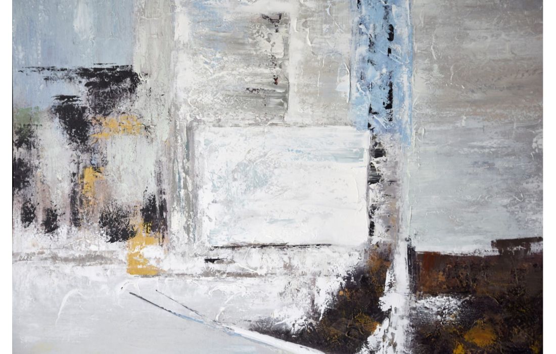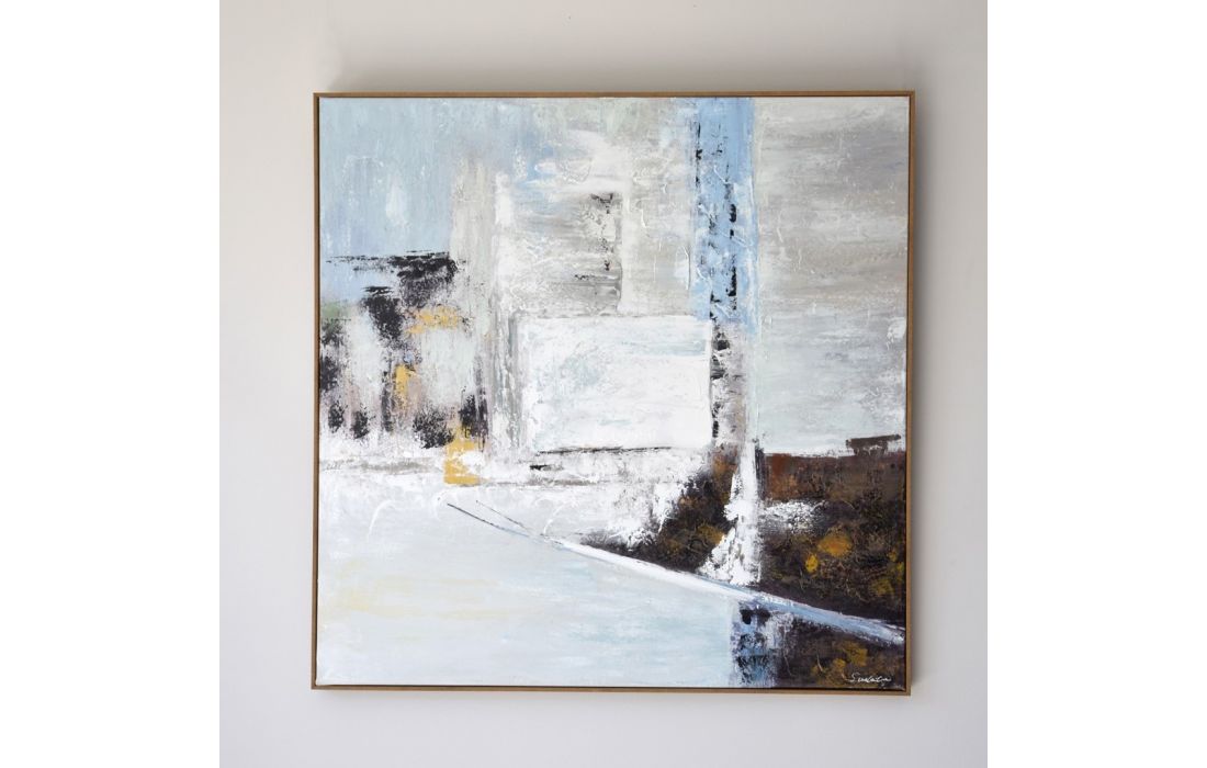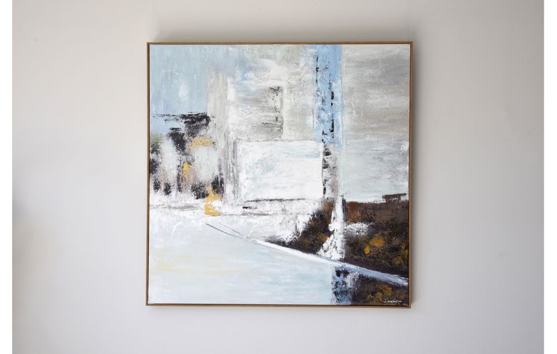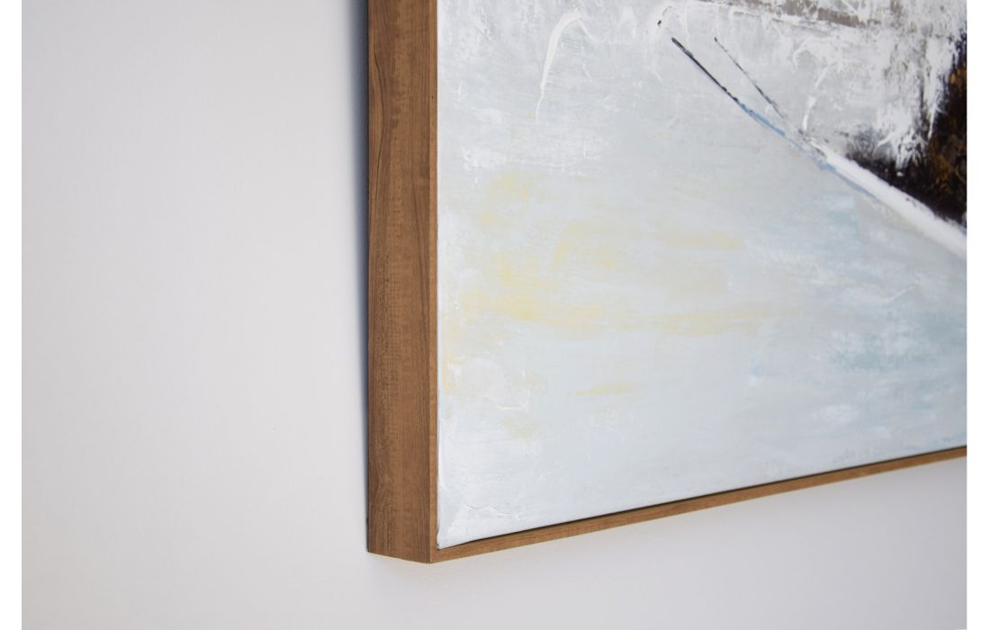 Quadro com acabamento de madeira natural com pintura abstrata feita à mão em tela.