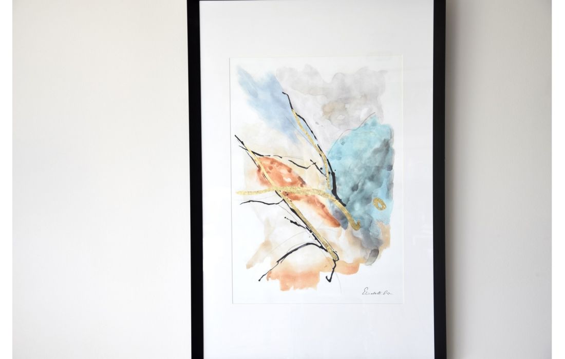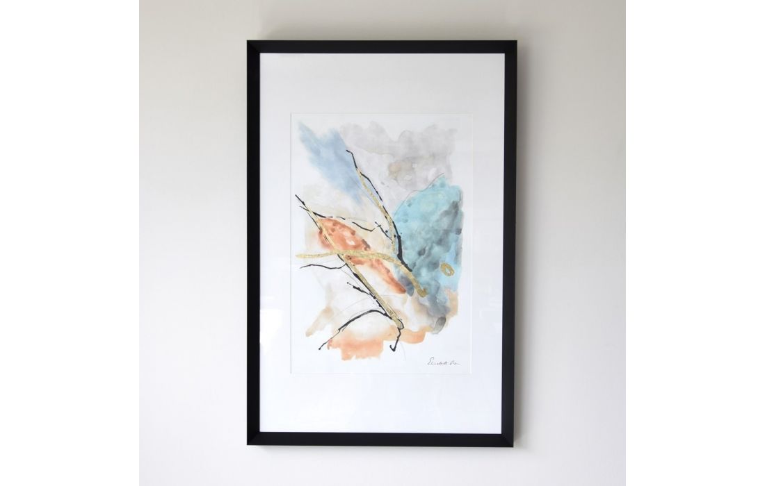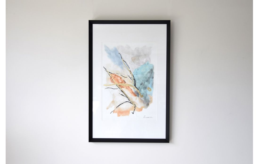 Pintura abstrata feita à mão em papel com aplicação de folha dourada. Moldurado em vidro e com moldura preta.