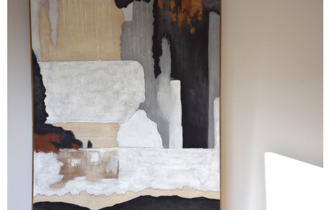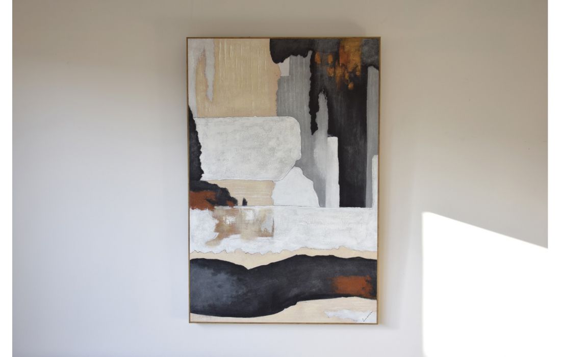 Pintura abstrata feita à mão em lona em tons de branco, beigeocre, cinza e preto, com moldura de madeira.