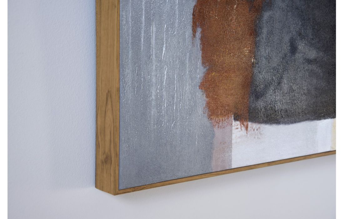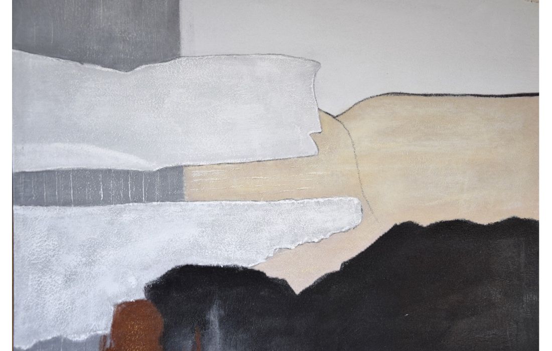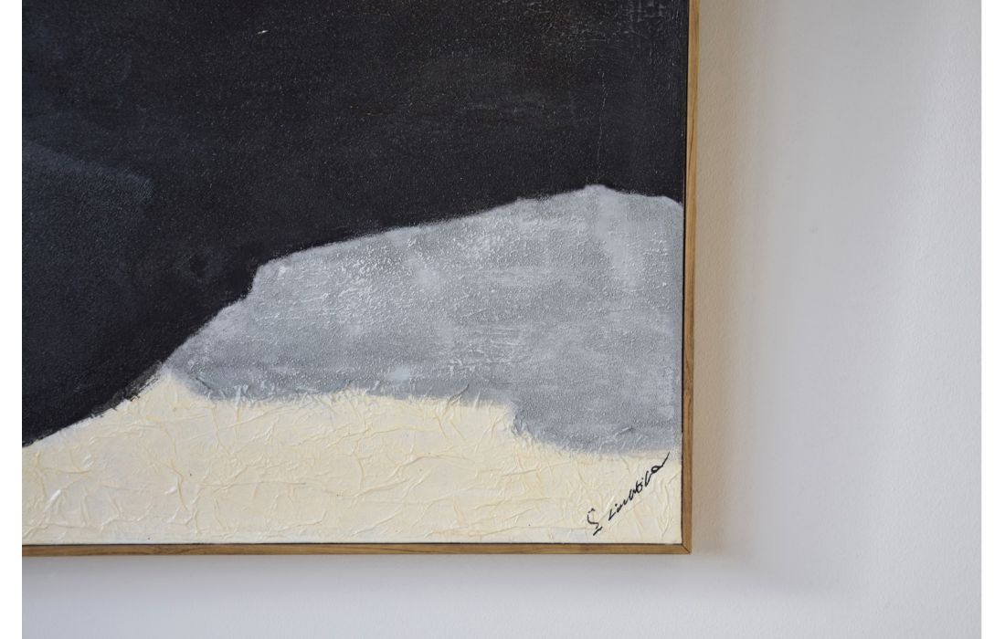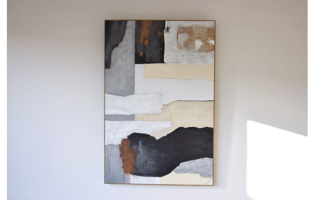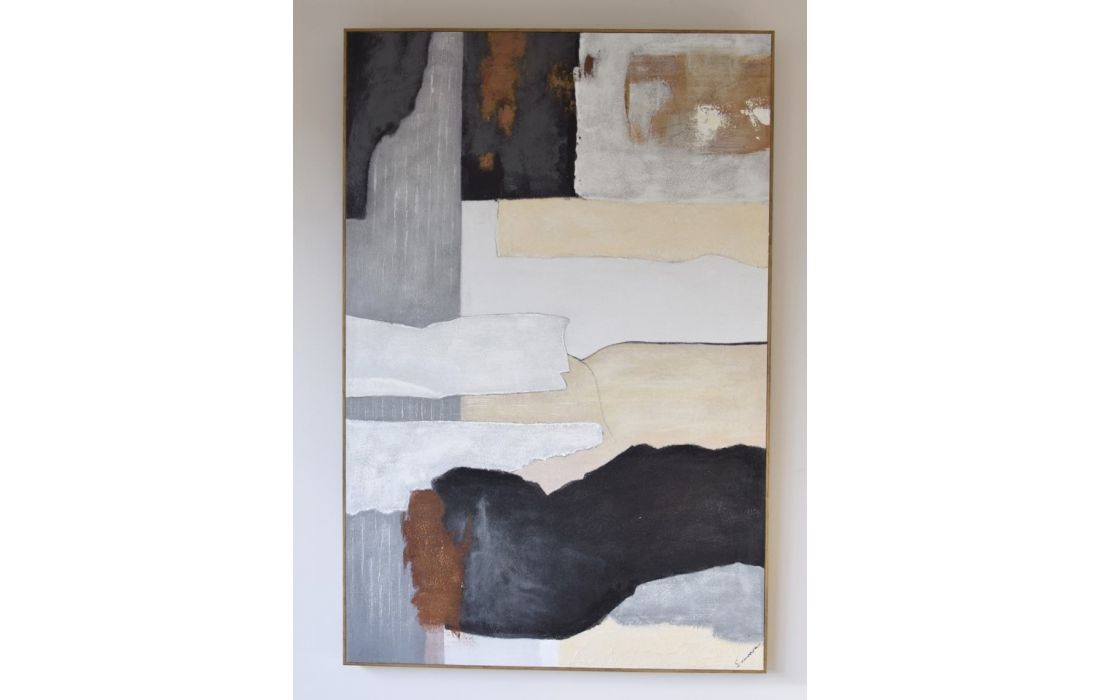 Pintura abstrata feita à mão em lona em tons de branco, beigeocre, cinza e preto, com moldura de madeira.