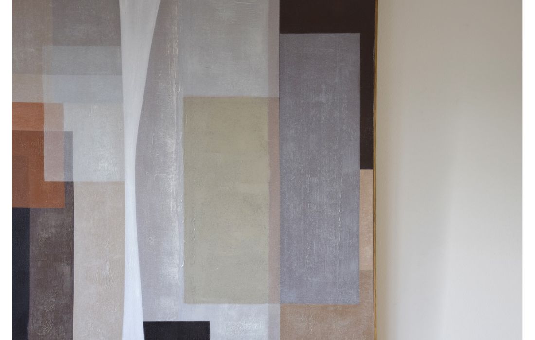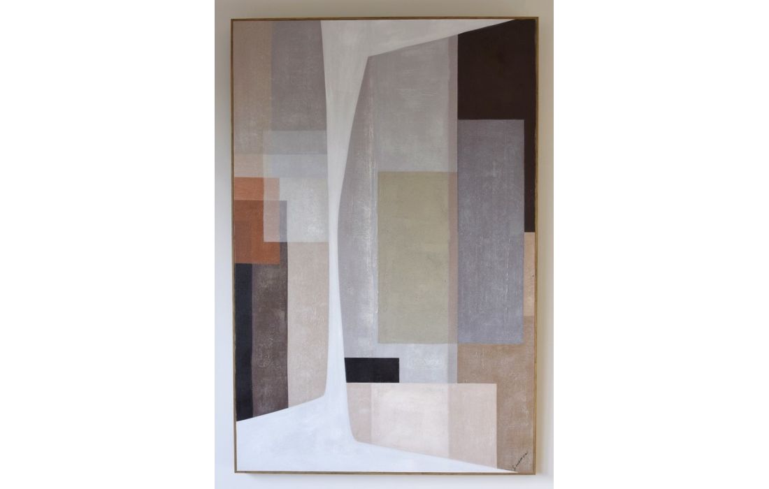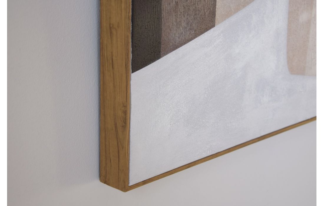 Pintura abstrata feita à mão em tons cinzentos brancos ocres e toque preto, com moldura de madeira.