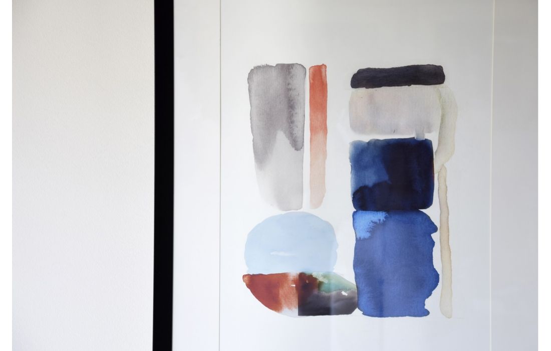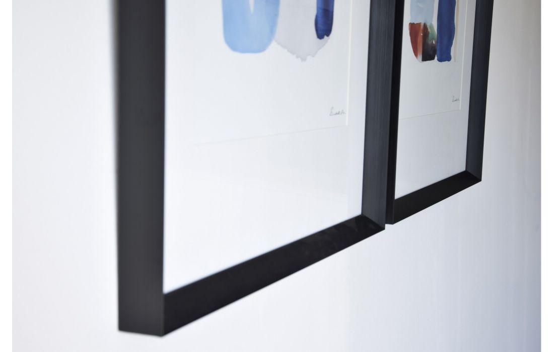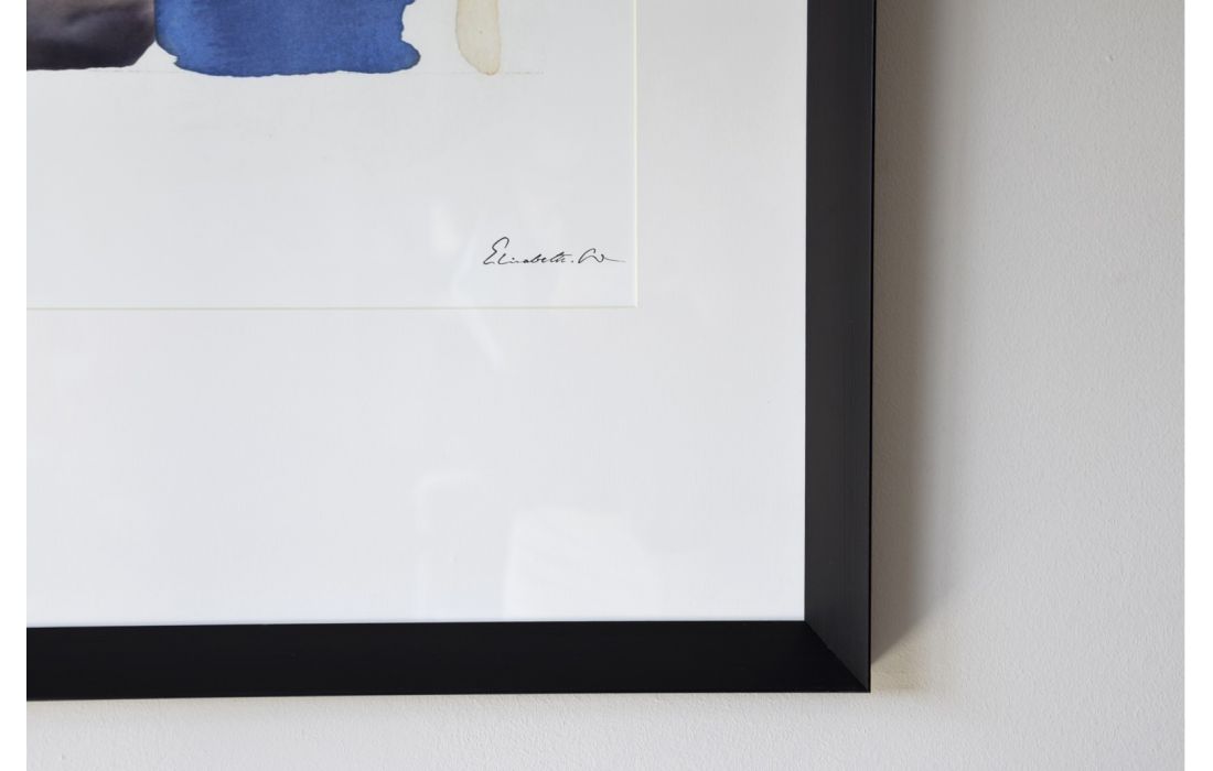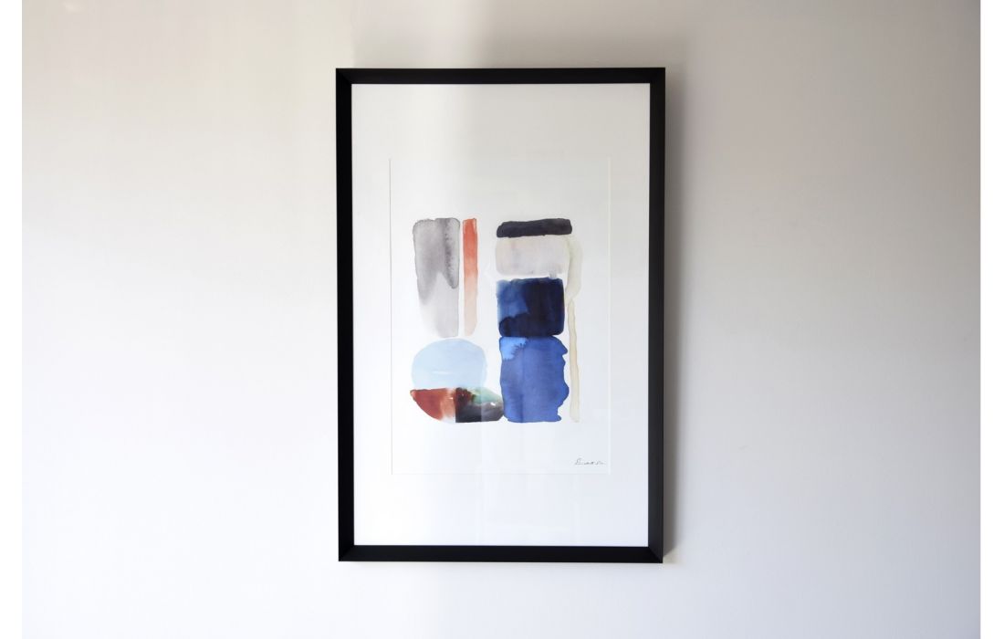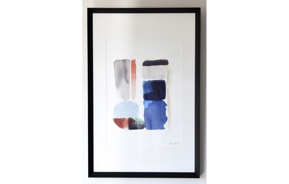Pintura abstrata feita à mão em papel moldurada em vidro e com moldura preta.