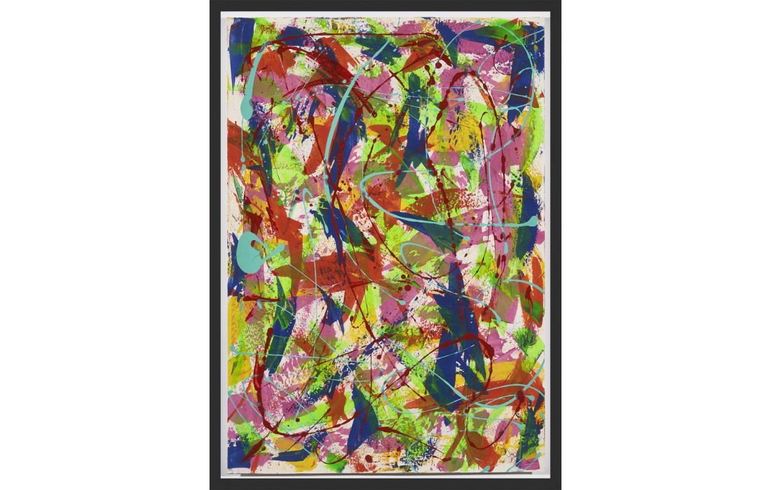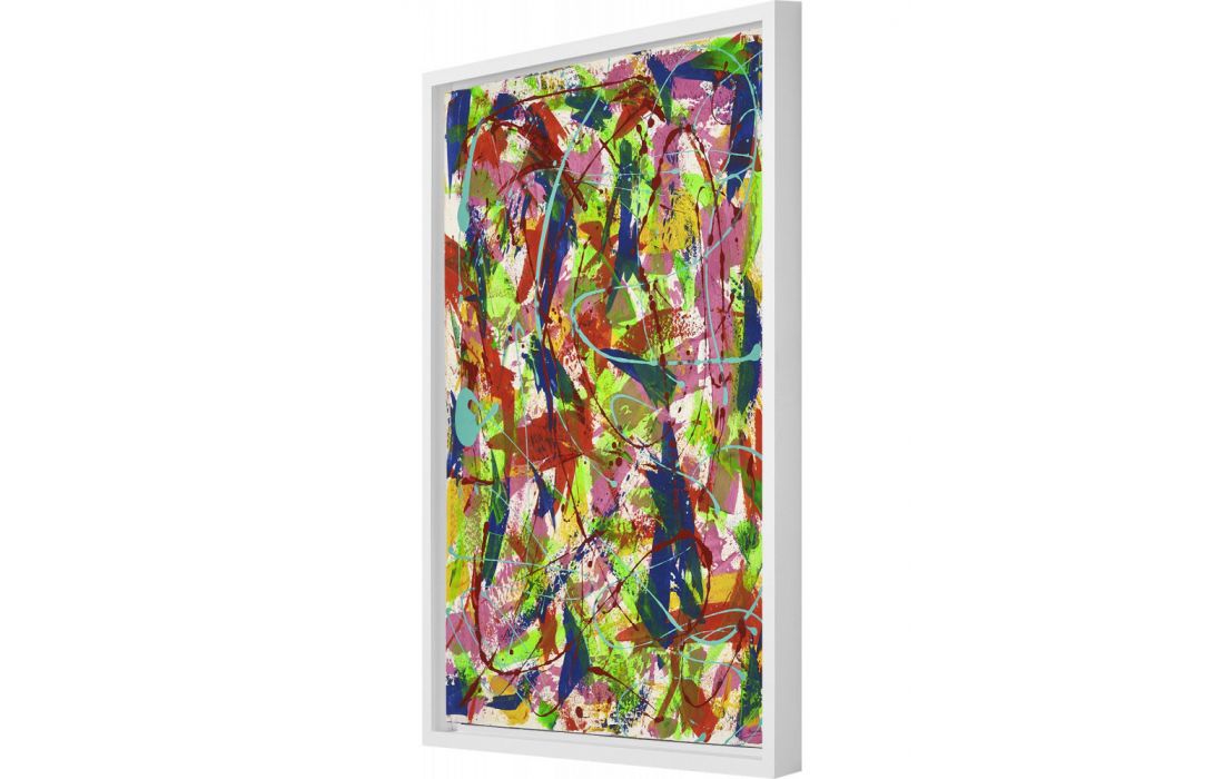 Pintura original abstrata da autora Marina Nova em tela com vidro e moldura com opções de cores lacado branco e preto