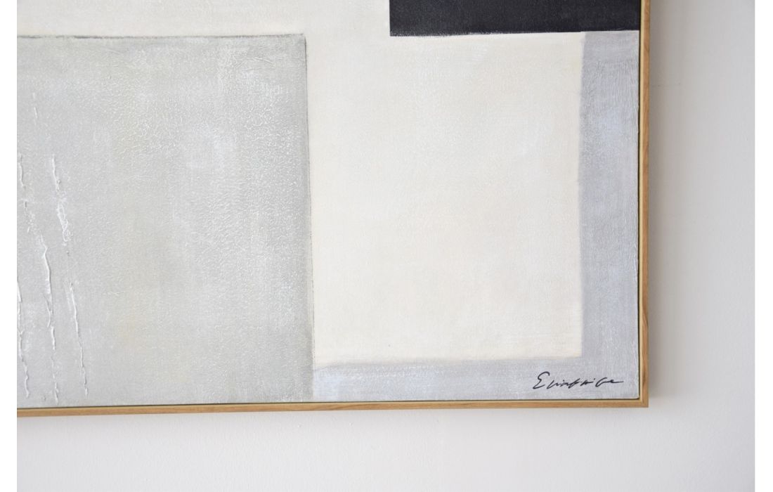 Quadro abstrato pintado à mão com tinta acrilica em tela, em tons de telha, creme cinzento, branco e preto. Quadro com acabamento em cor de madeira