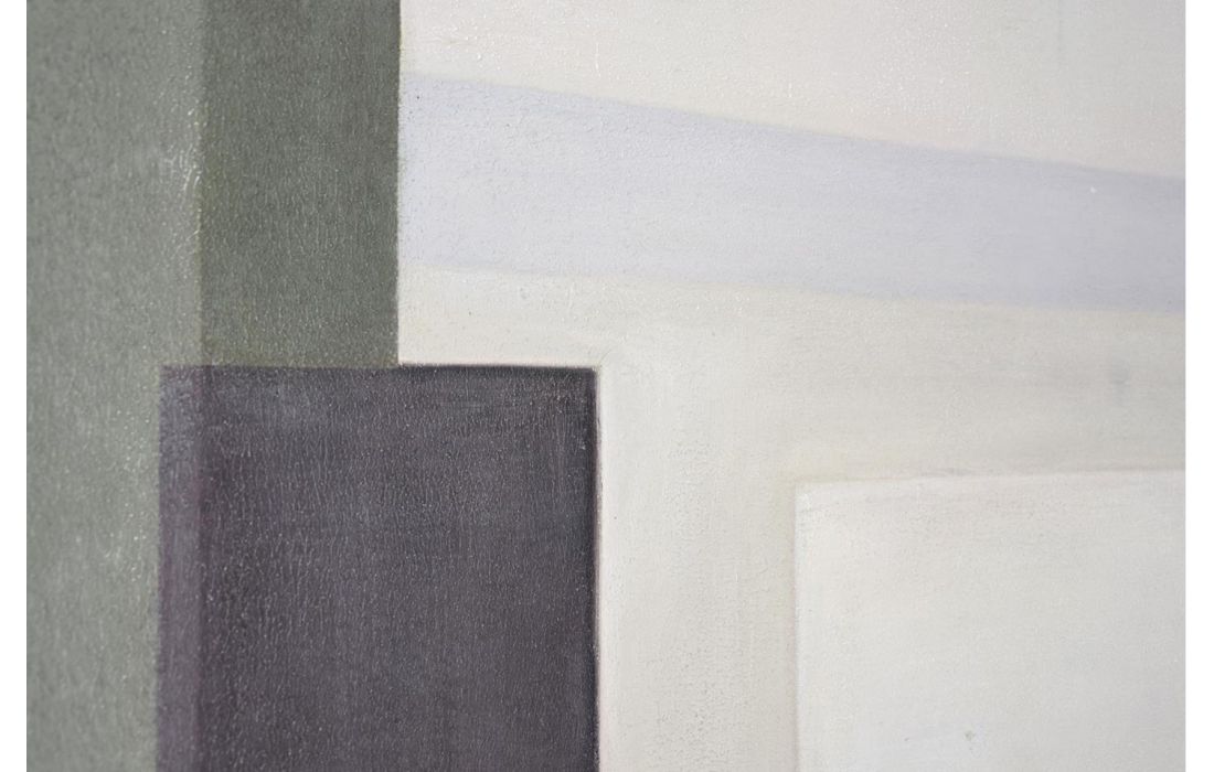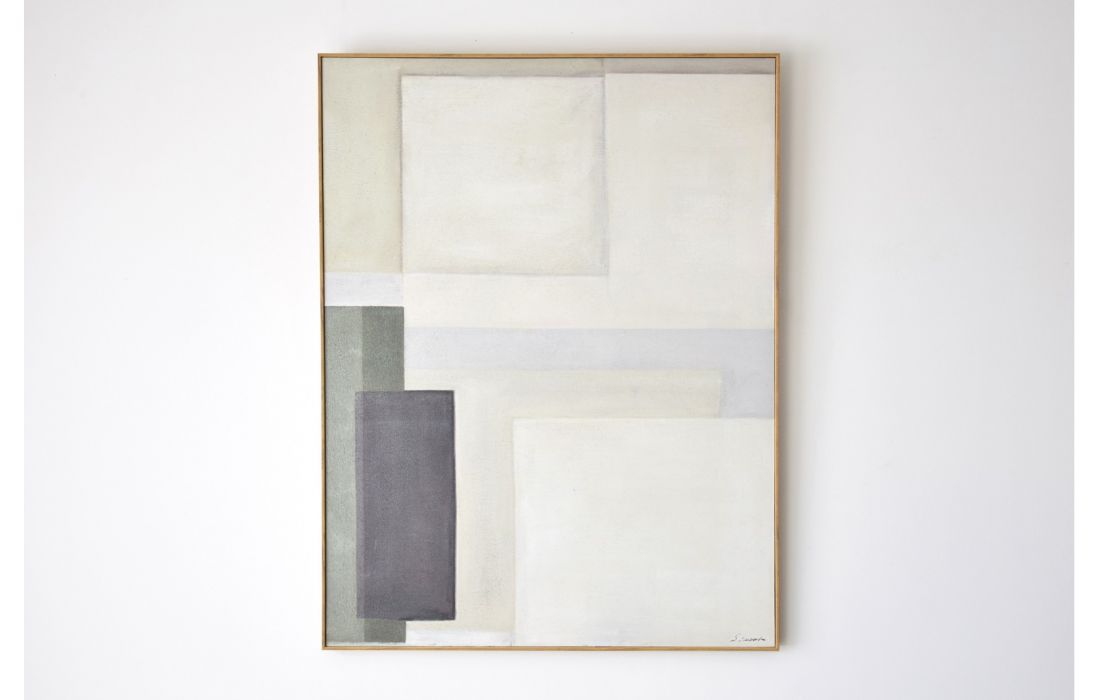 Quadro abstrato pintado à mão com tinta acrilica em tela, em tons de verde, creme, cinzento, branco e preto. Quadro com acabamento em cor de madeira