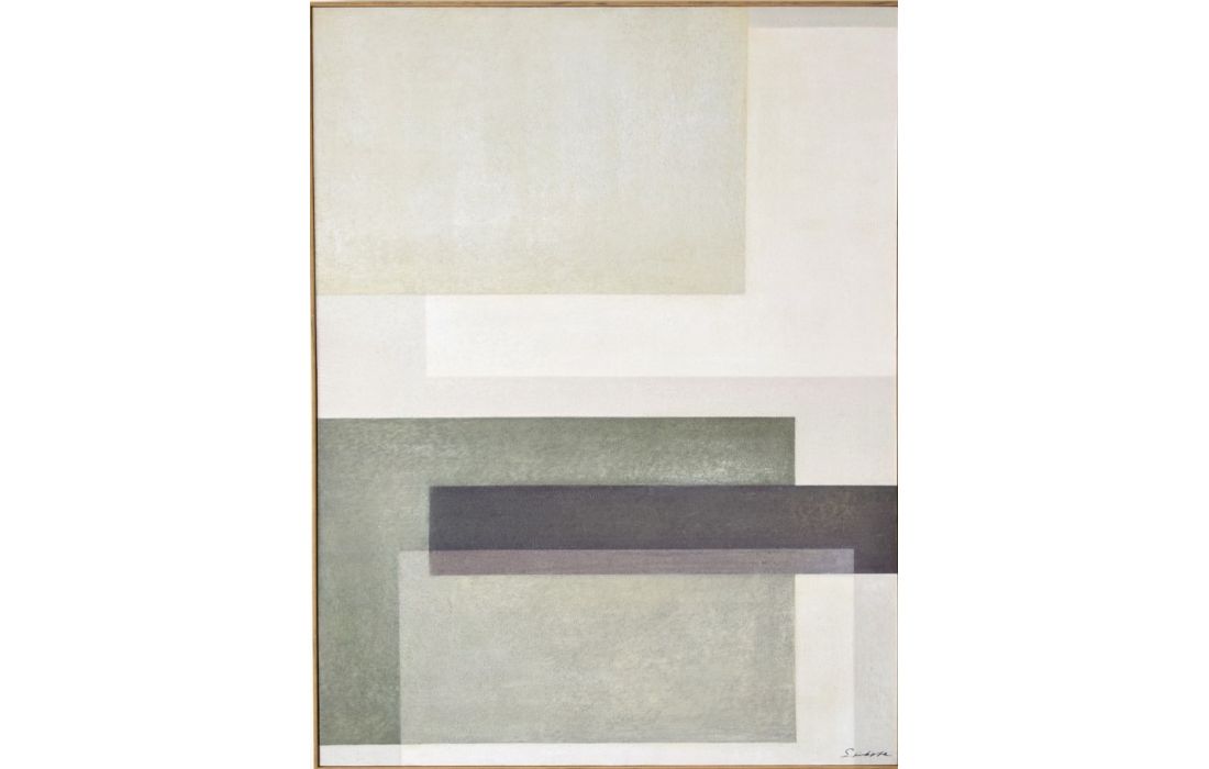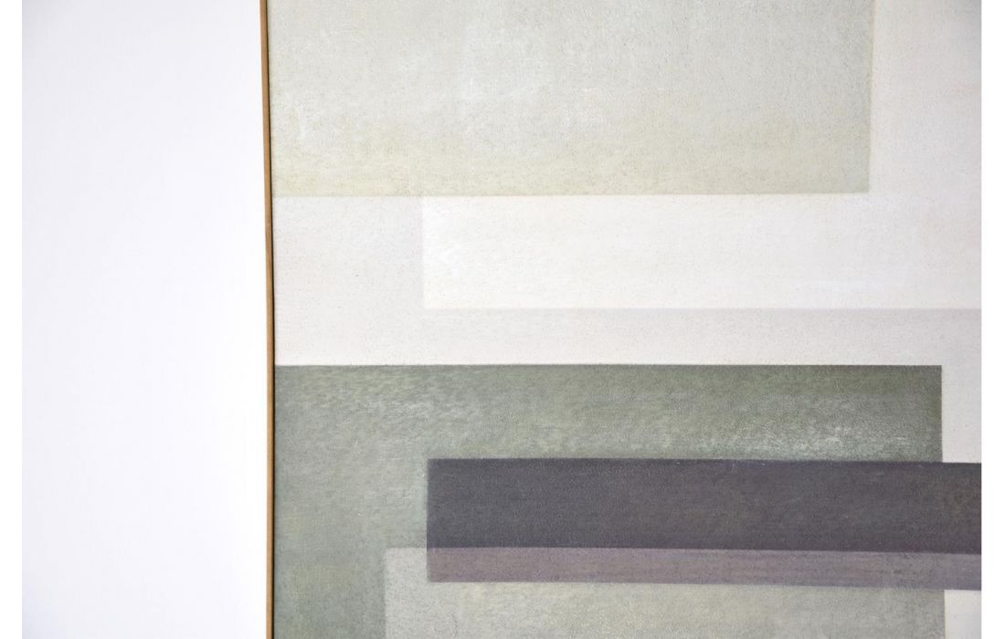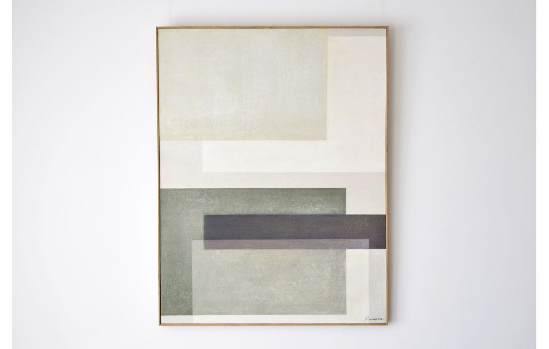 Quadro abstrato pintado à mão com tinta acrilica em tela, em tons de verde, creme, cinzento, branco e preto. Quadro com acabamento em cor de madeira