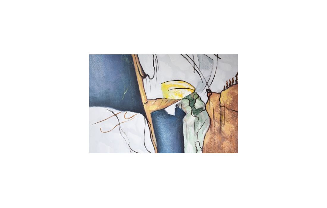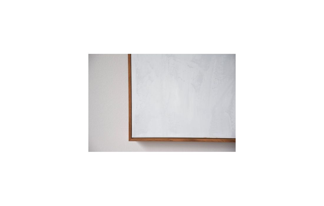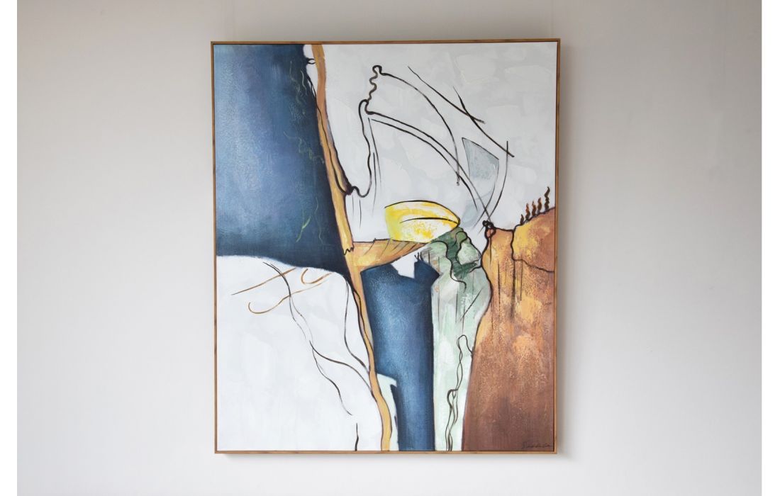 Pintura pintada á mão em tela com moldura de madeira cor natural.