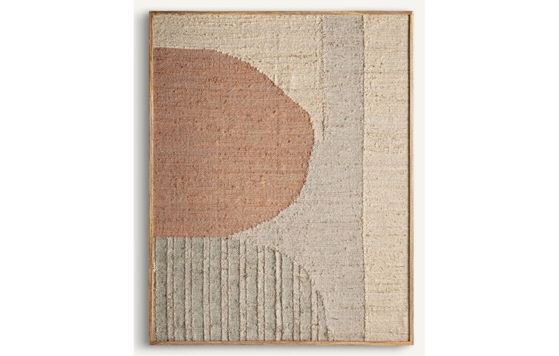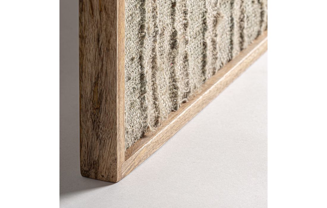 Pintura de estilo boho feita em madeira combinado com cânhamo e algodão em tons de castanho
