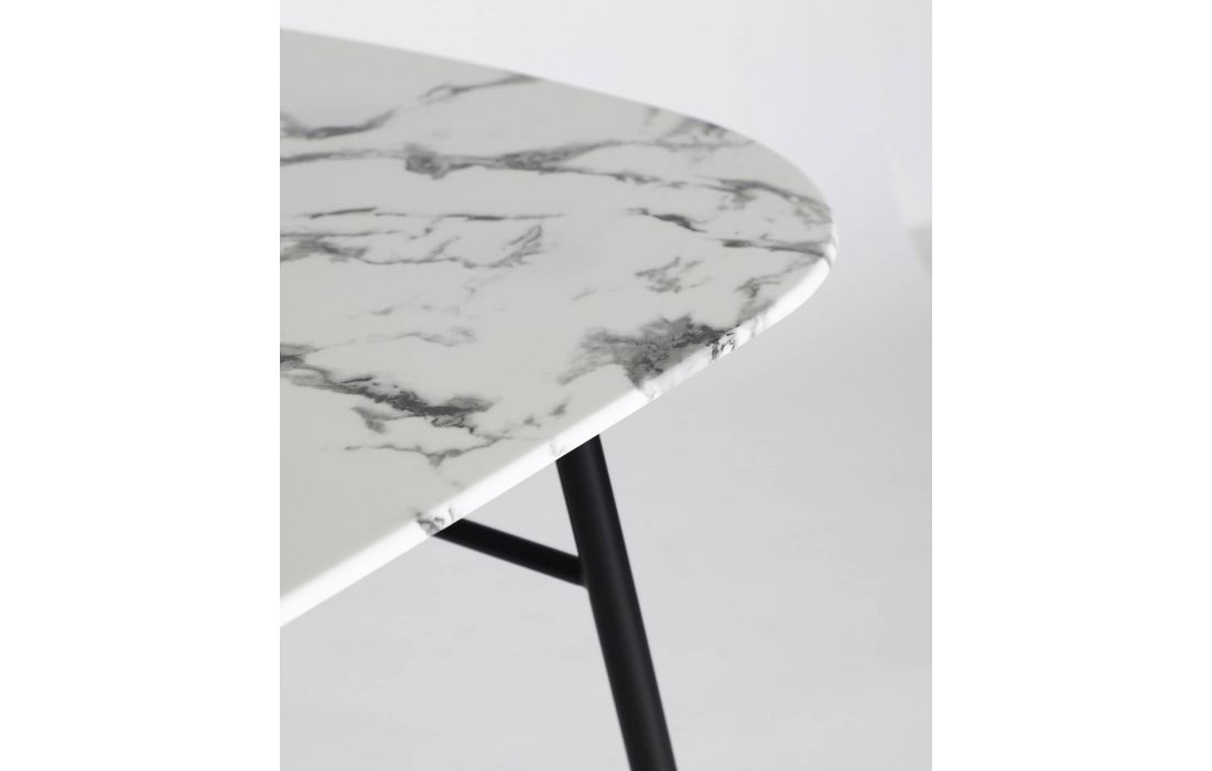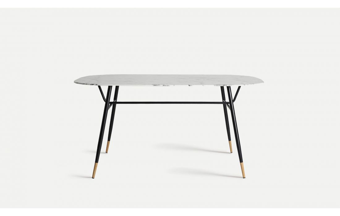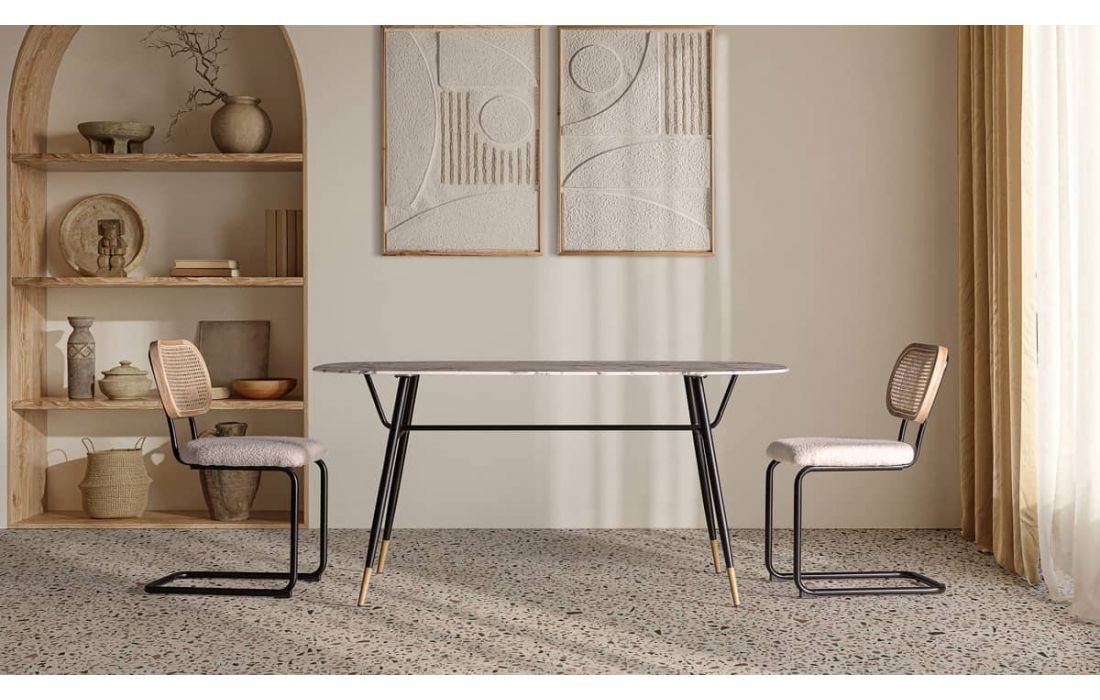 A mesa GRAZ combina um design moderno e elegante com uma superfície de efeito de mármore branco, pernas de metal e detalhes dourados. Ideal para espaços minimalistas, sua estrutura leve traz sofisticação e funcionalidade para qualquer ambiente.