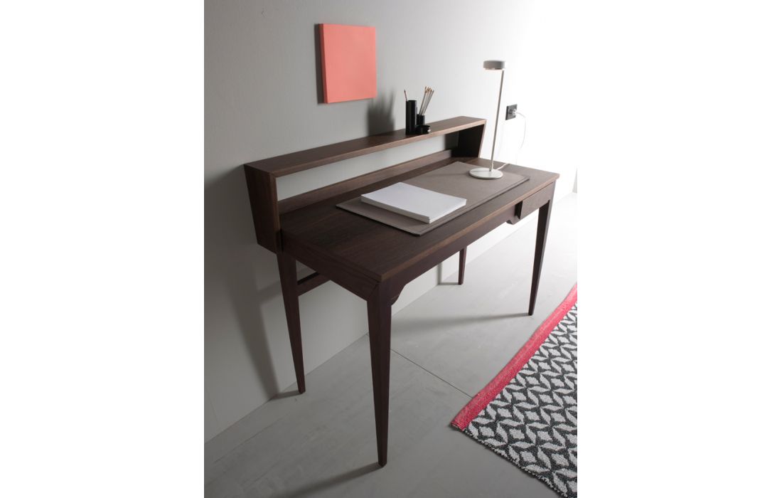 Secretária com estrutura em madeira de nogueira ou carvalho queimado com 1 gaveta e com tampa de abertura