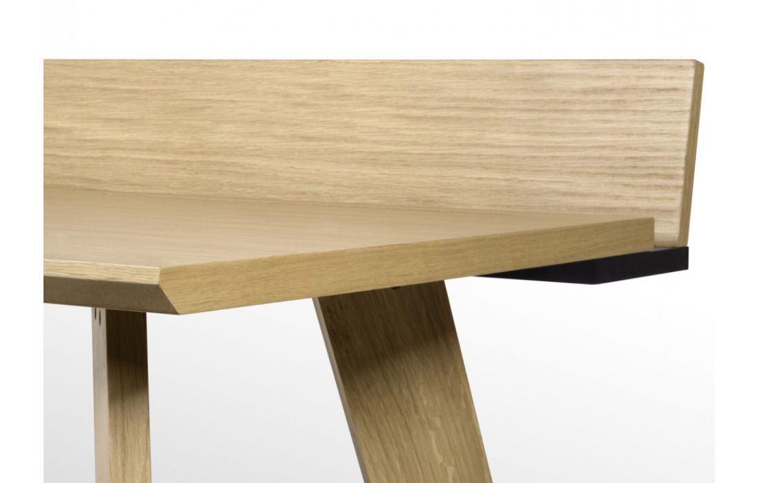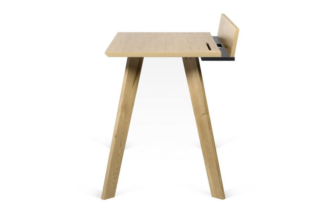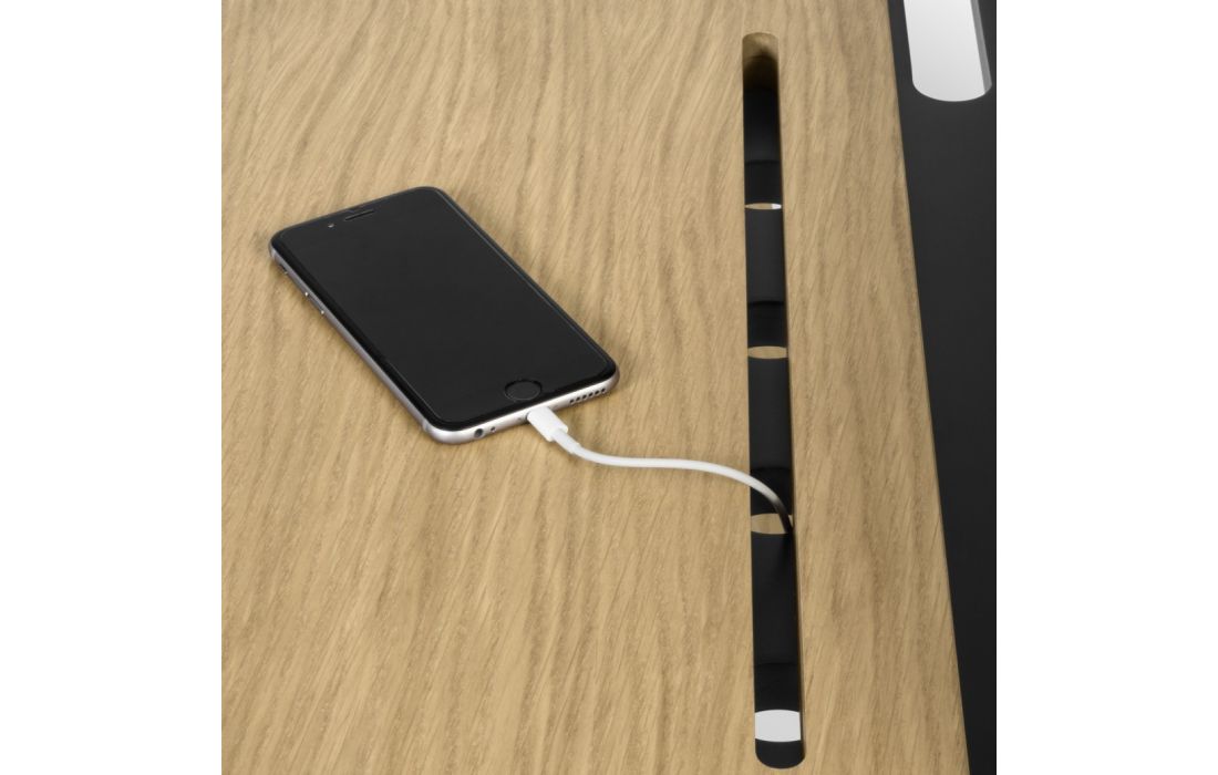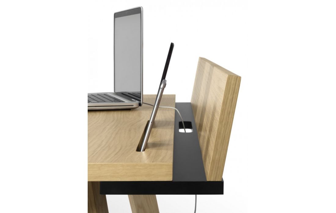 Secretária com diferentes áreas para a disposição de tablets, telemóveis e cadernos. O elemento lacado a preto inclui uma zona central aberta para a passagem de cabos, o que contribui para uma área de trabalho mais livre de fios.
