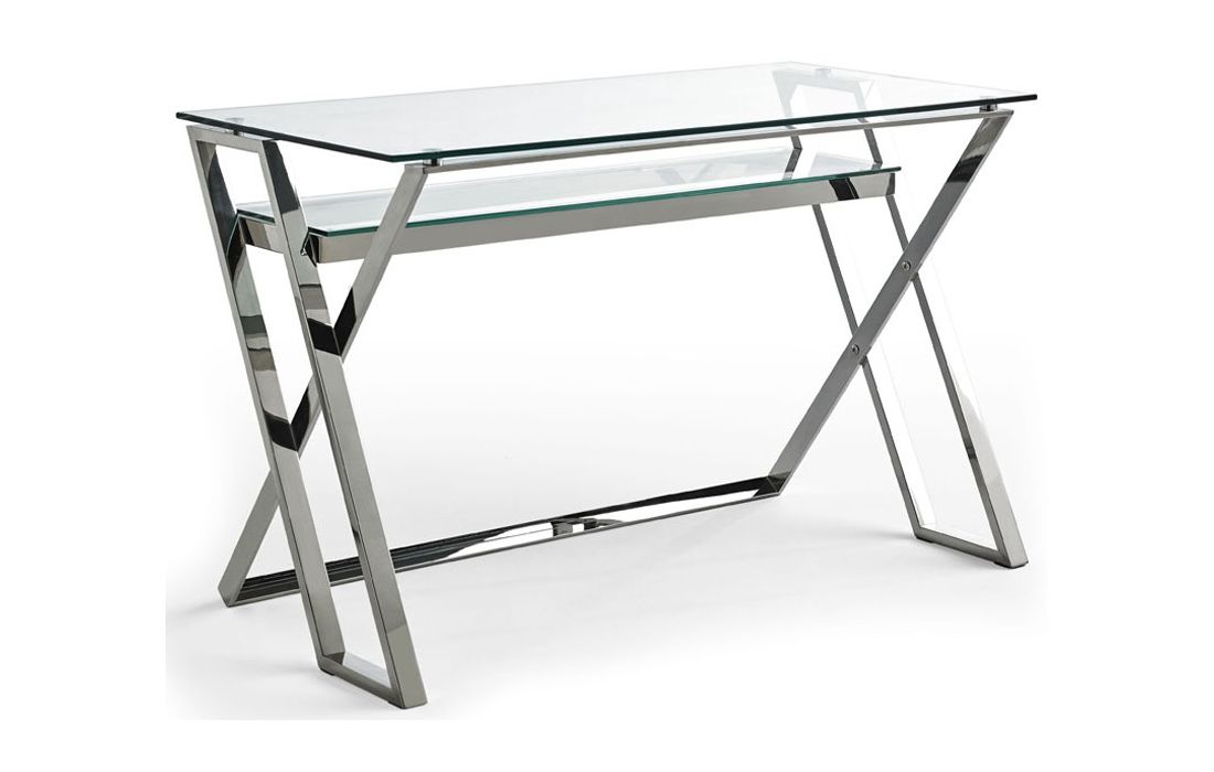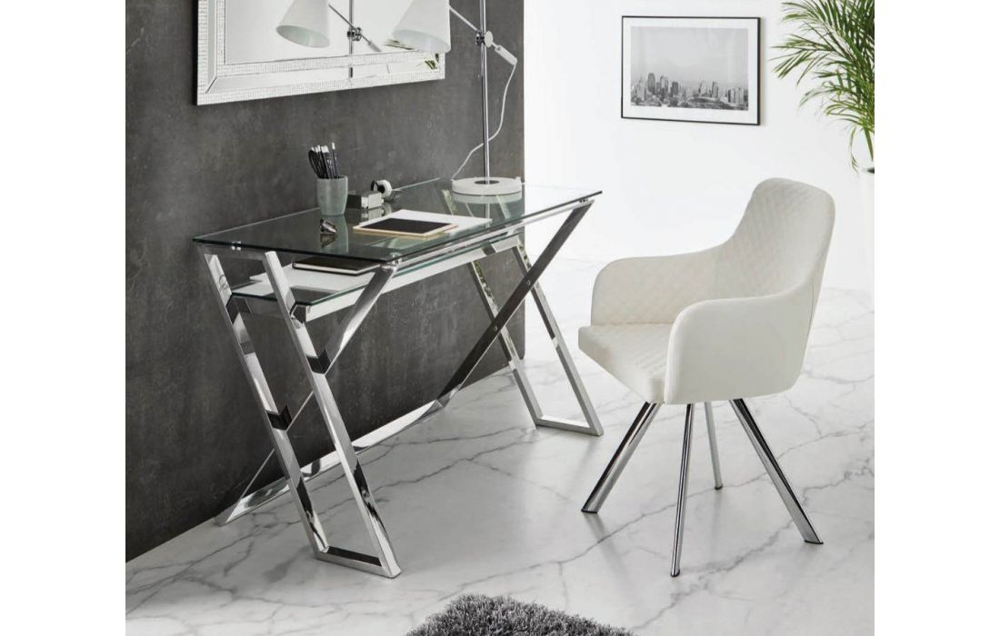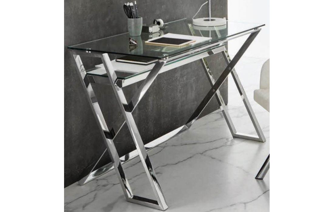 Secretária com tampo de vidro temperado 10mm, pés em aço inoxidável.