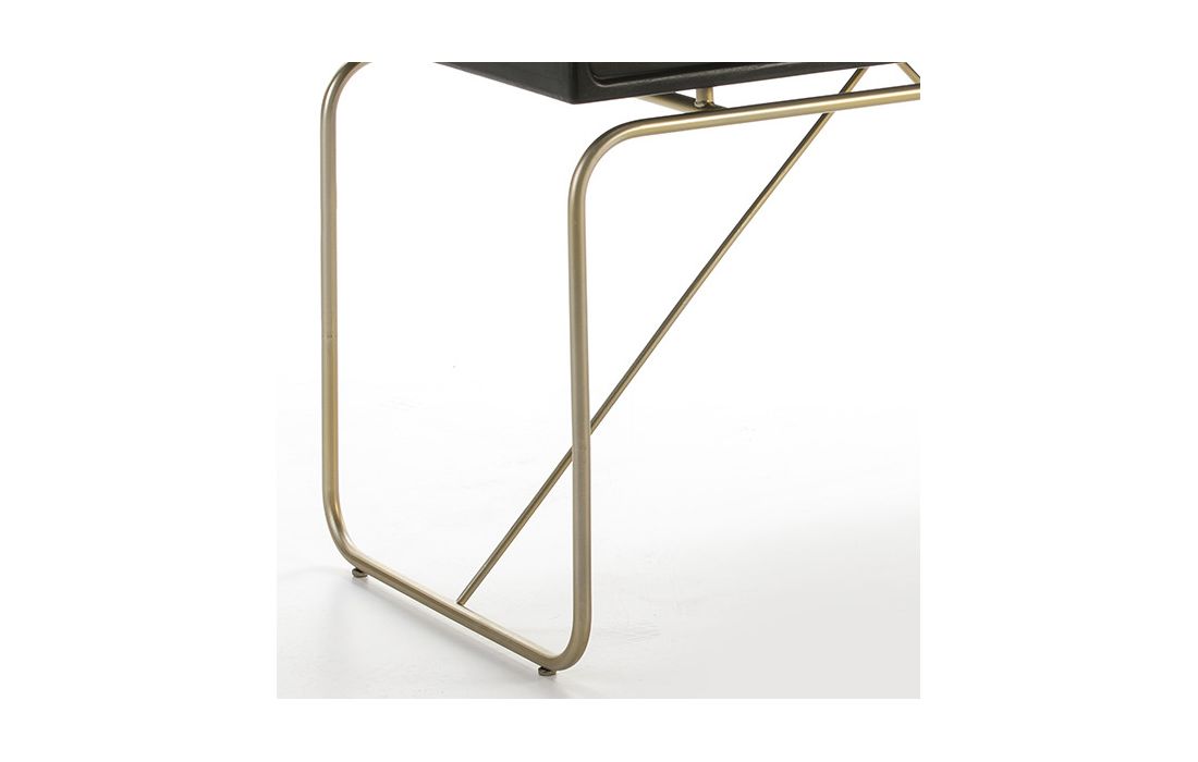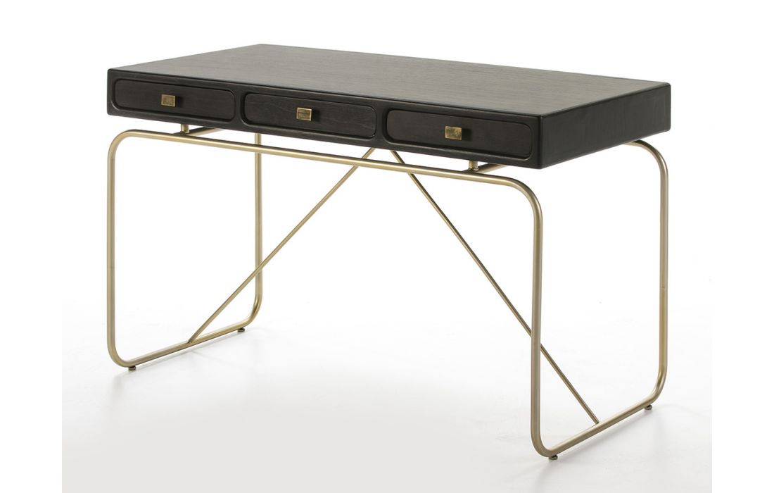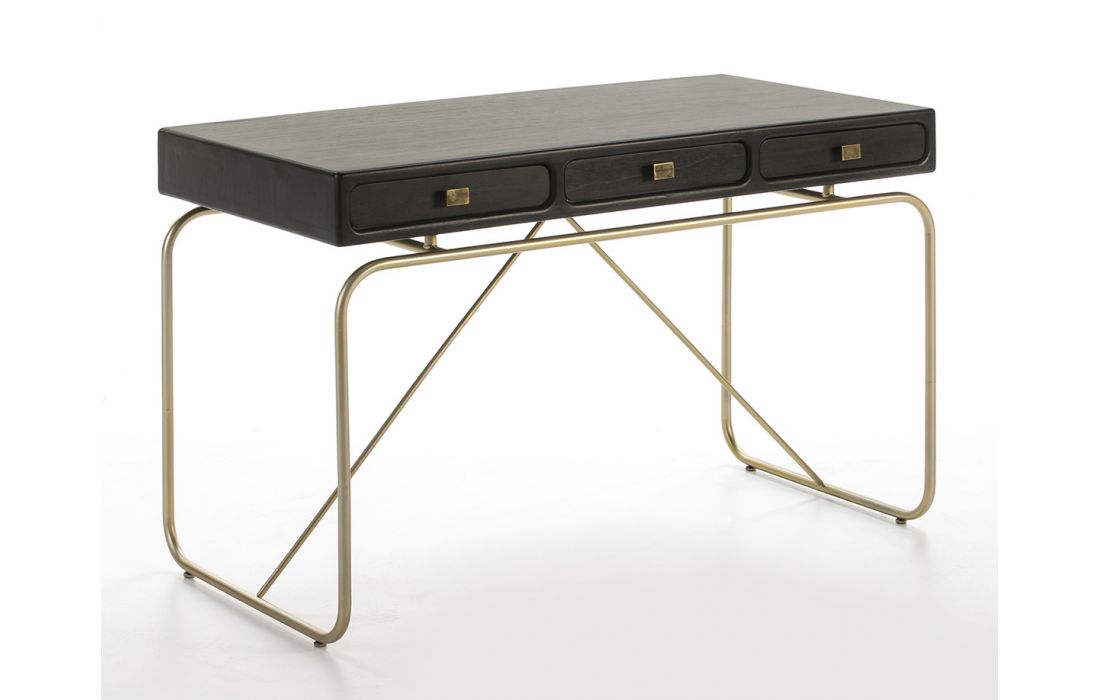 Secretária de 3 gavetas com estrutura em metal dourado e tampo de madeira cor preta.
