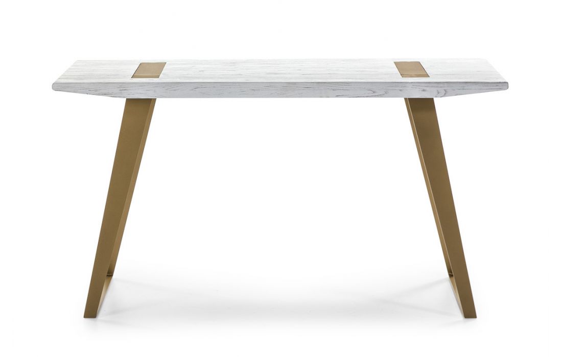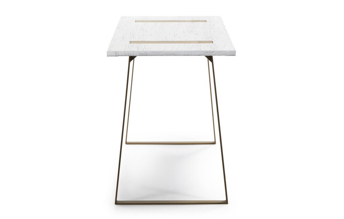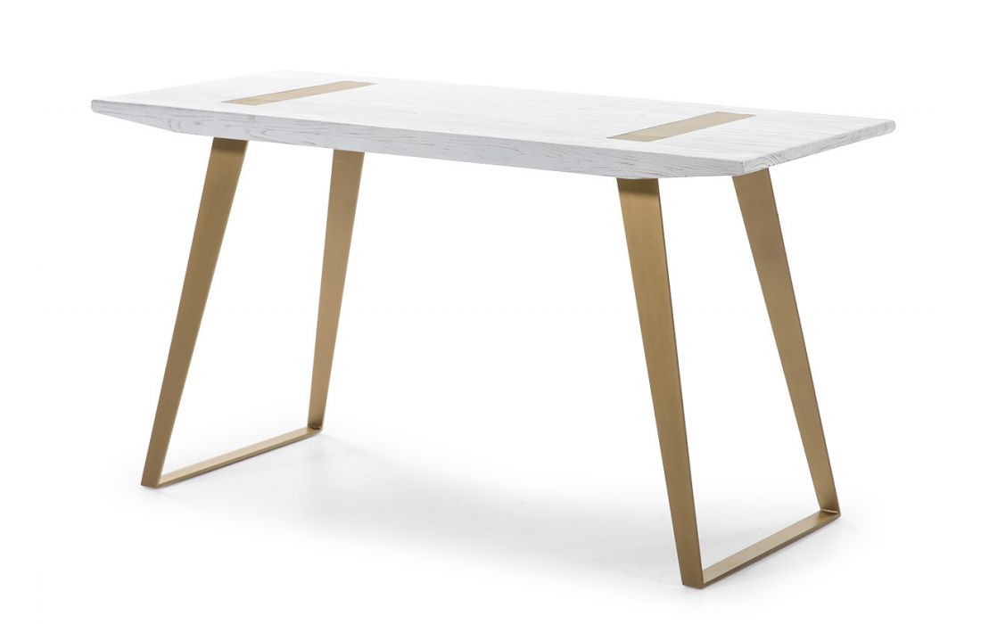 Secretária com estrutura em metal dourado e tampo de madeira cor branca.