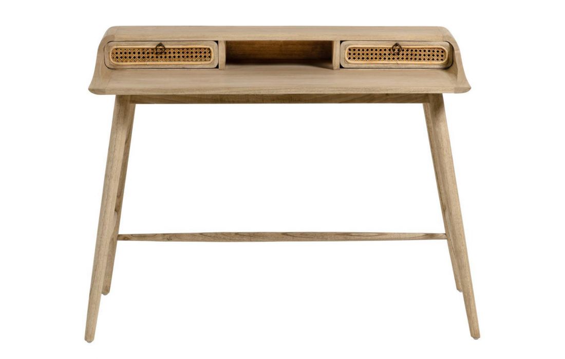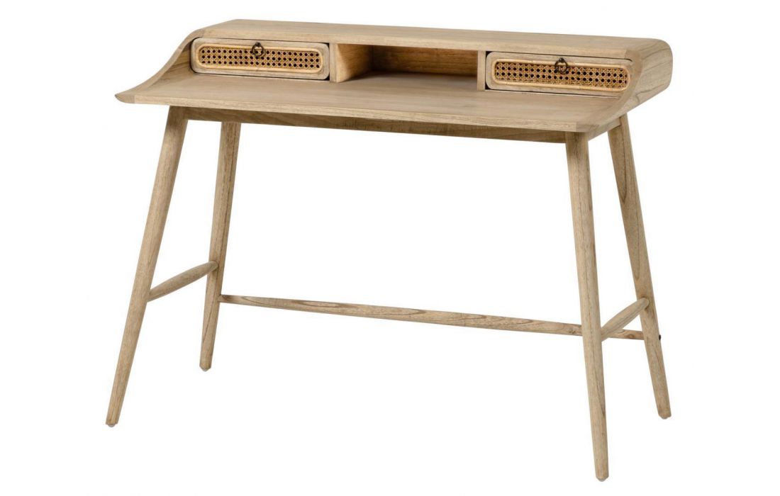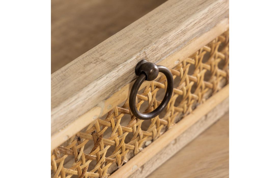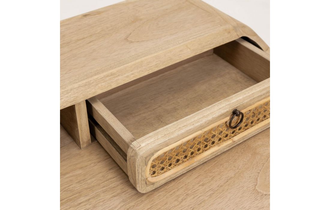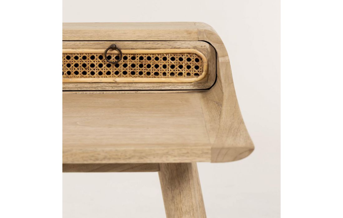 Secretária em madeira maciça de duas gavetas com frentes em ratan trançado á mão.