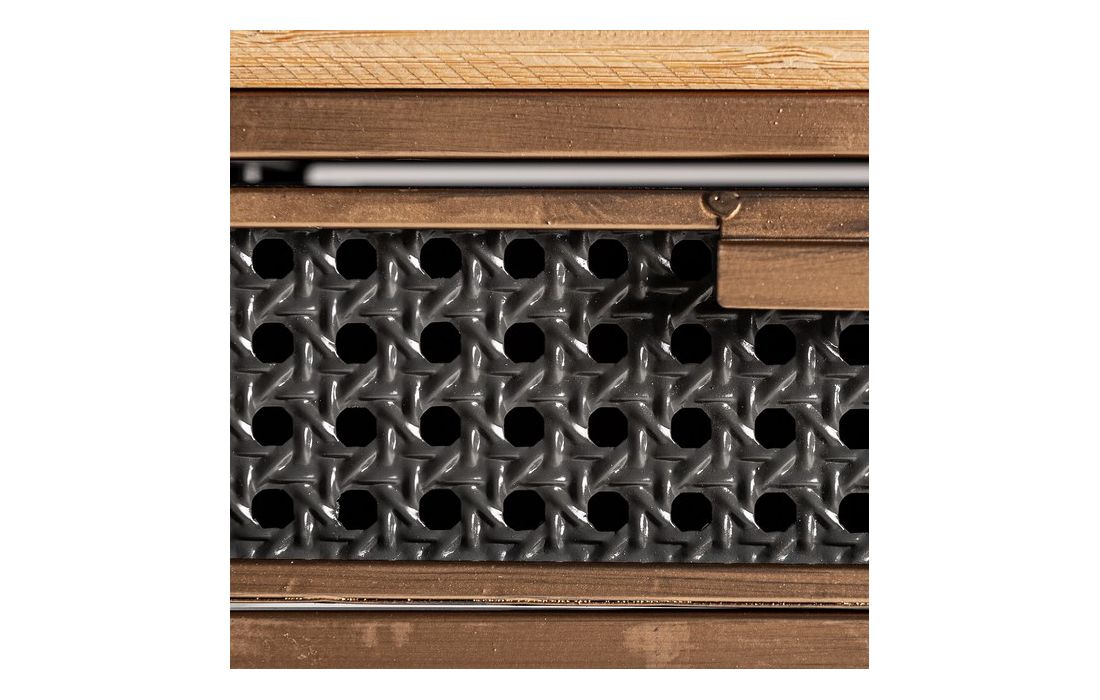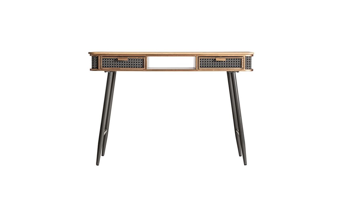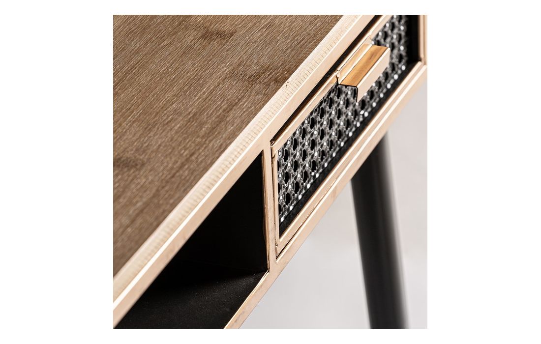 Secretária feita com uma estrutura de ferro em cinzento e dourado com um tampo em bambu na sua cor natural.