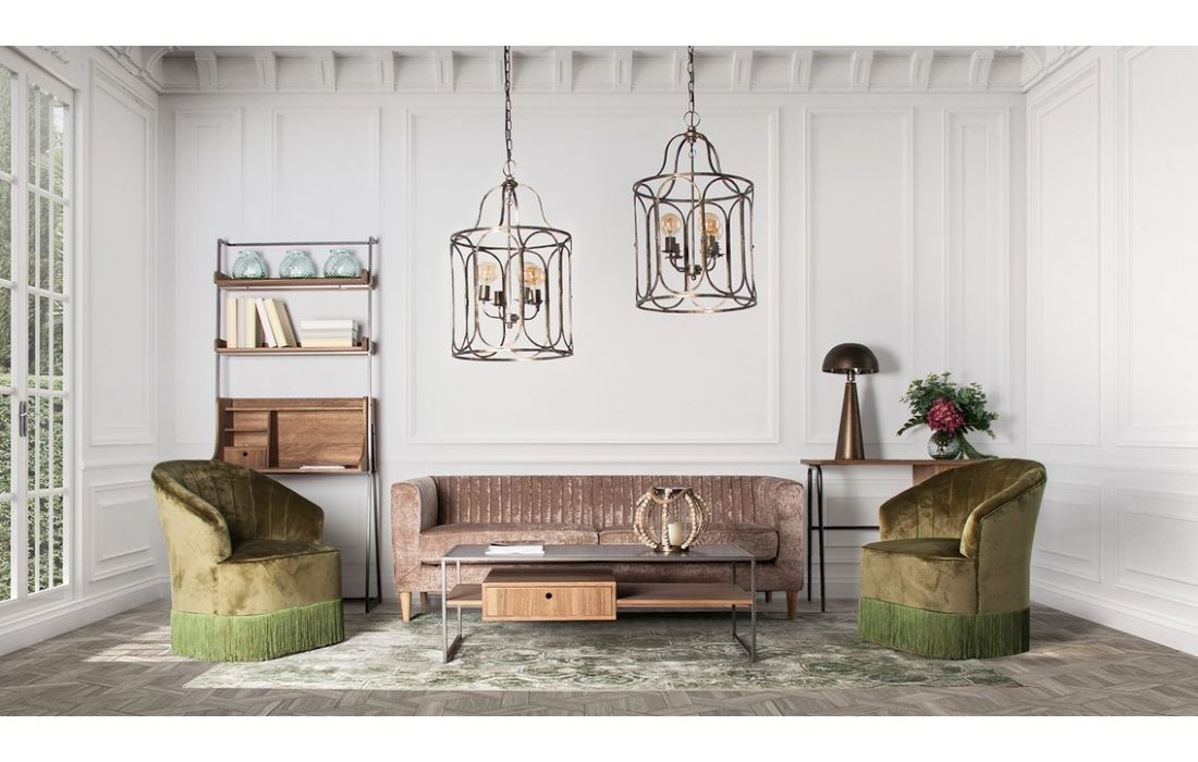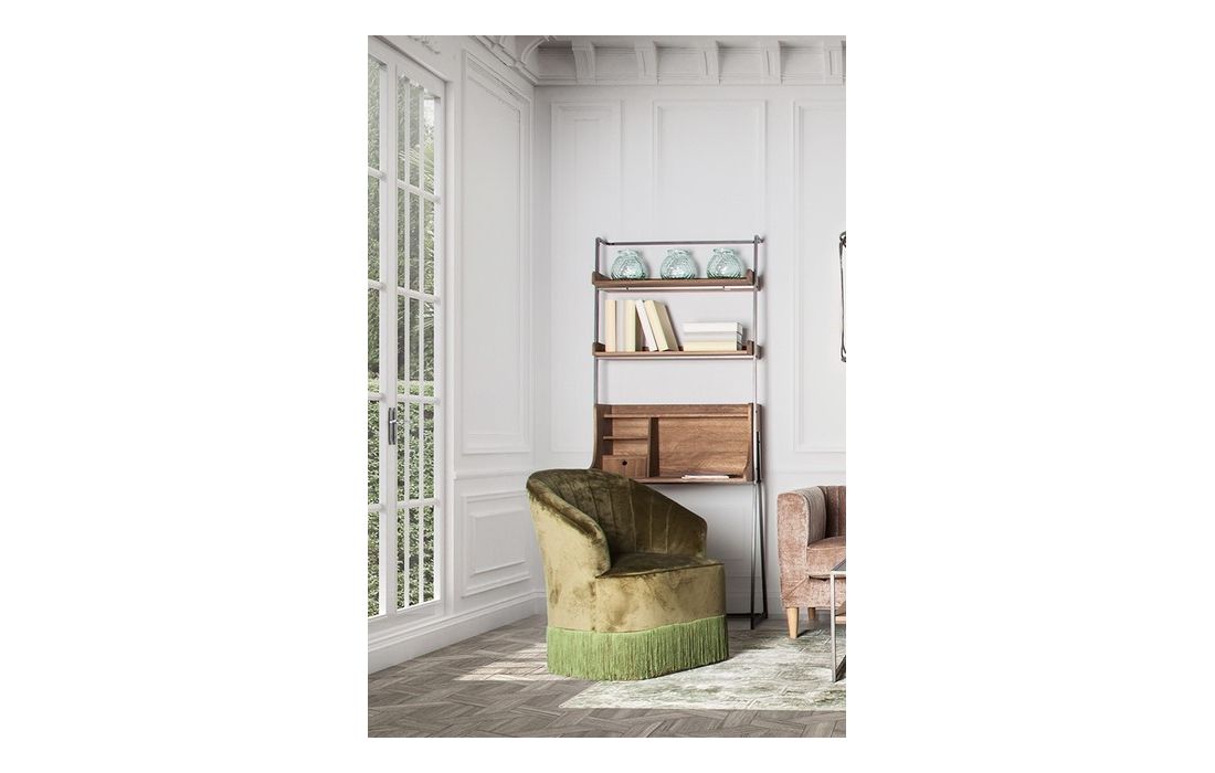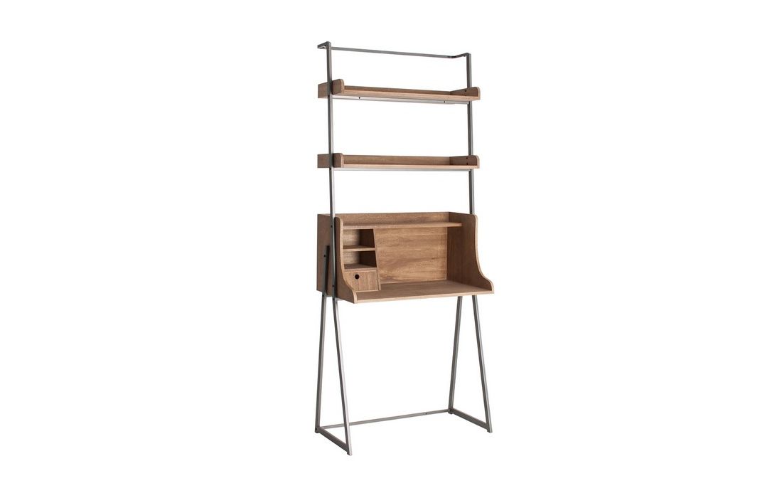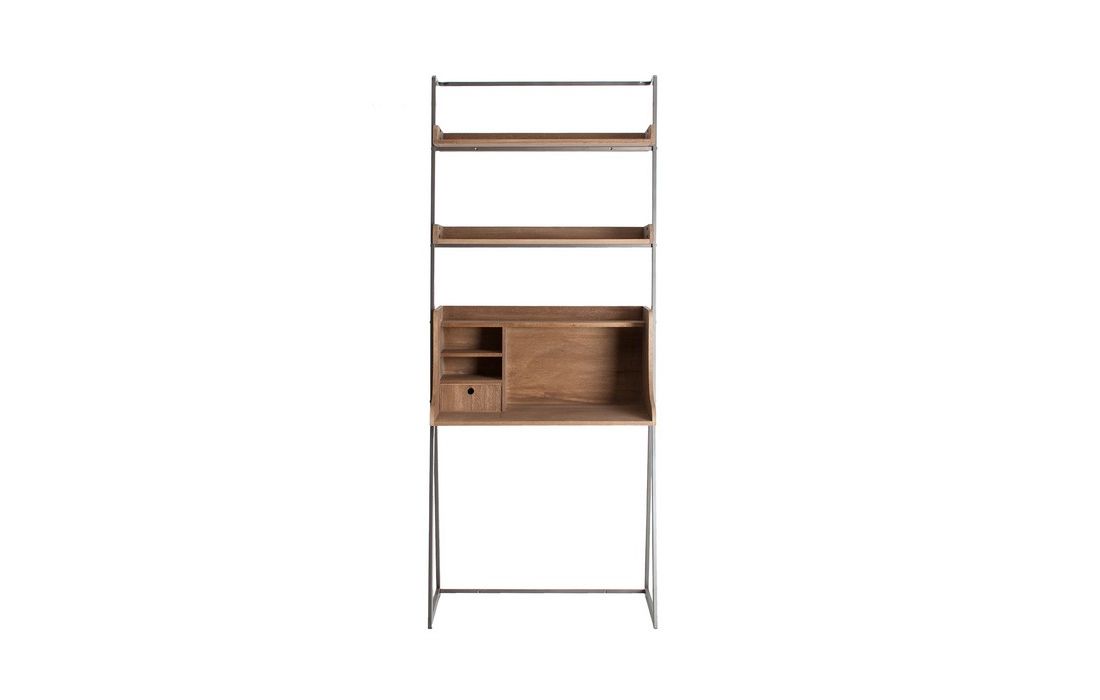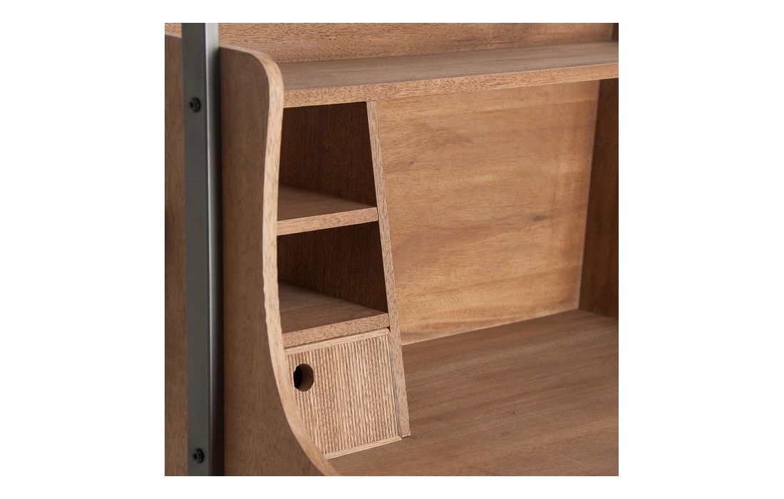 Secretária feita de madeira de abeto e ferro, com gavetas e várias prateleiras.