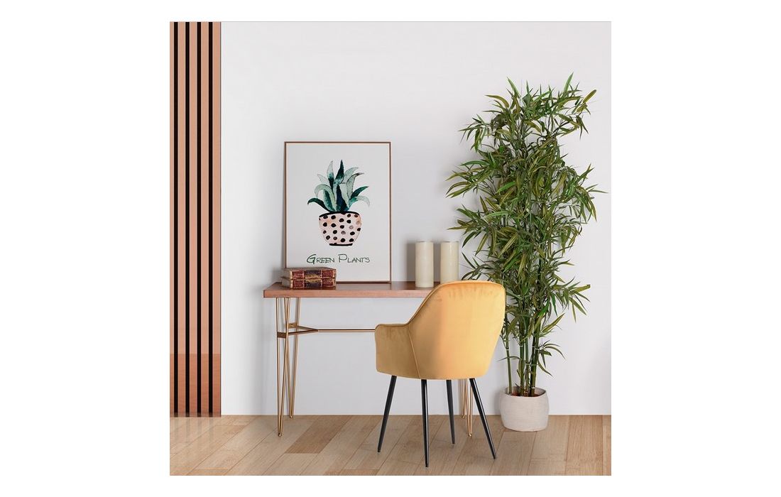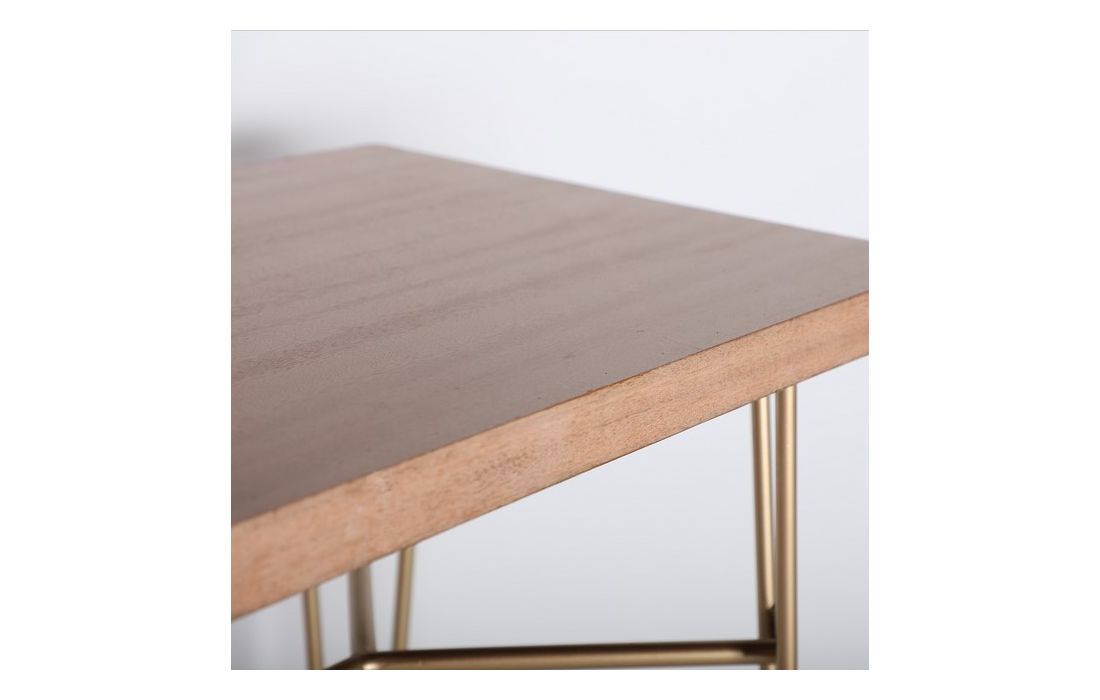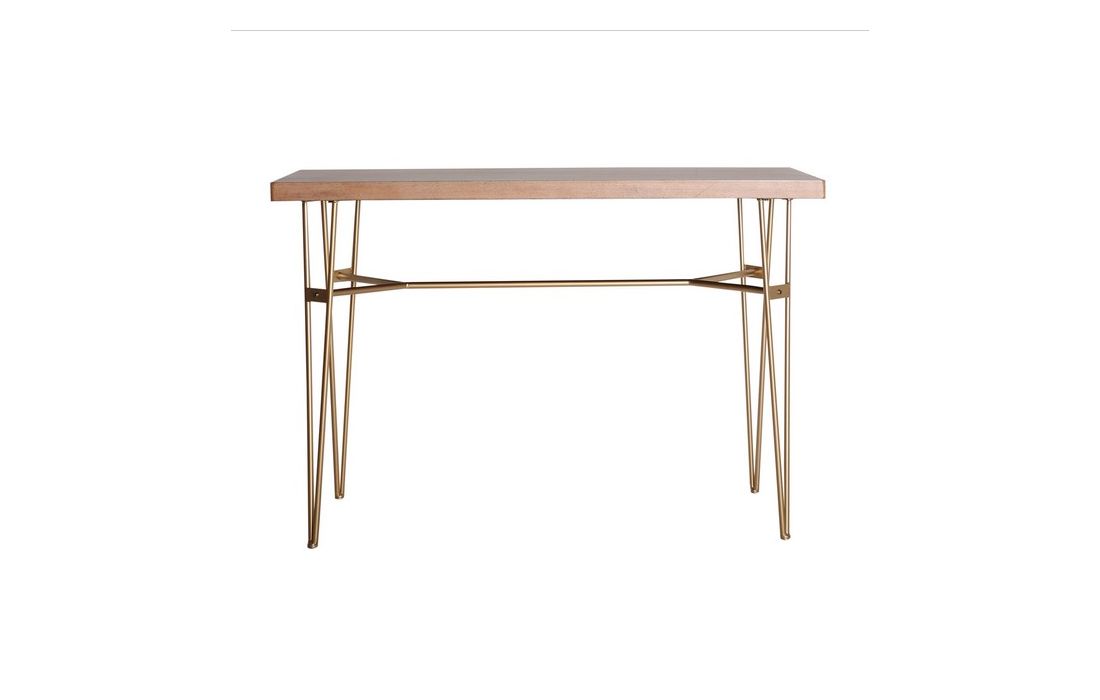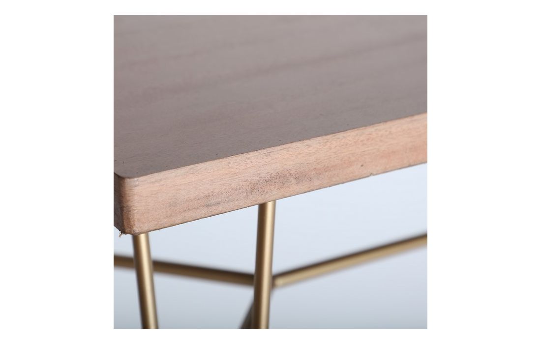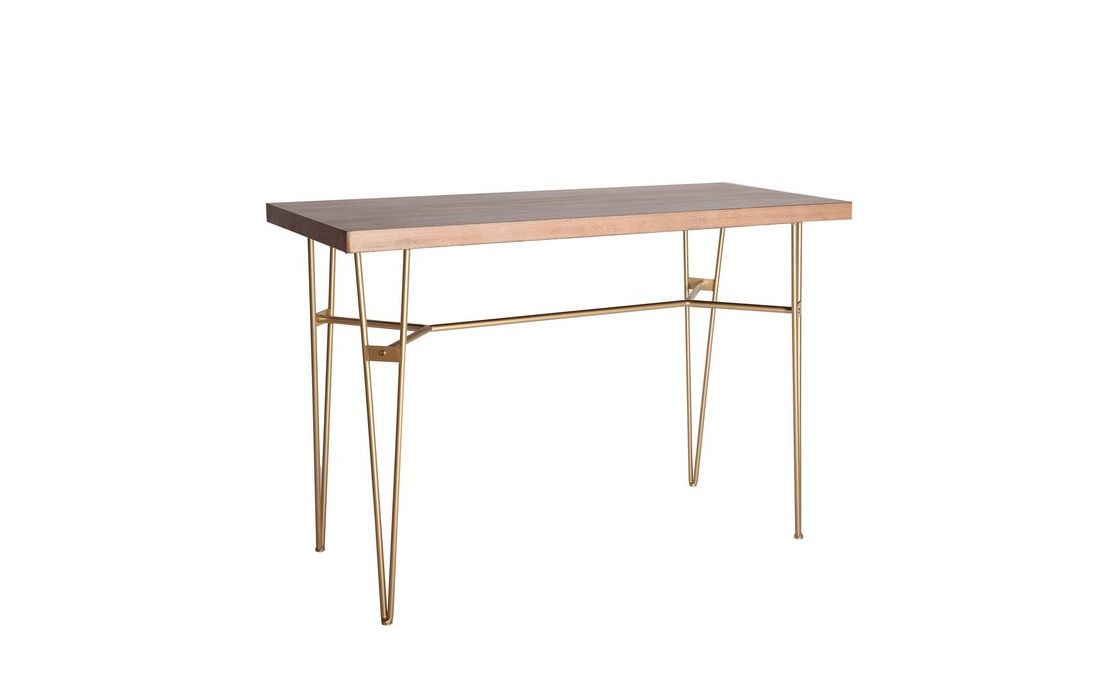 Secretária feita em ferro de cor dourada e um tampo de madeira de abeto de cor natural.
