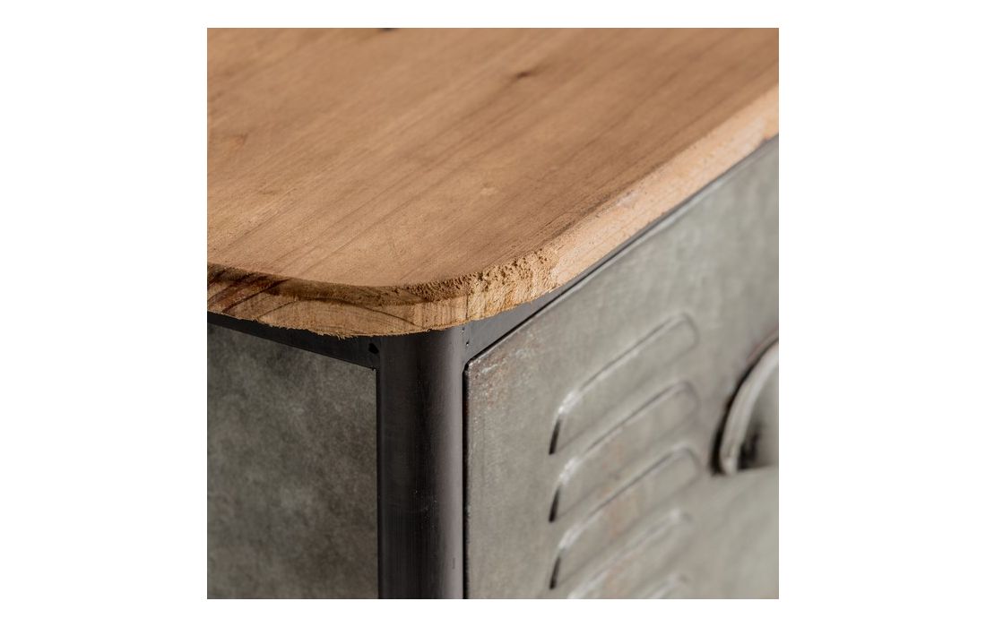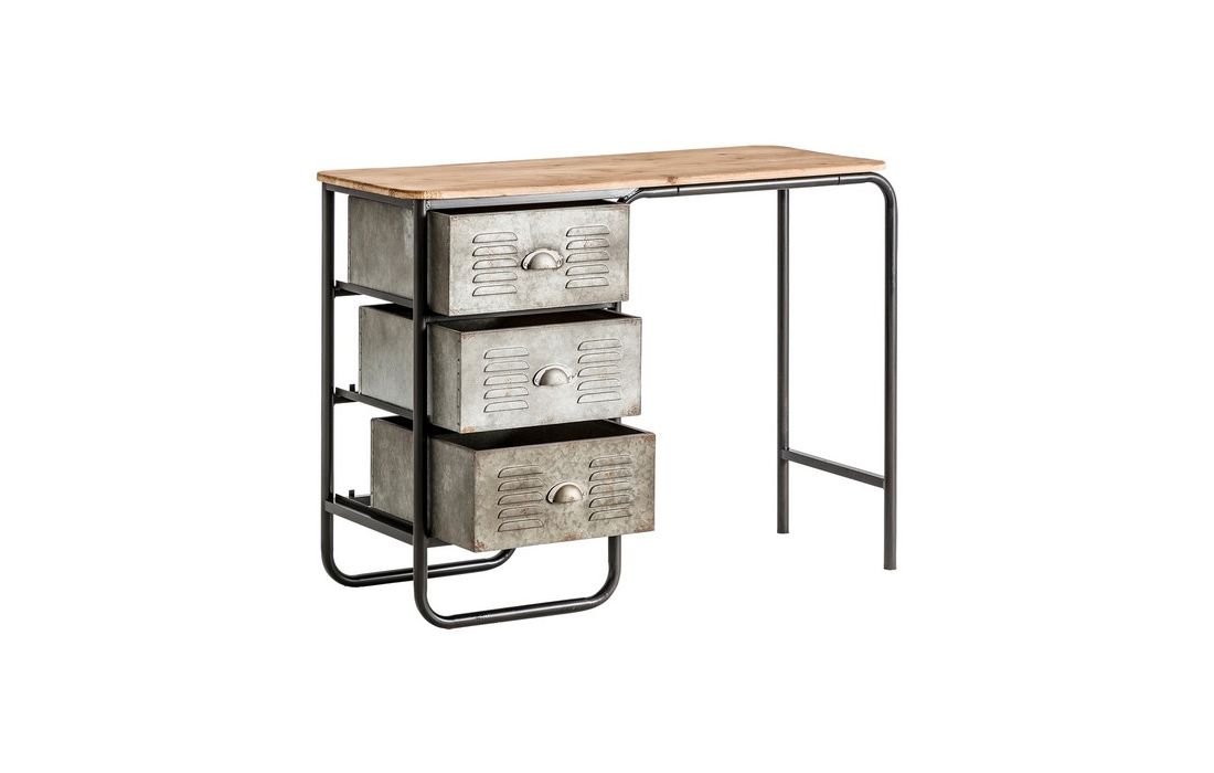 Secretária feita em metal cinzento e tampo em madeira de abeto de cor natural, com 3 gavetas do lado esquerdo de 36x39x17cm
