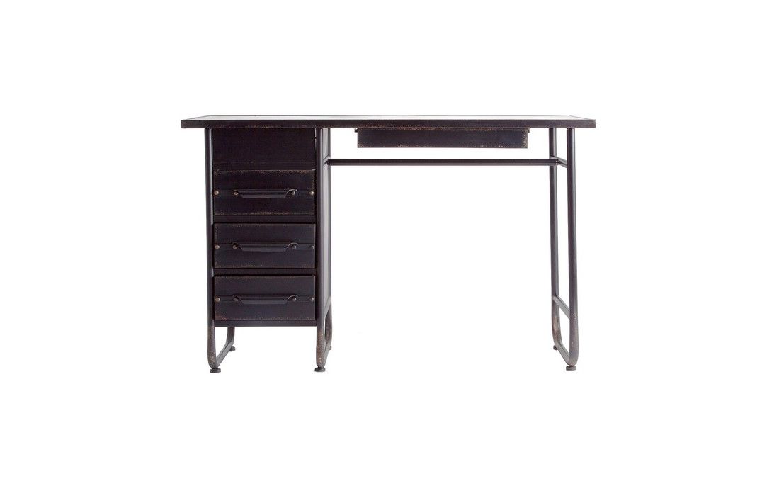 Secretária feita com uma estrutura metálica preta que comporta três gavetas e um orifício à esquerda.