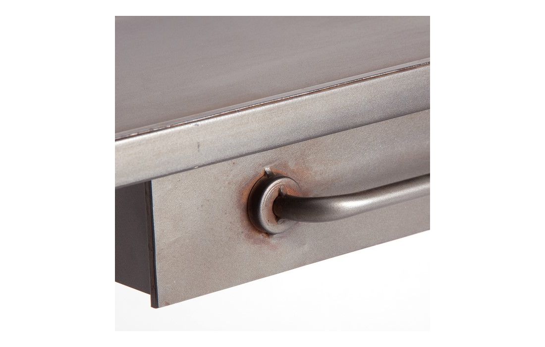 Secretária feita com uma estrutura metálica preta que contém uma pequena gaveta no centro.