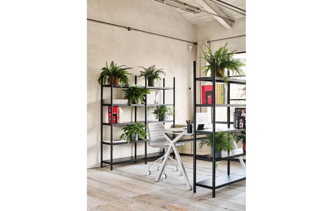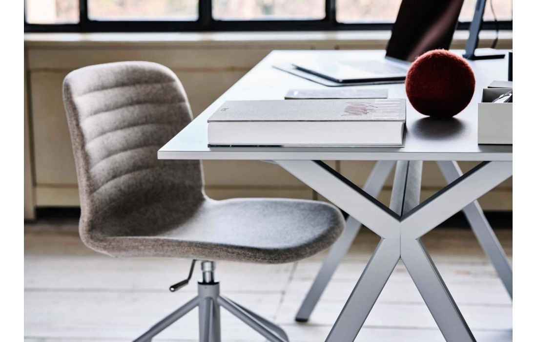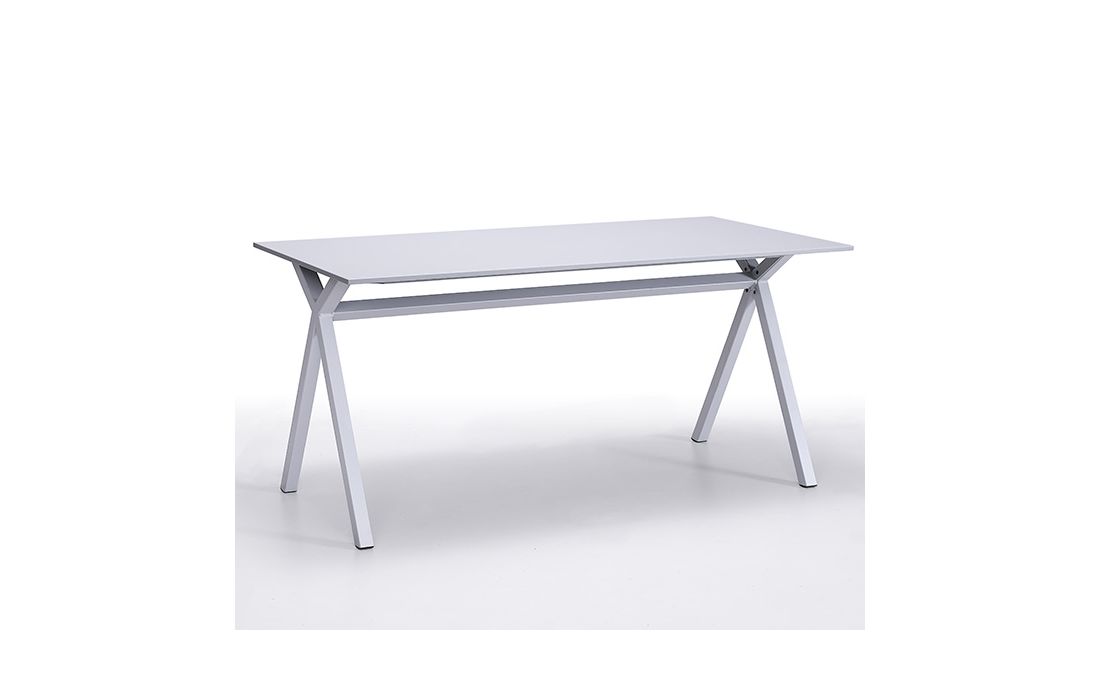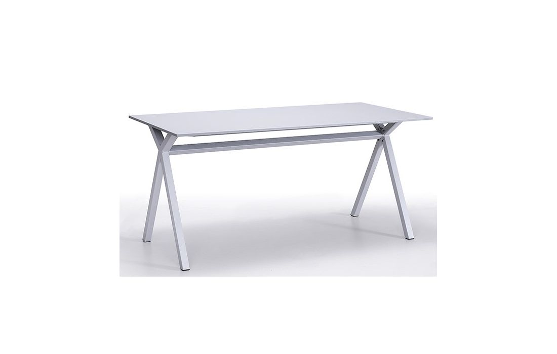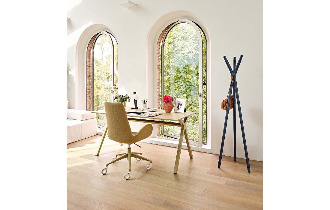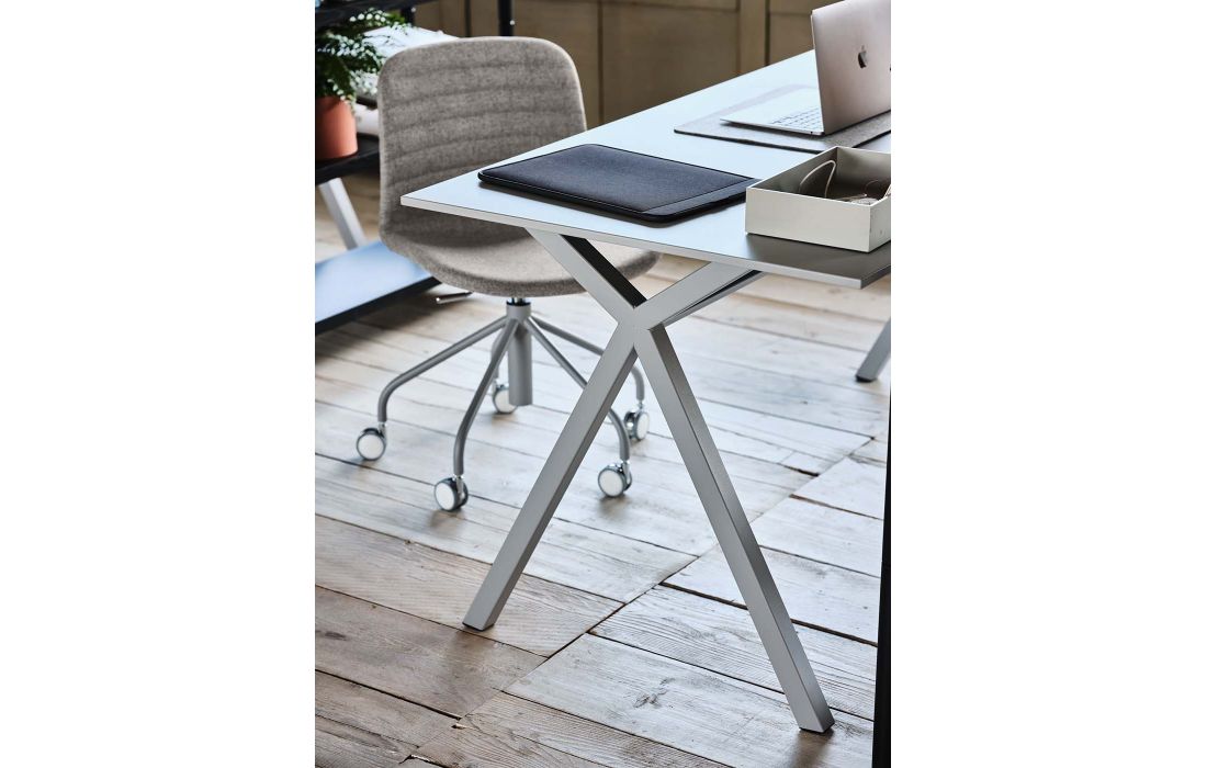 Secretária com pés e estrutura em aço lacado. Tampo retangular disponível em metal ou madeira folheada.