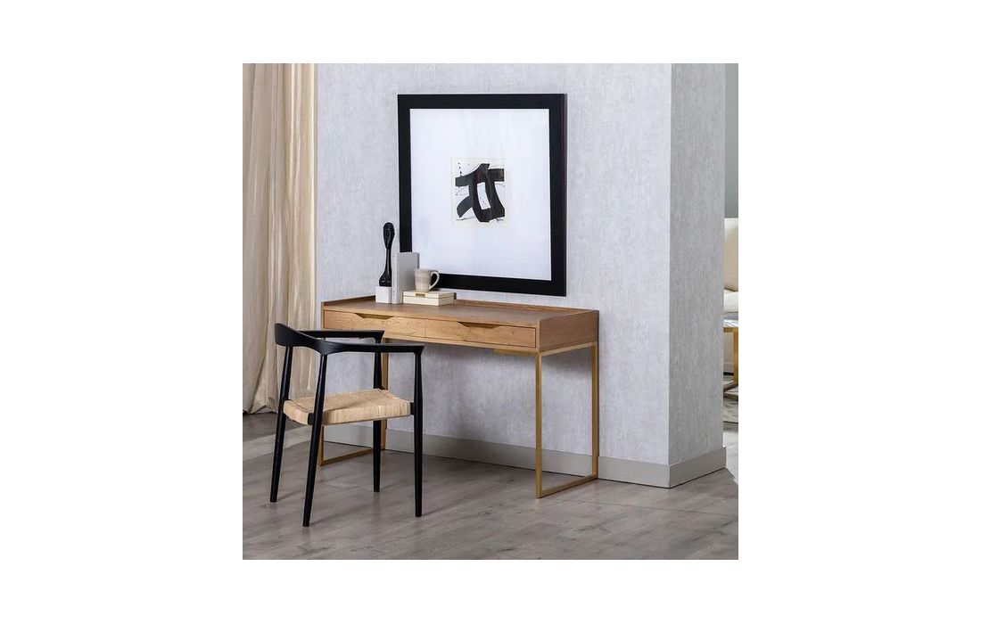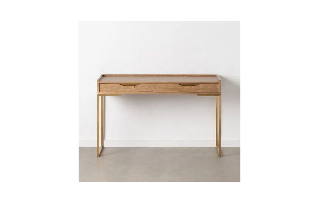 Secretária com 2 gavetas, pés em ferro dourado e madeira cor natural