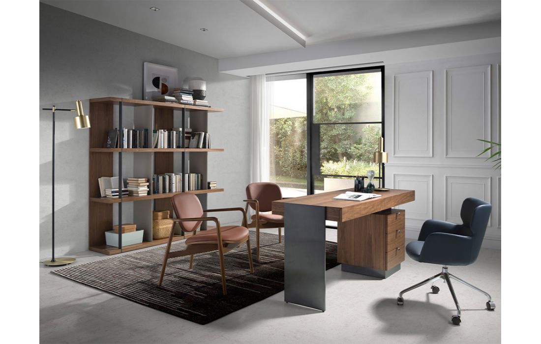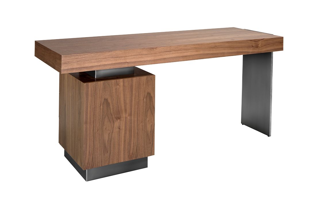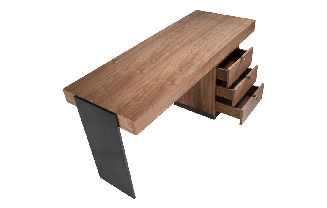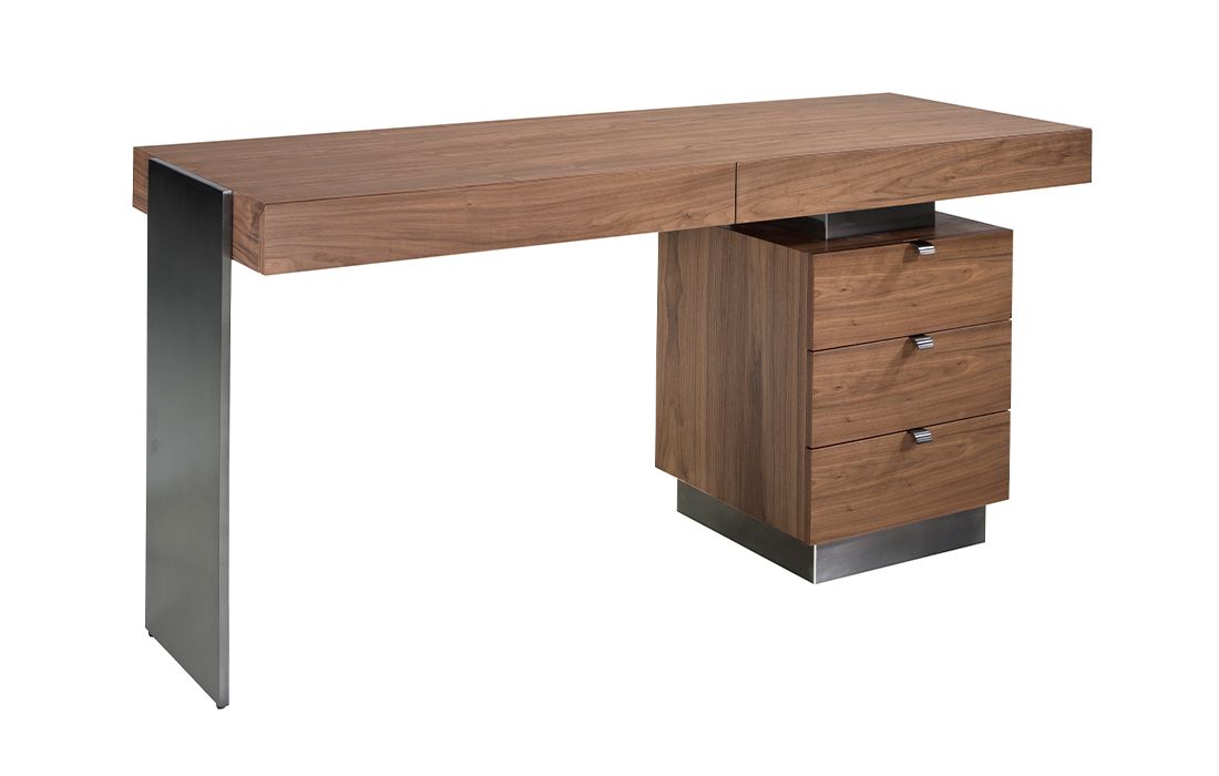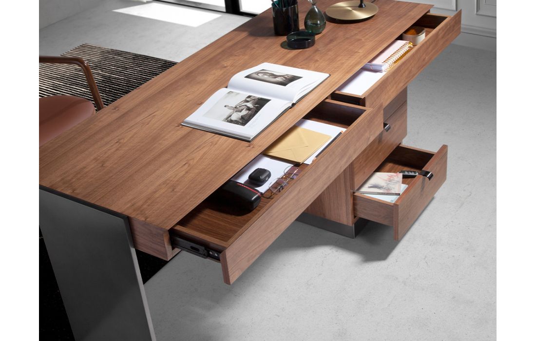Secretária com 5 gavetas, tampo e gavetas folheada a nogueira e estrutura das pernas e detalhes em aço inoxidável maciço polido