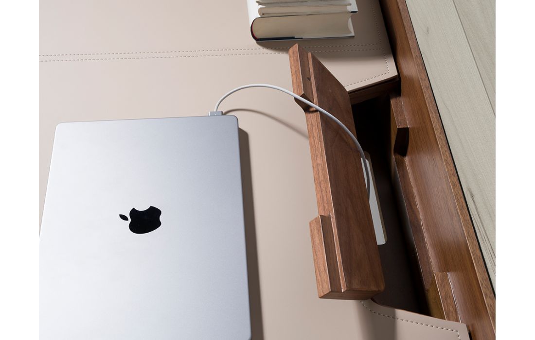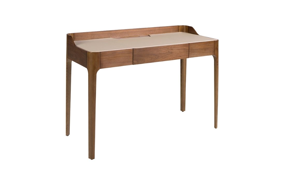 Secretaria em madeira natural folheada a nogueira com estofo em couro sintético de cor creme.
