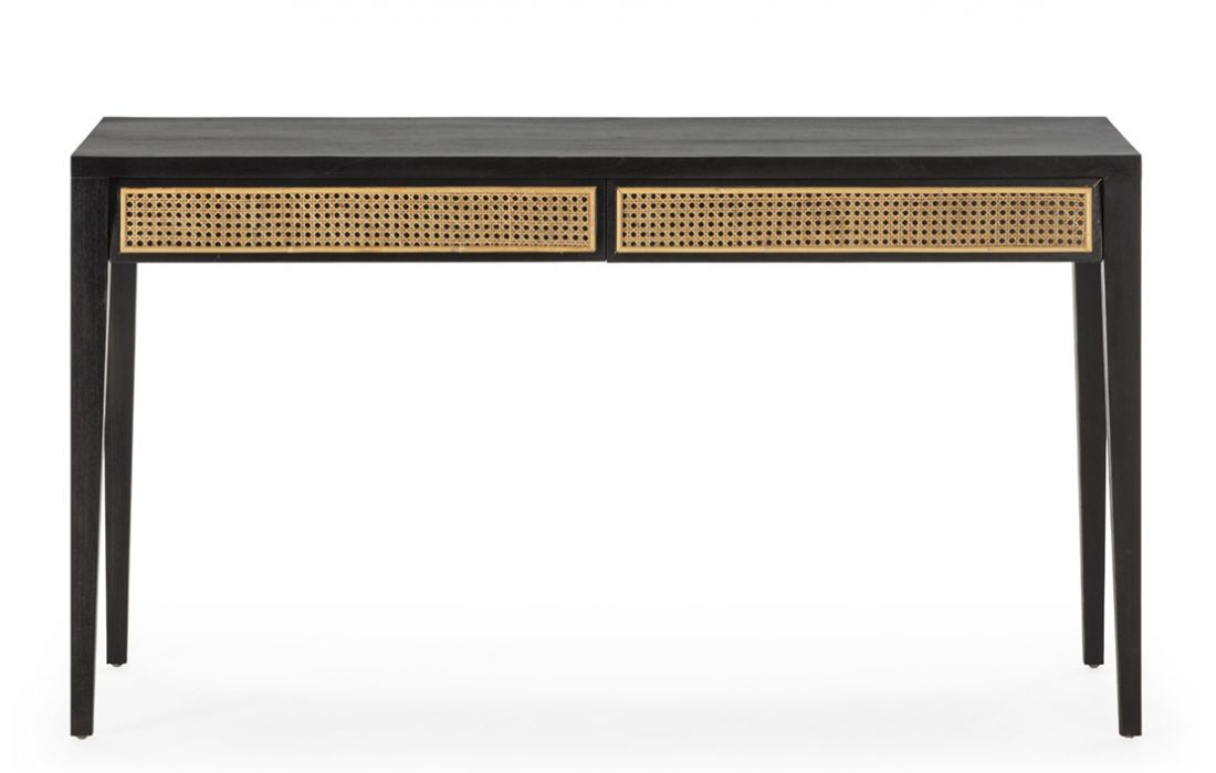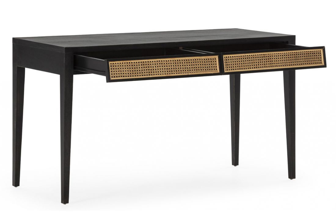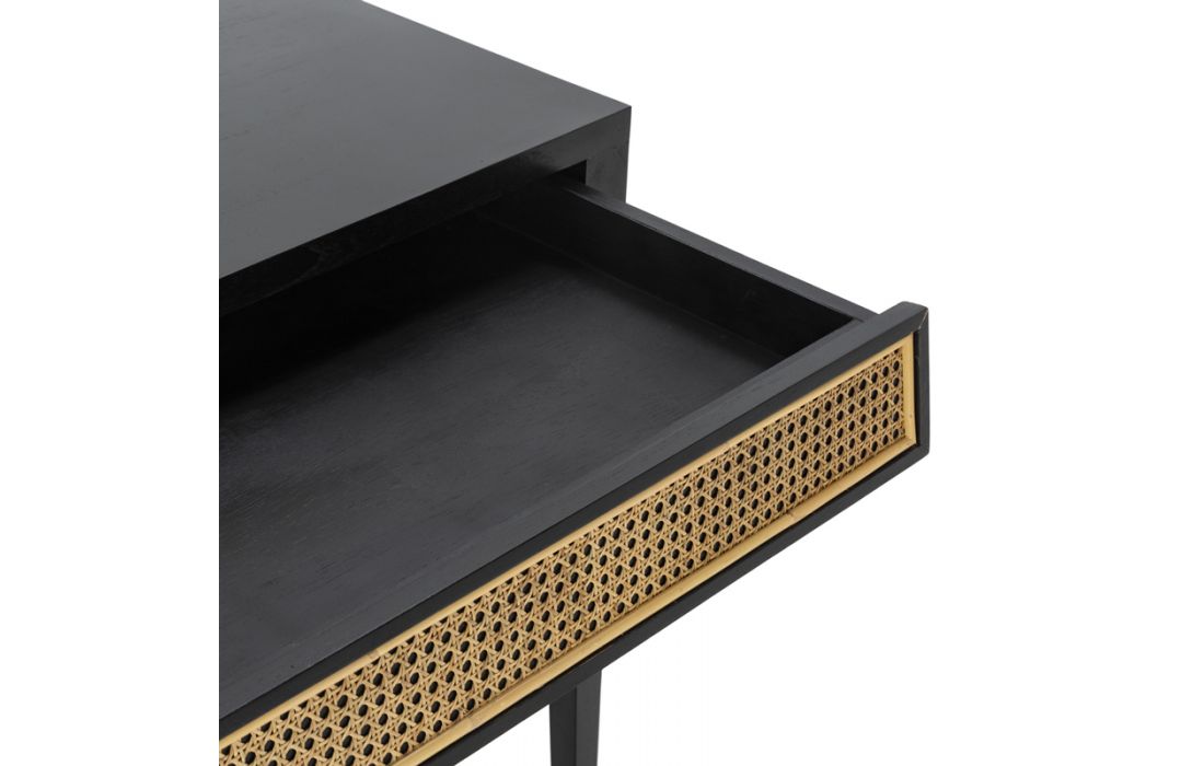 Secretaria de 2 gavetas em madeira de cedro cor preta com frente das gavetas em palhinha natural