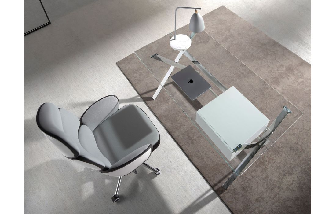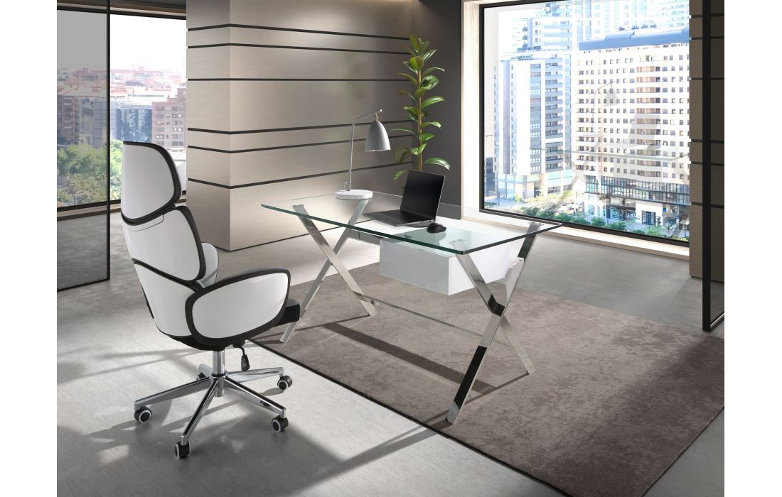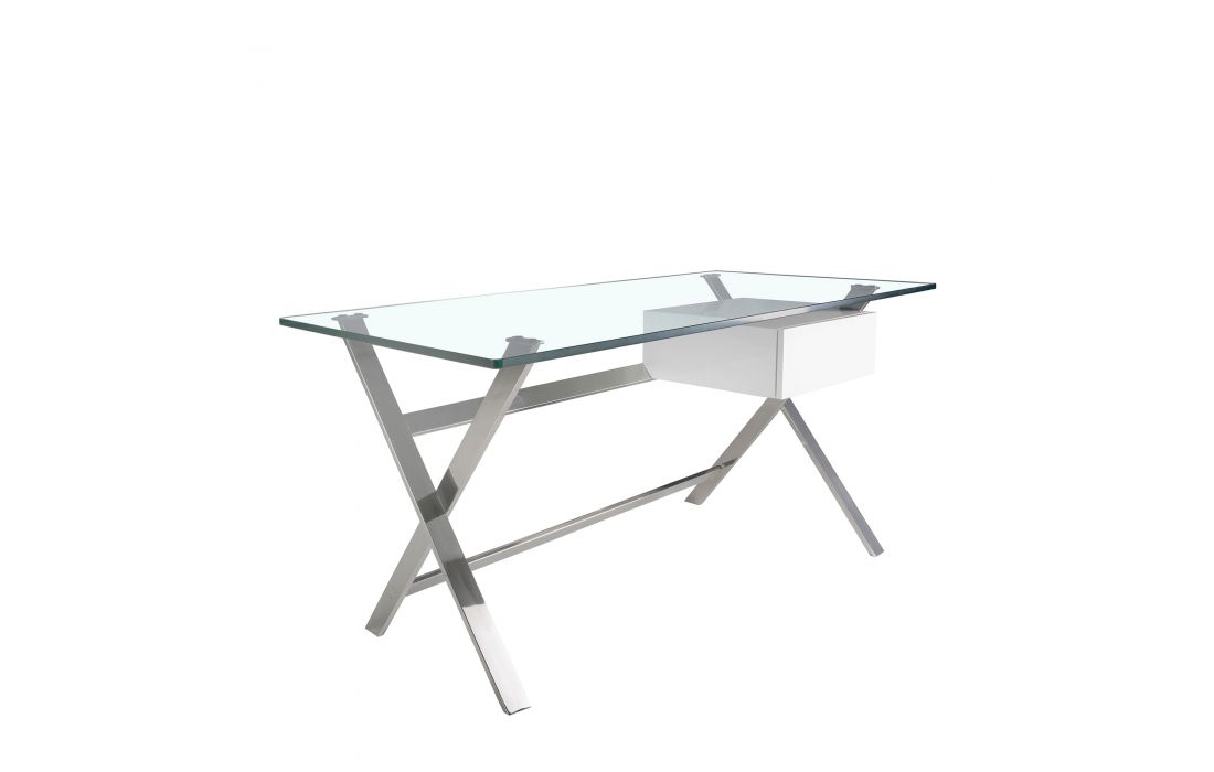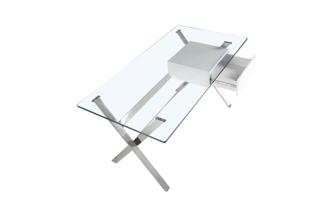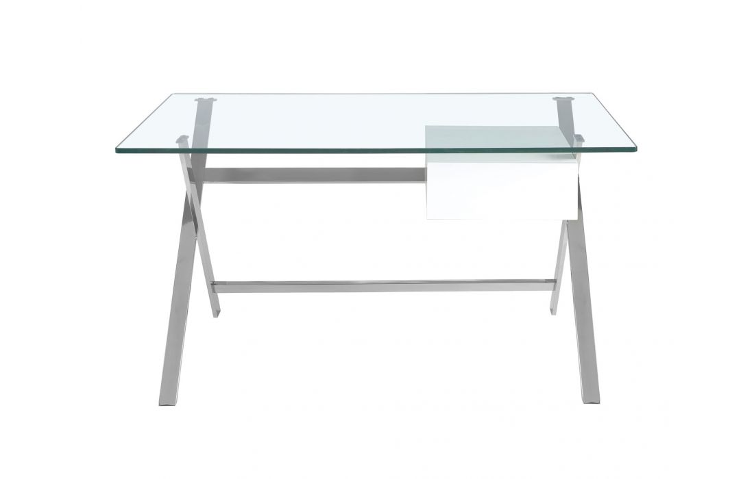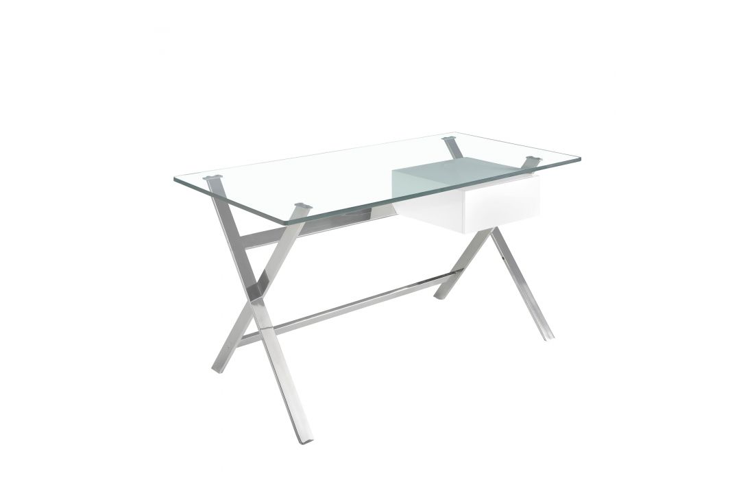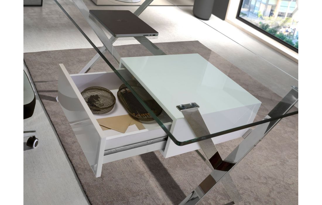 Mesa de design moderno com tampo de vidro temperado e estrutura em madeira MDF branca, pés em aço inoxidável cromado. Amplo espaço de arrumação com 1 gaveta com sistema de abertura e fecho de puxar os dedos.