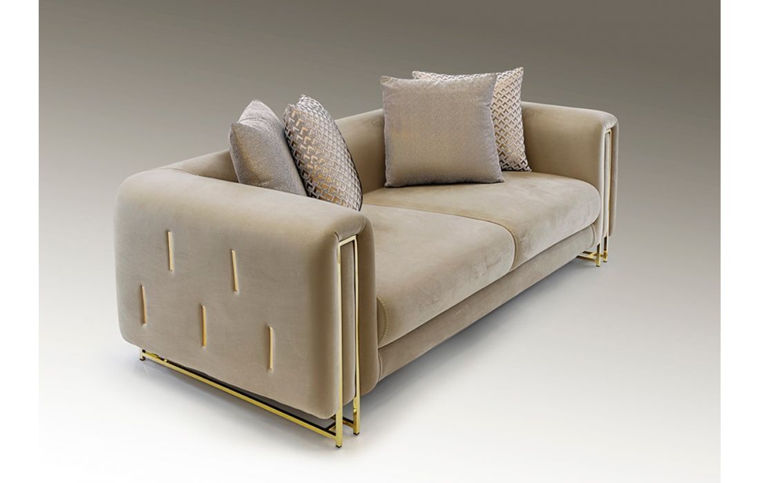 Sofá em madeira de faia estofado em veludo, pernas de metal com acabamento na cor dourado