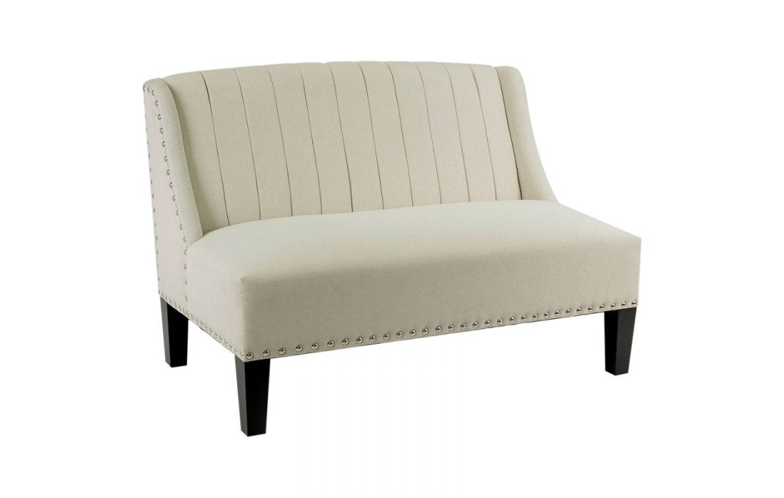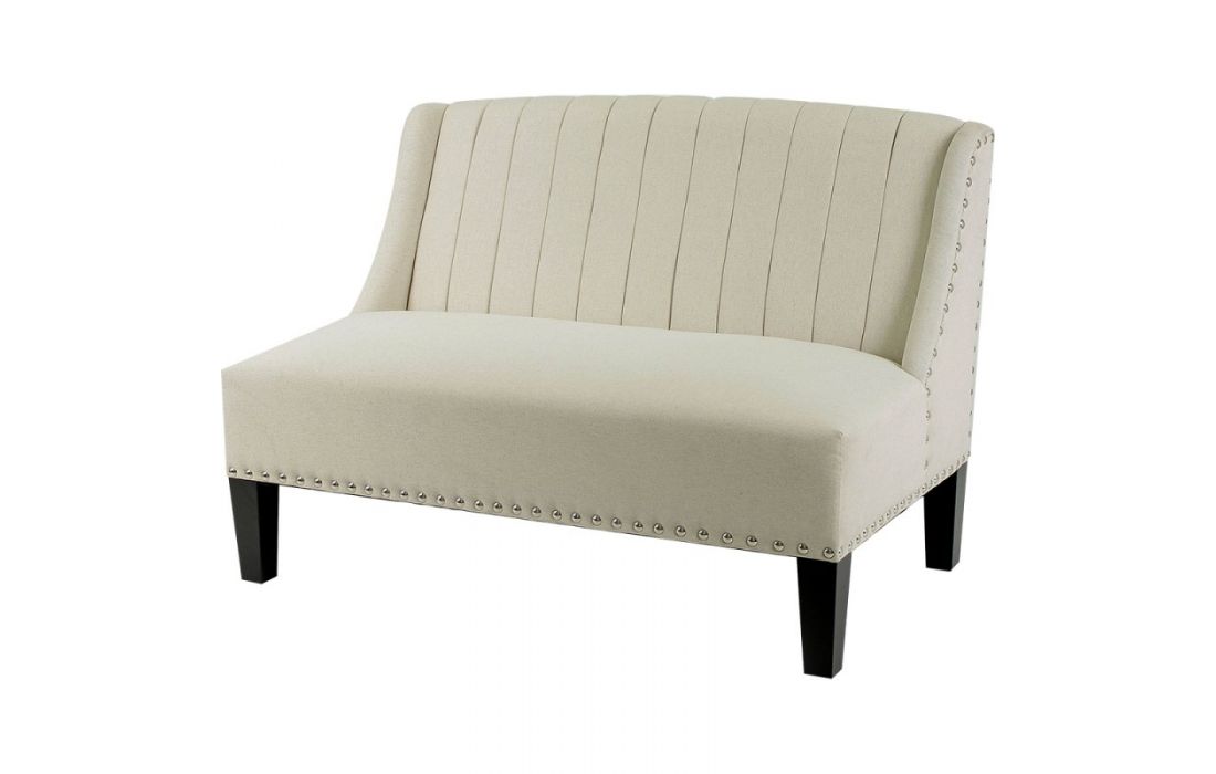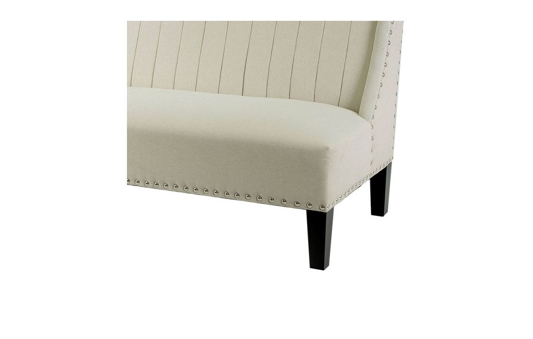 Sofá revestido em tecido com pés em madeira.
