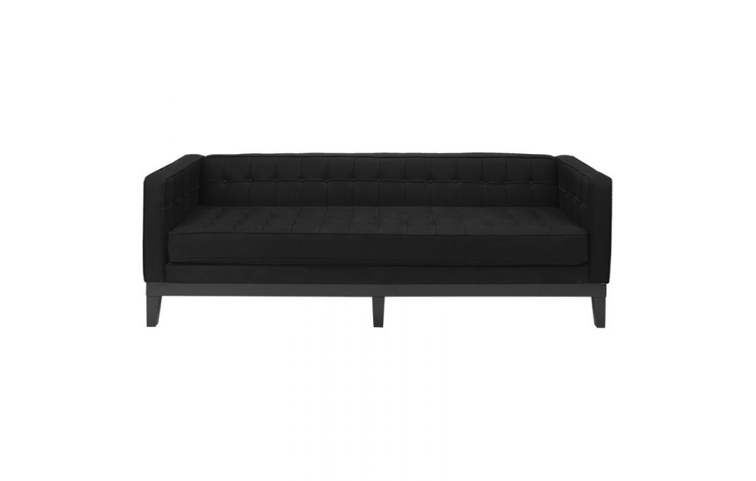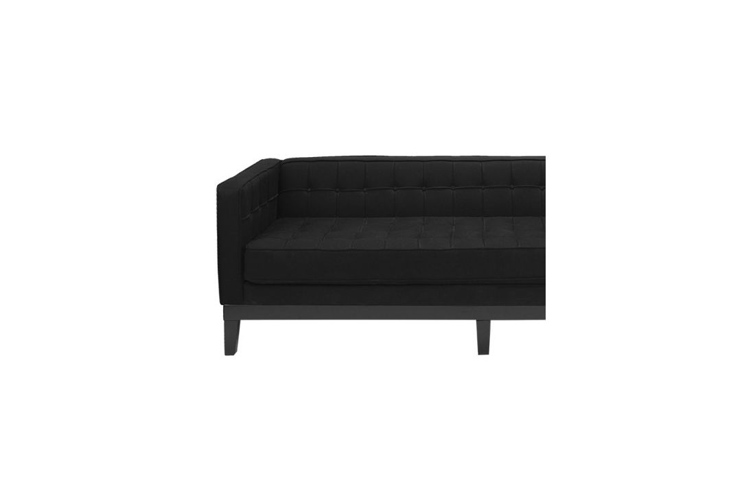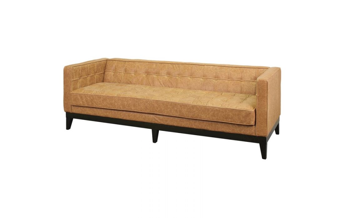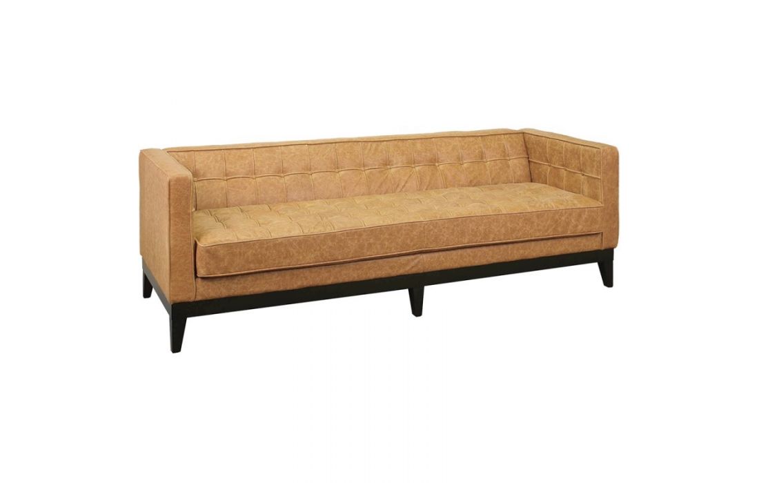 Sofá revestido em tecido ou couro e estrutura em madeira.