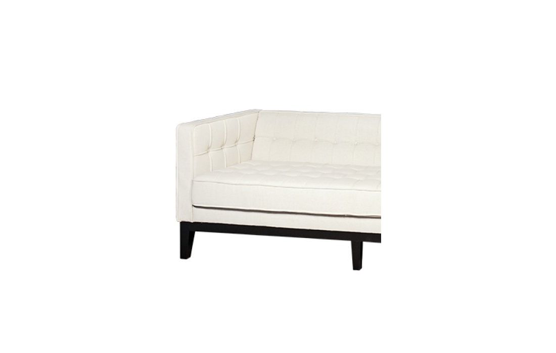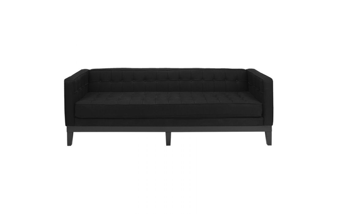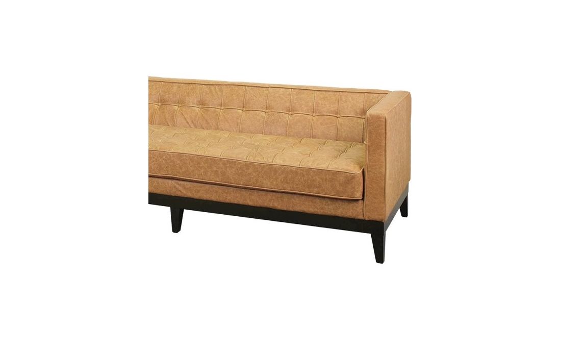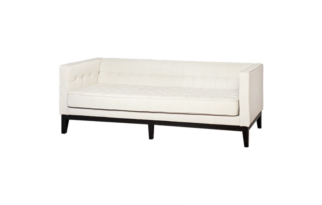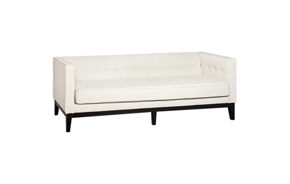 Sofá revestido em tecido ou couro e estrutura em madeira.