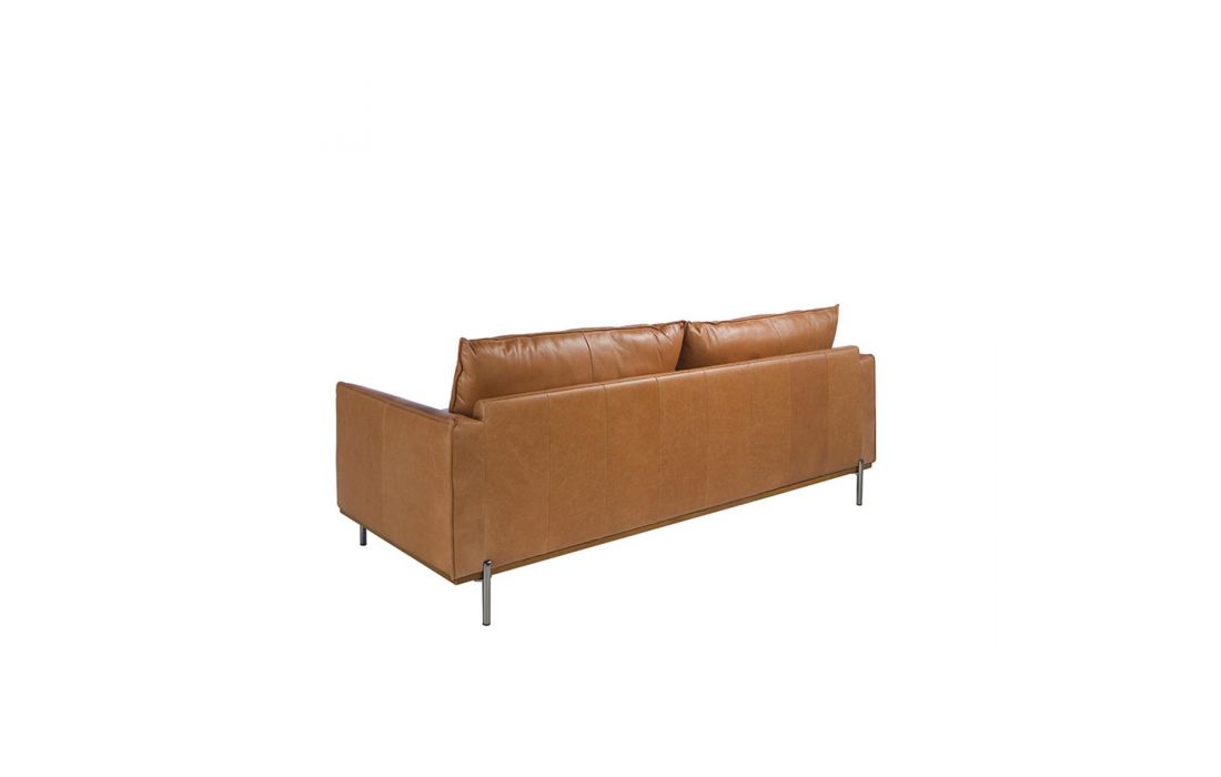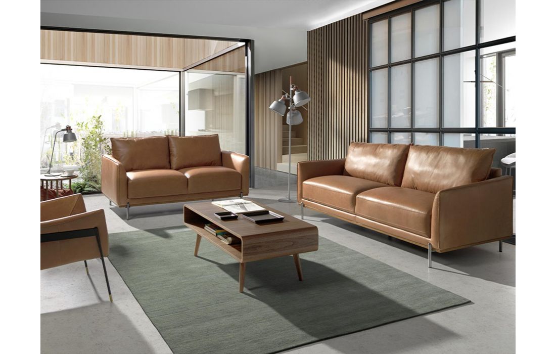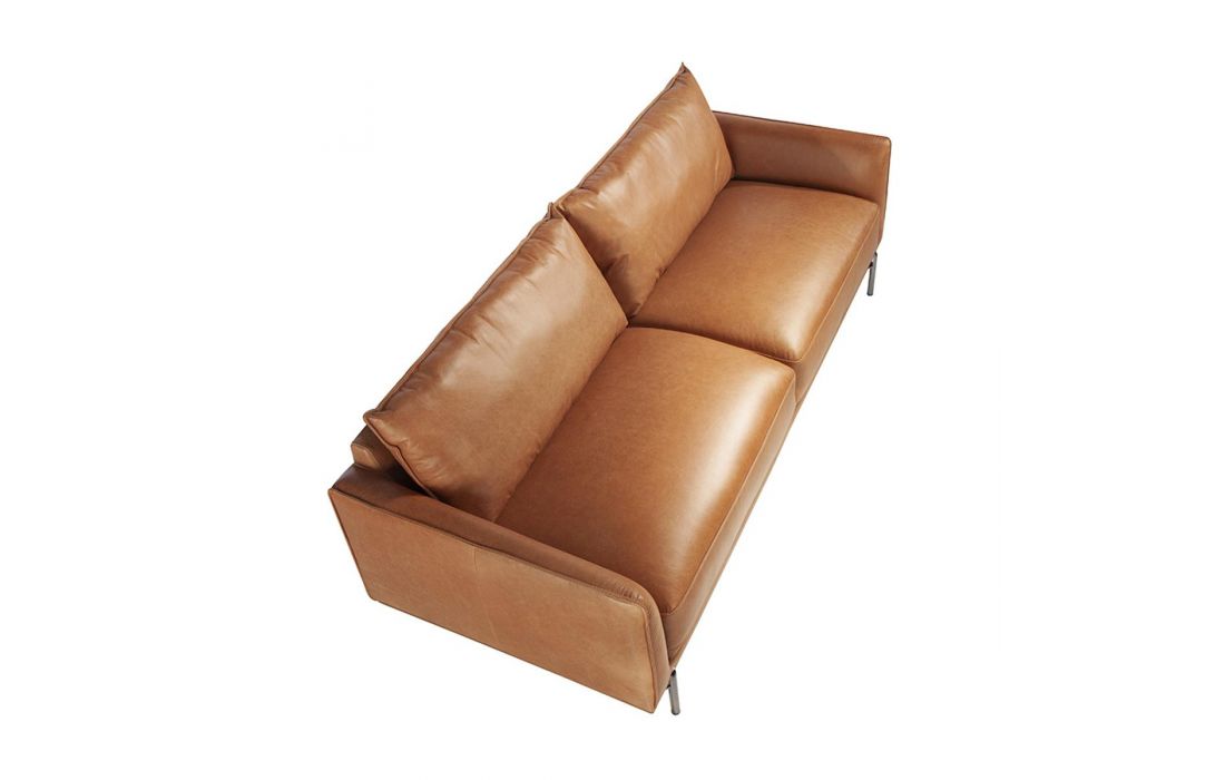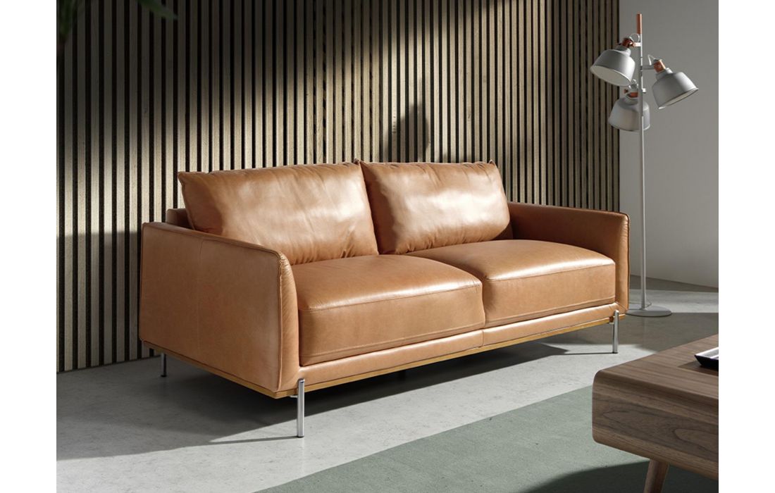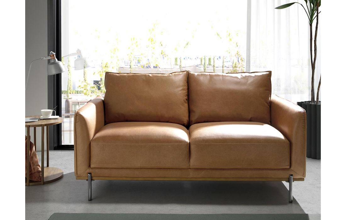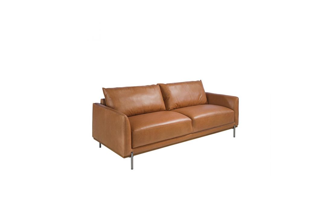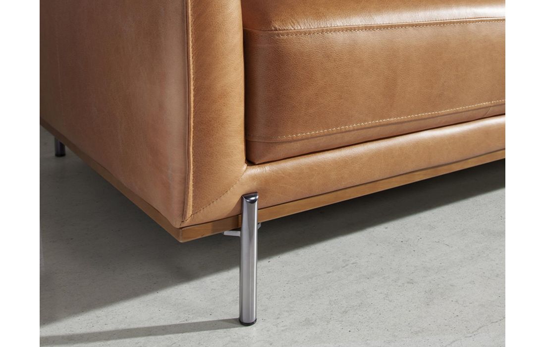 Sofá de design moderno estofado em pele de bovino com acabamento em madeira de faia vaporizada na cor de nogueira e pernas em aço inoxidável escurecidoDestinatário :