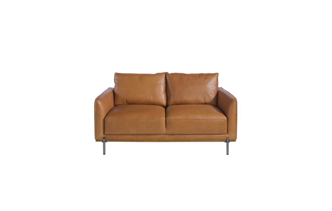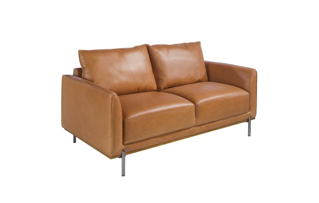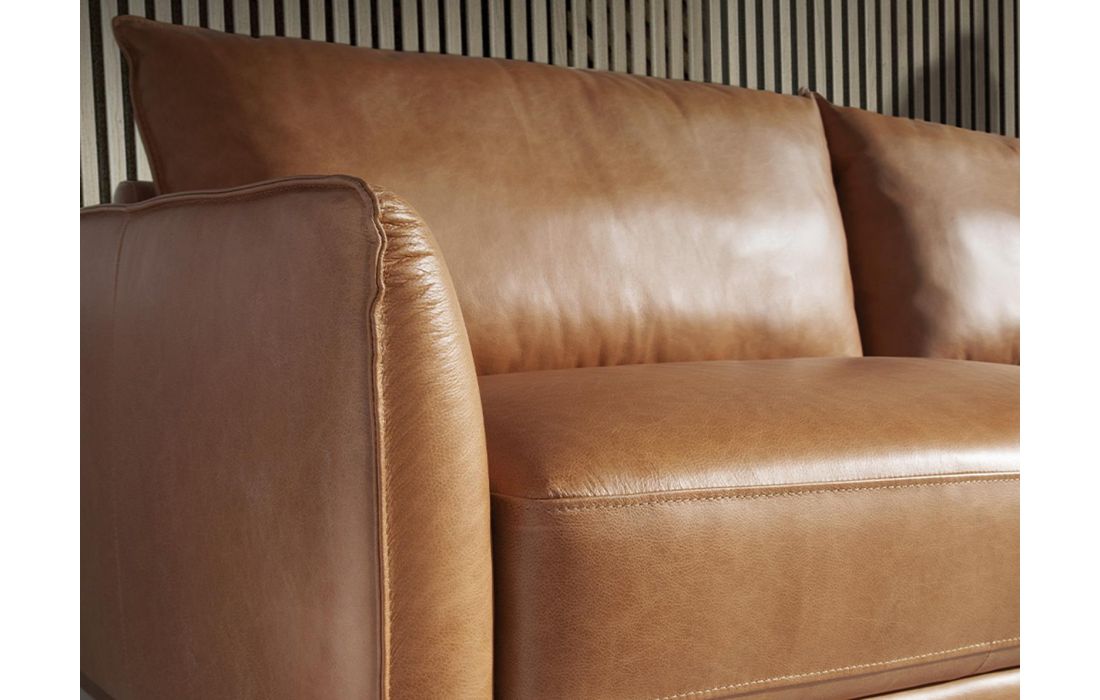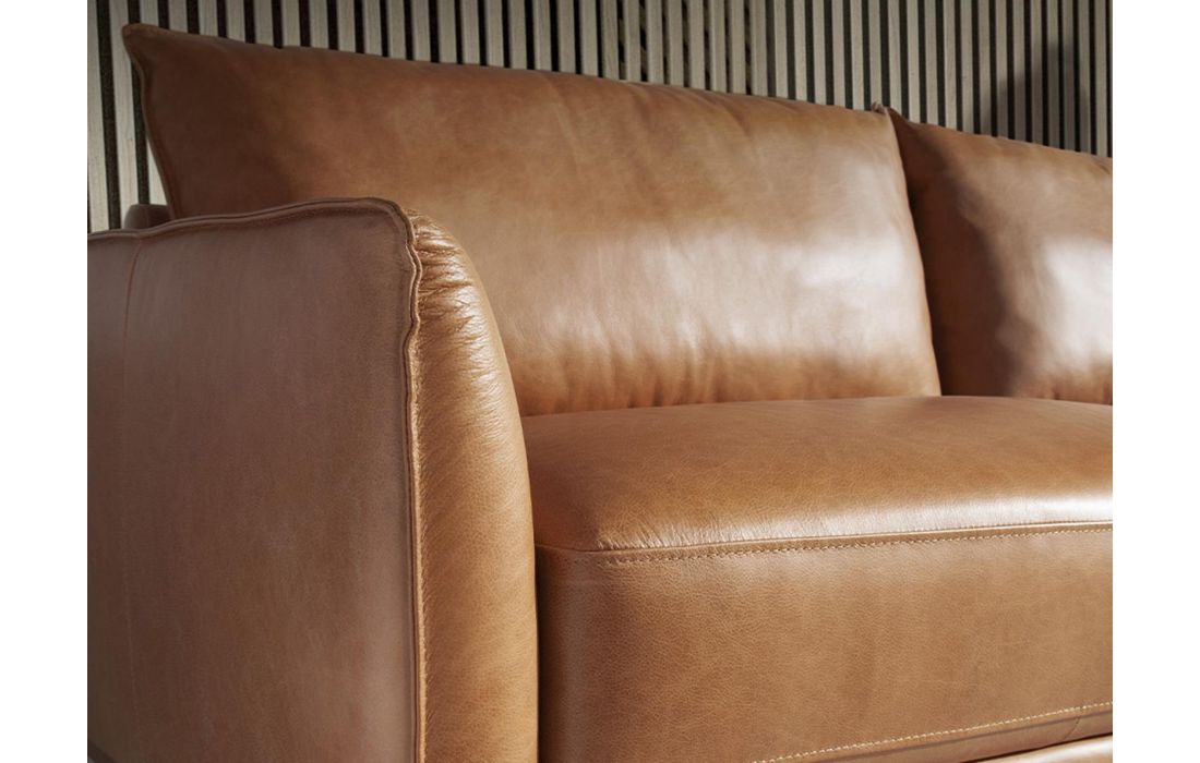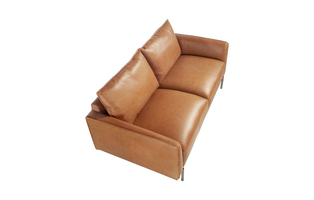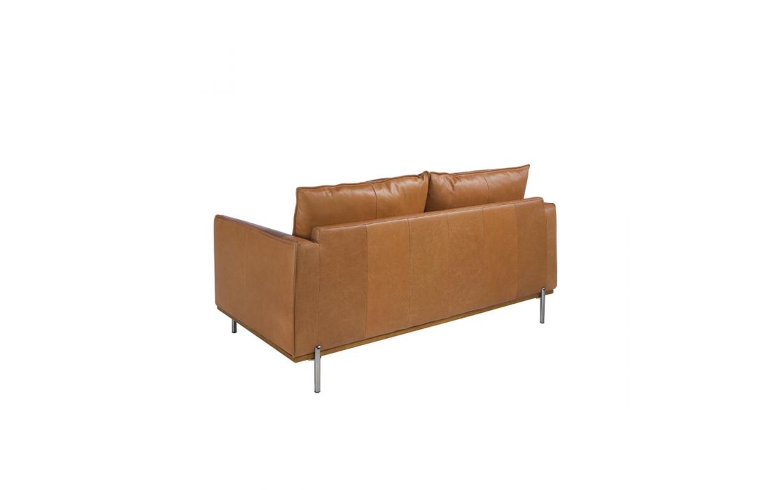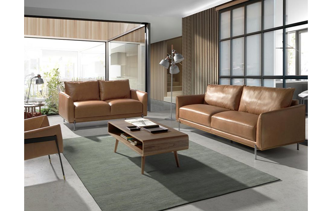 Sofá de design moderno estofado em pele de bovino com acabamento em madeira de faia vaporizada na cor de nogueira e pernas em aço inoxidável escurecidoDestinatário :