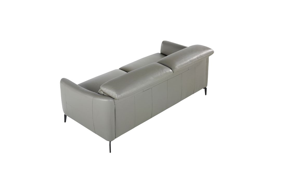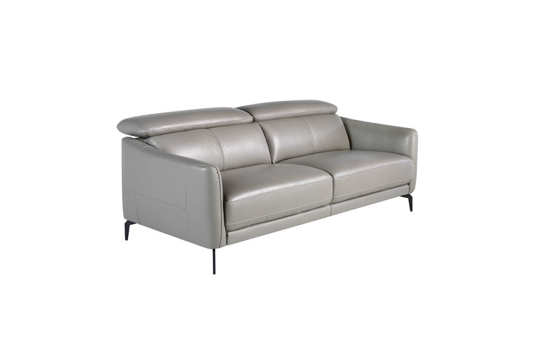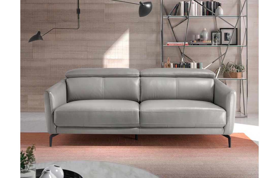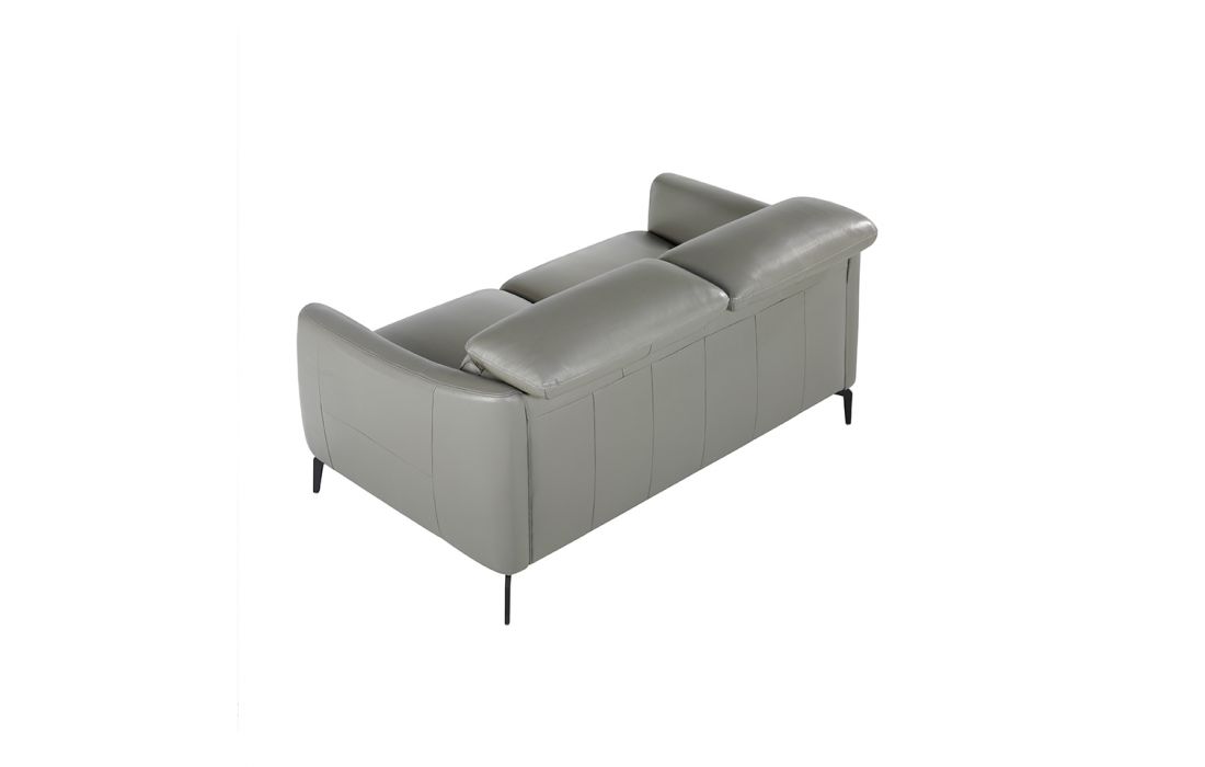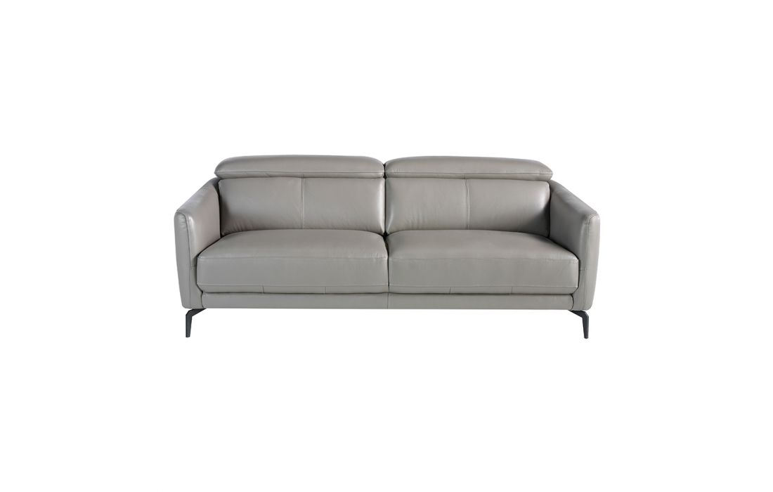 Sofá de 2 e 3 lugares estofado em couro bovino cinza com estrutura em madeira de pinho natural e apoios de cabeça articulados independentes. Pés de aço maciço pintados em epóxi preto.Destinatário :