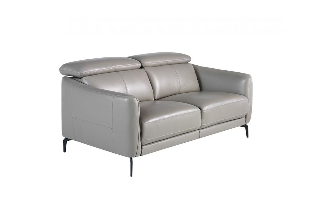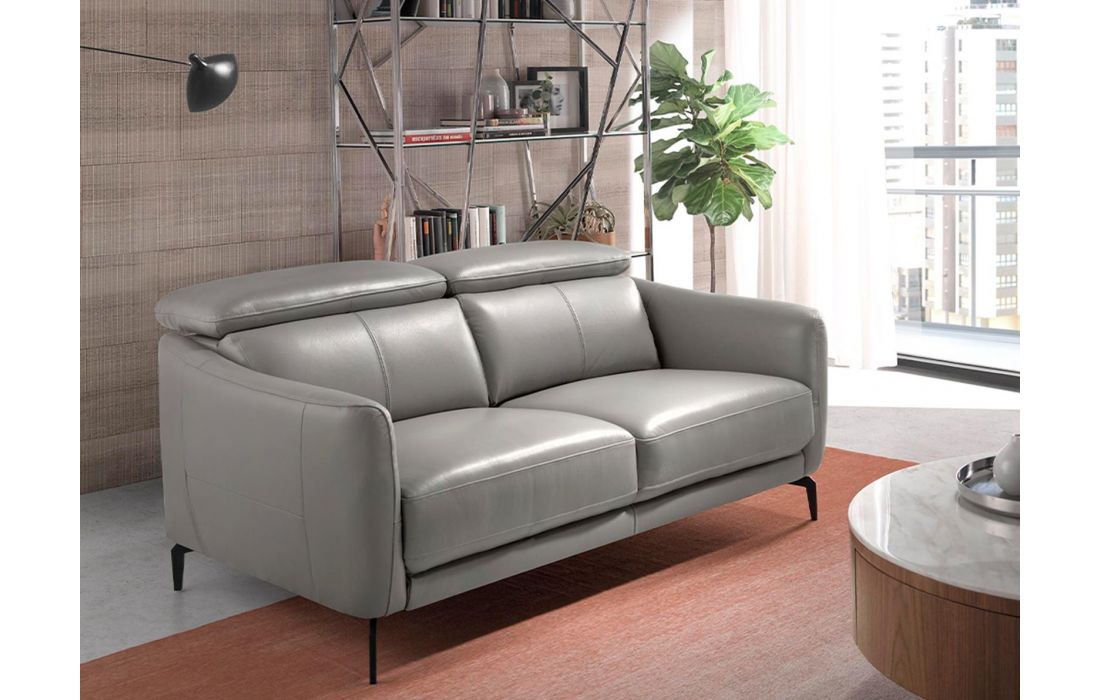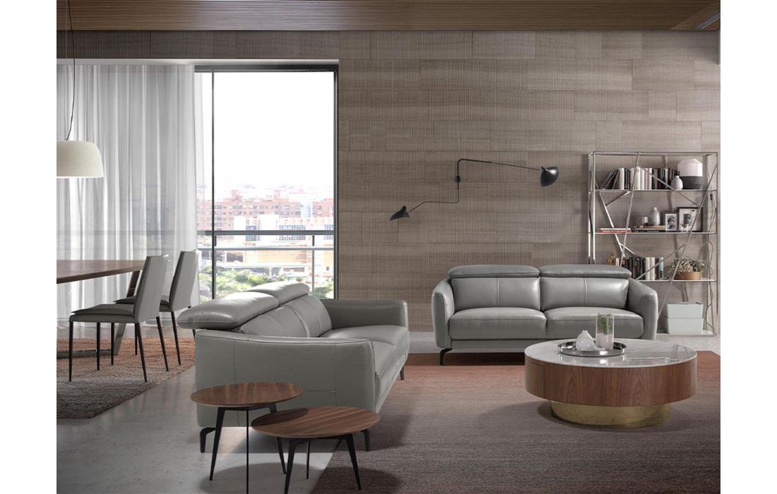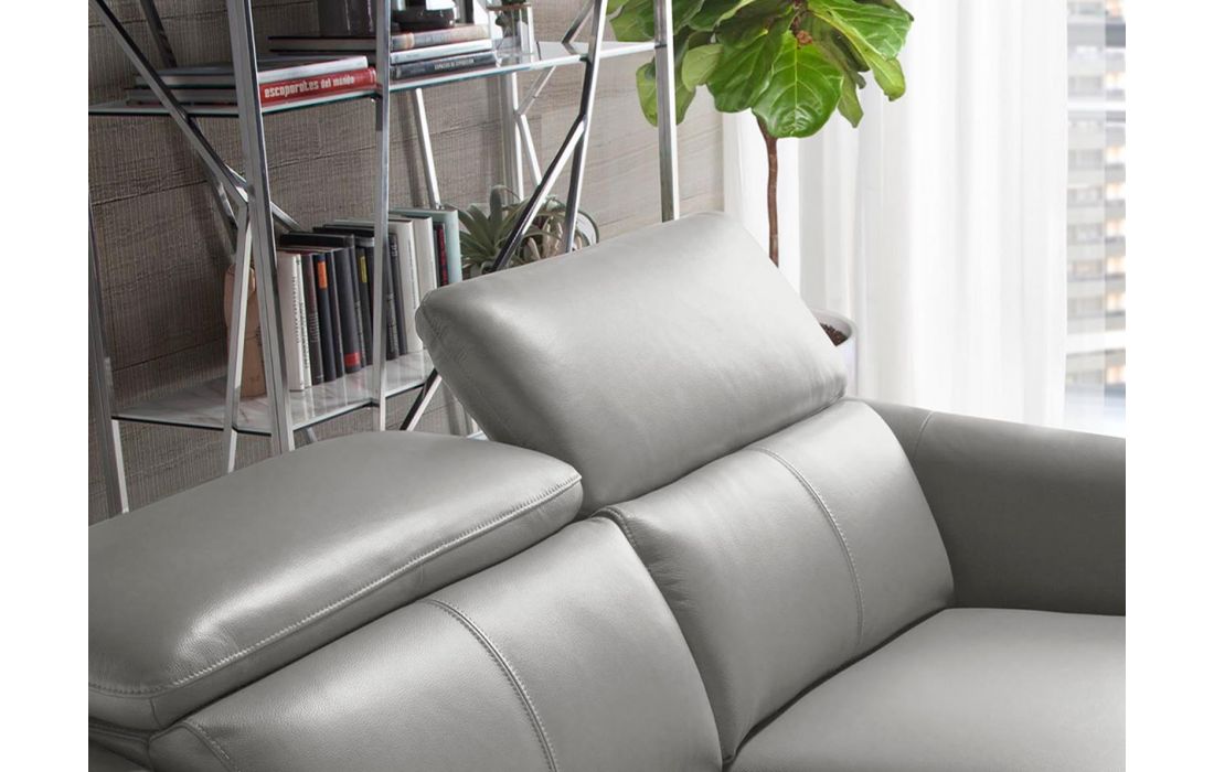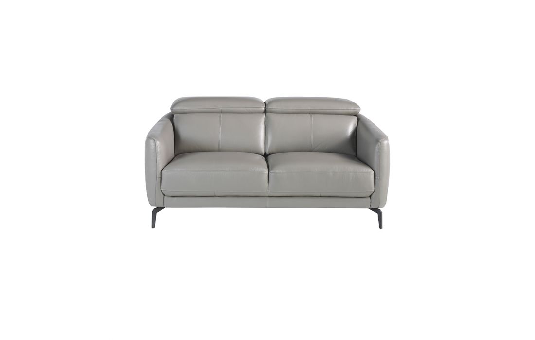 Sofá de 2 e 3 lugares estofado em couro bovino cinza com estrutura em madeira de pinho natural e apoios de cabeça articulados independentes. Pés de aço maciço pintados em epóxi preto.Destinatário :