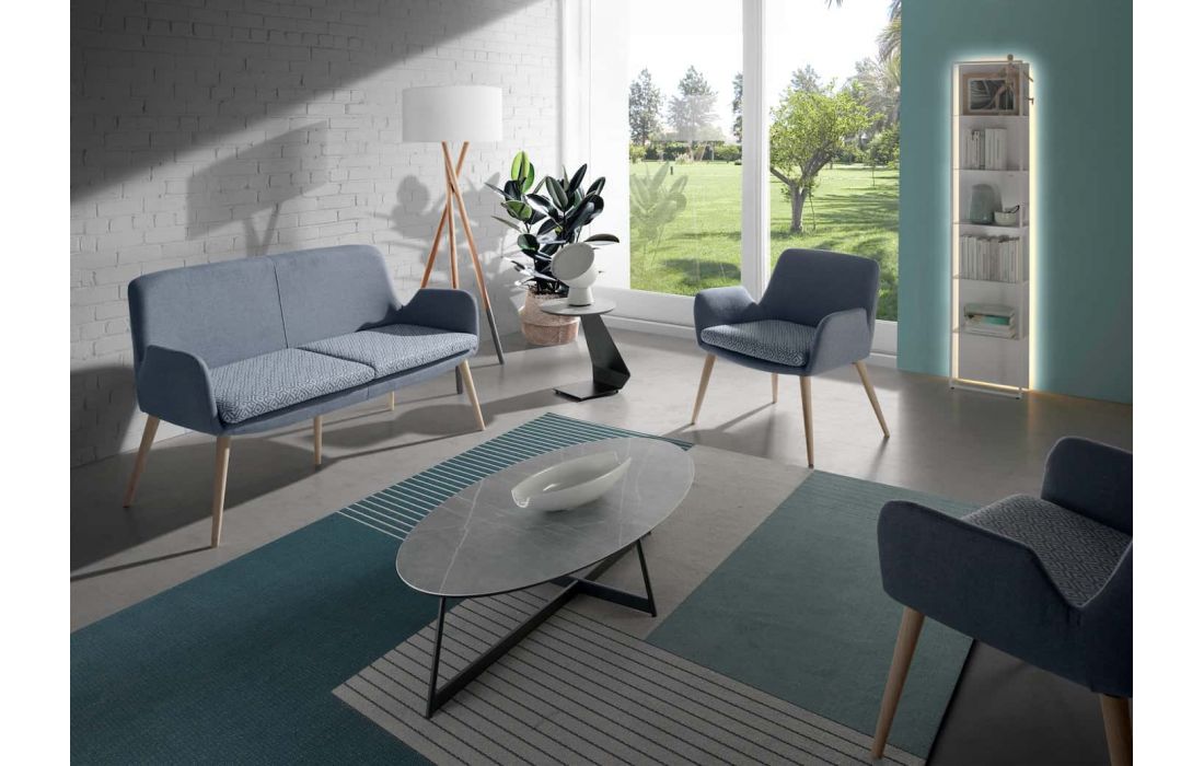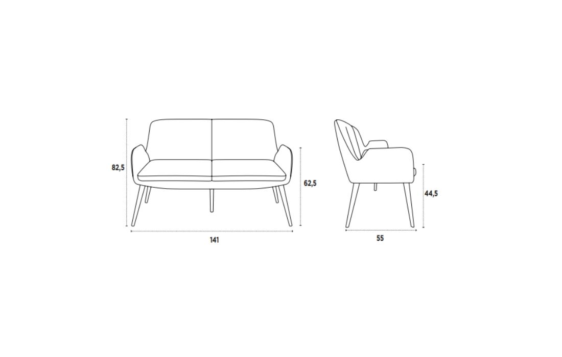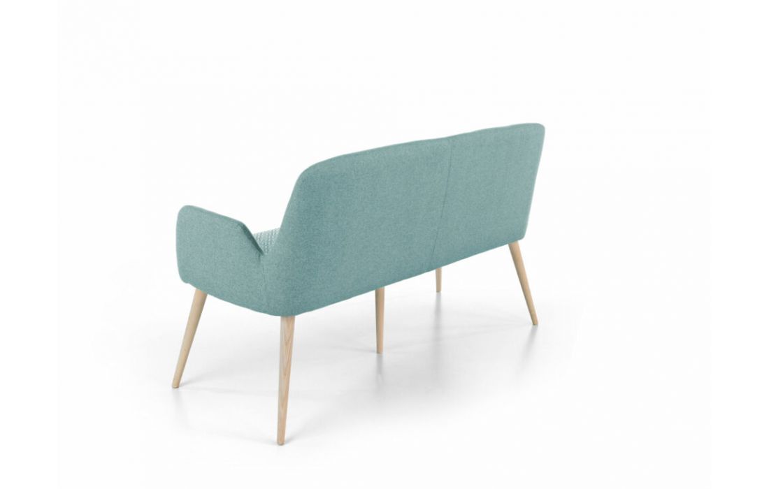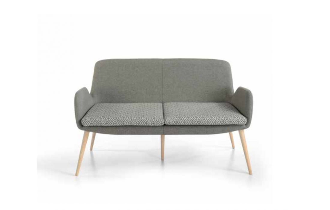 Sofá de 2 lugares com estofo em tecido e pés em madeira.