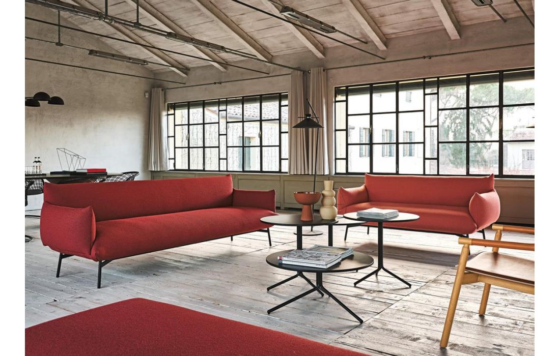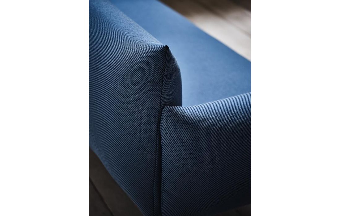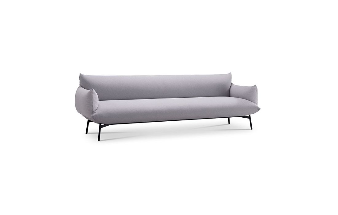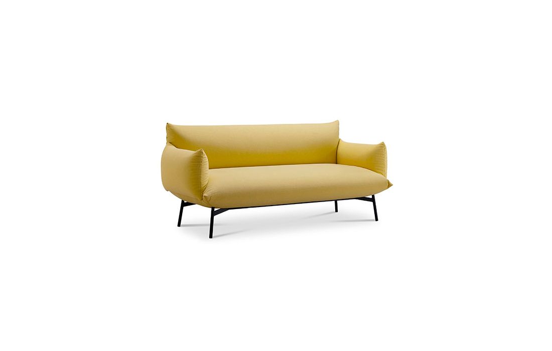 Sofá com revestimento em tecido e estrutura em metal.
