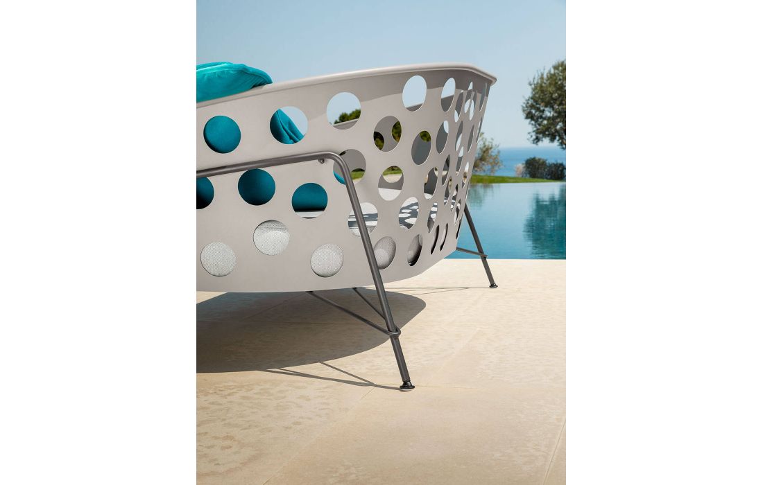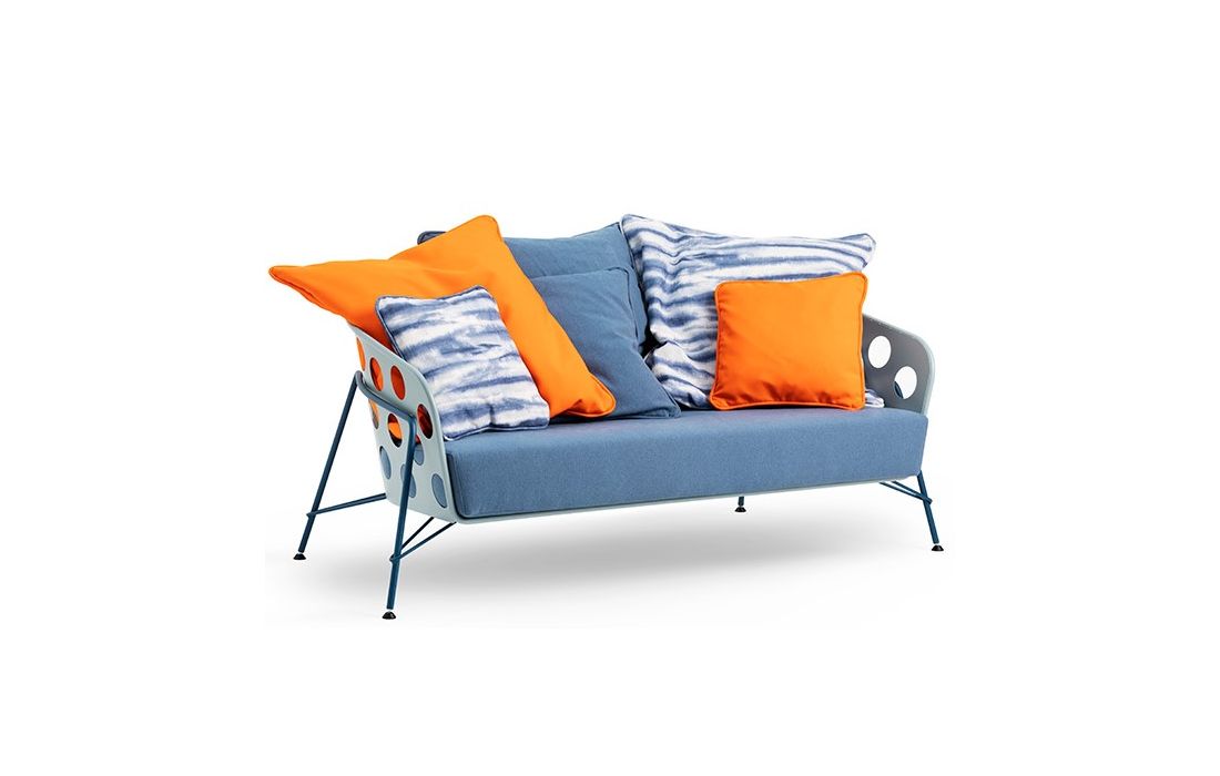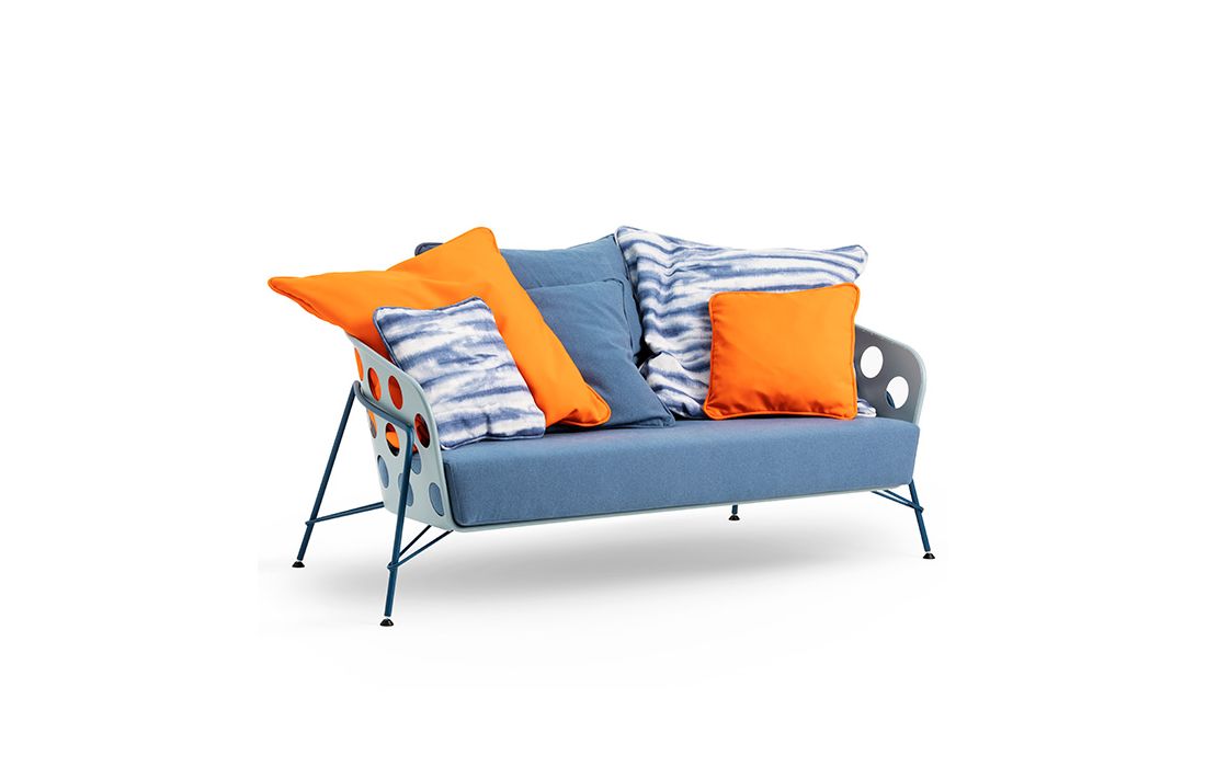 Sofá de 2 lugares com estrutura e encosto em metal lacado e almofadas em tecido.Destinatário :