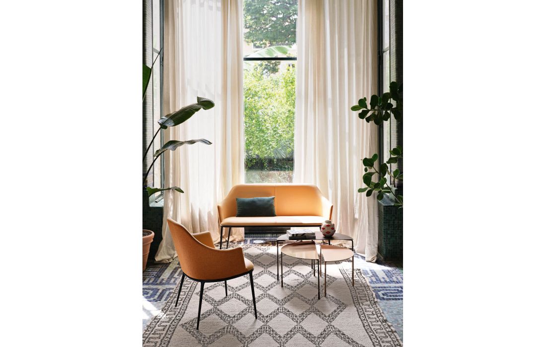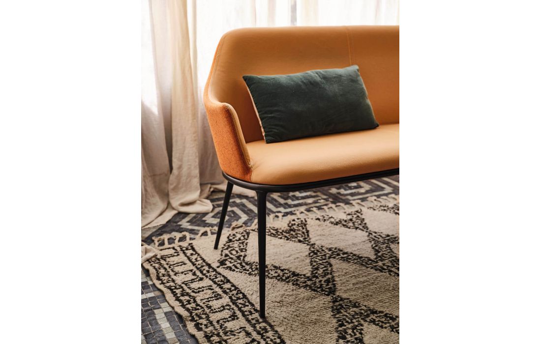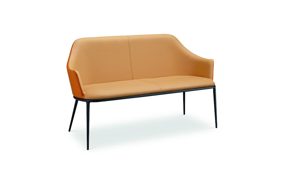 Sofá de 2 lugares com base de quatro pés em metal, assento e encosto estofados em tecidoDestinatário :