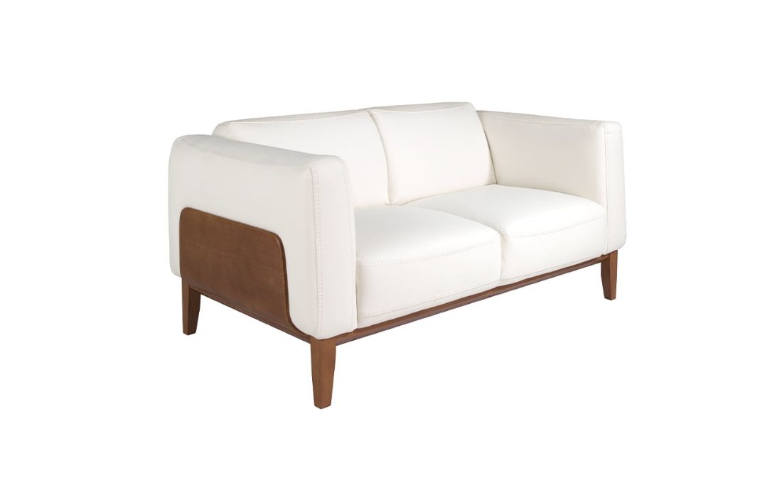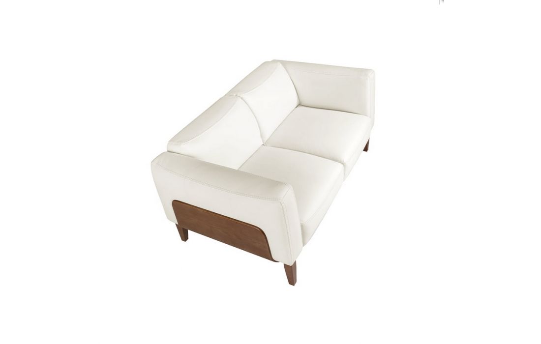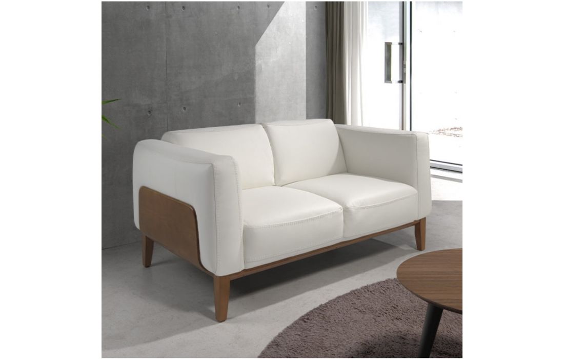 Sofá de design moderno estofado em pele de bovino com o acabamento em madeira de carvalho na cor de nogueira e pernas de madeira na mesma corDimensões em cm