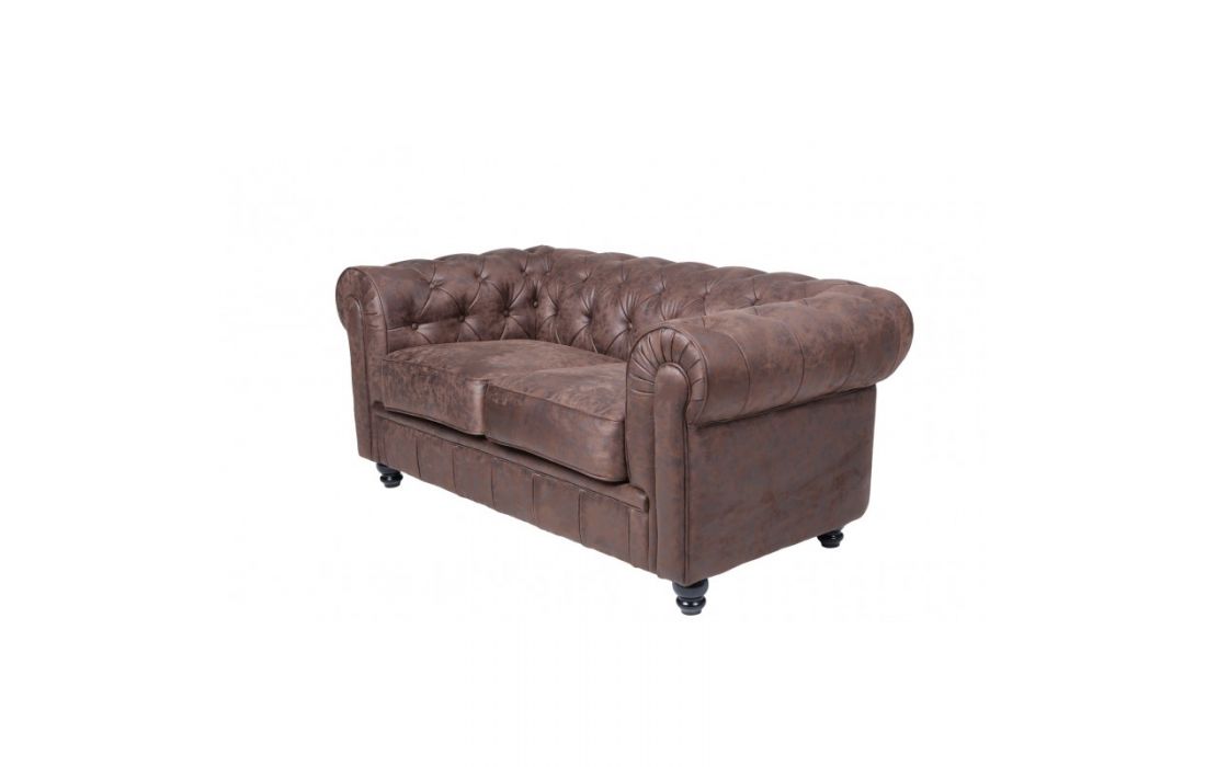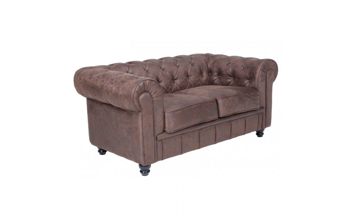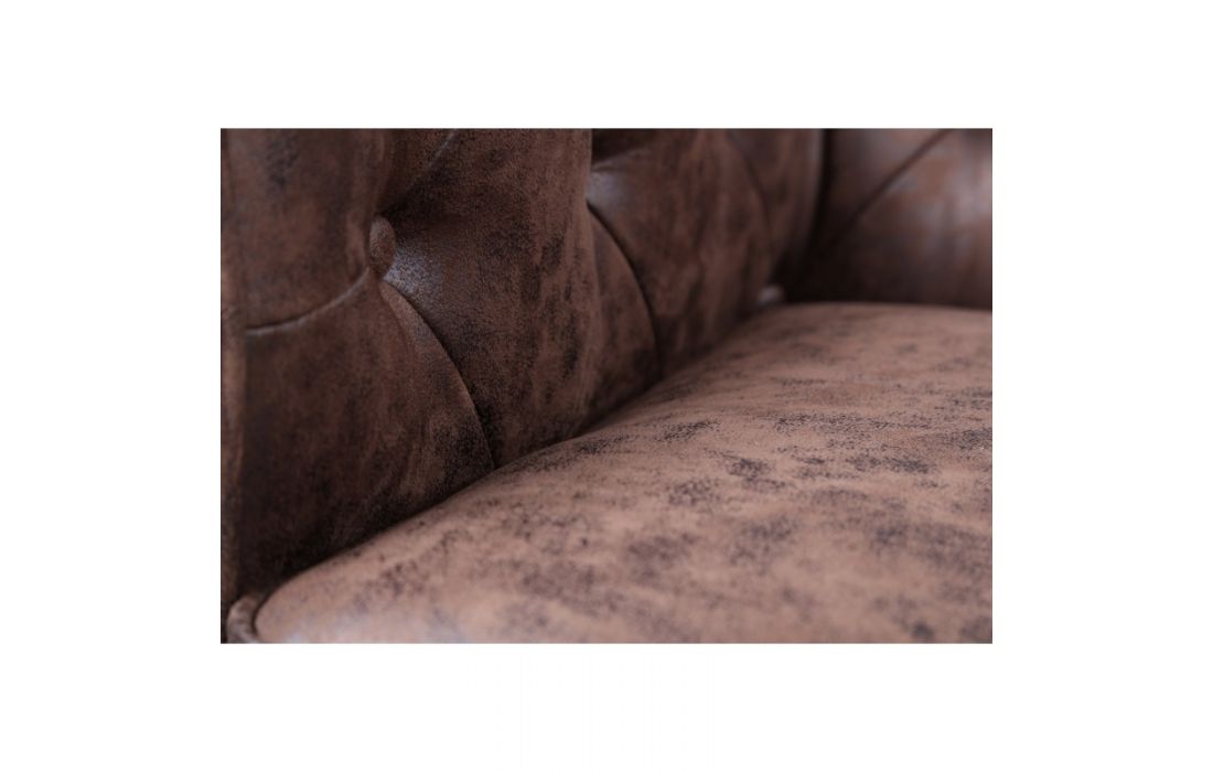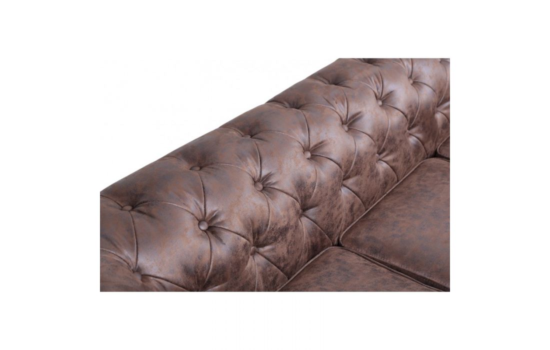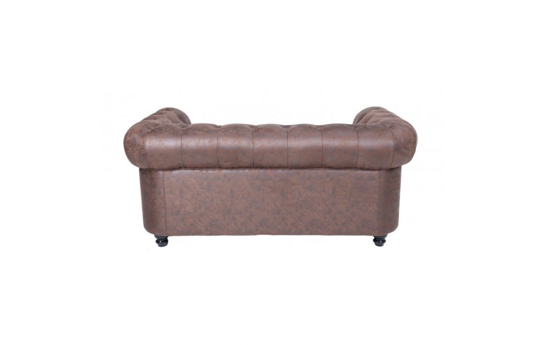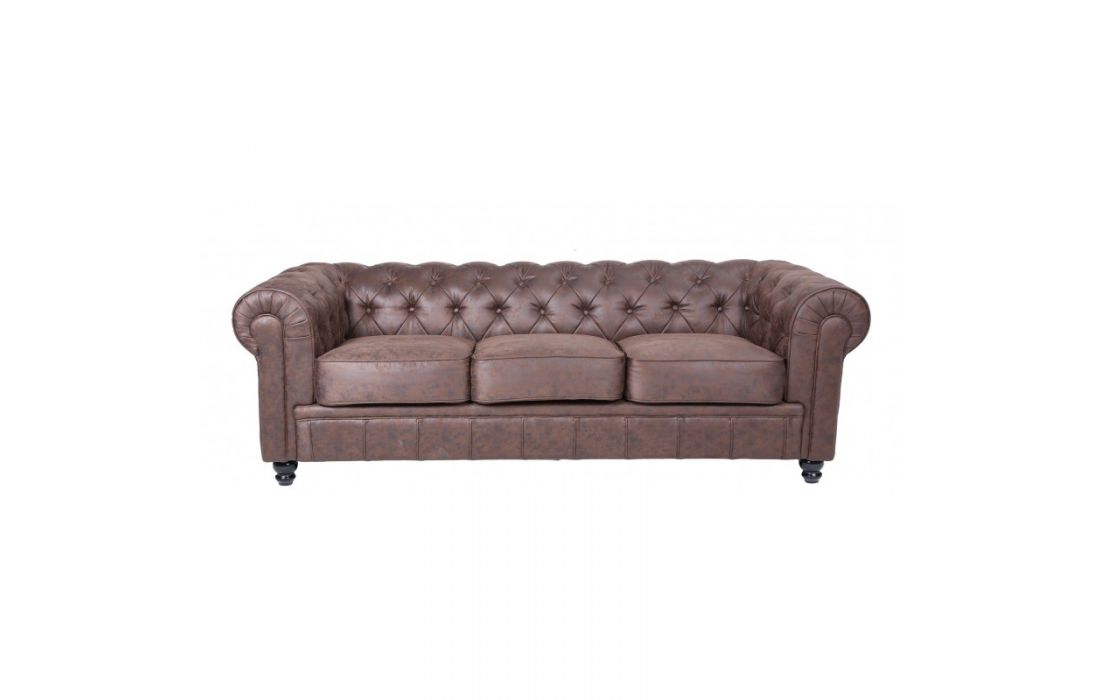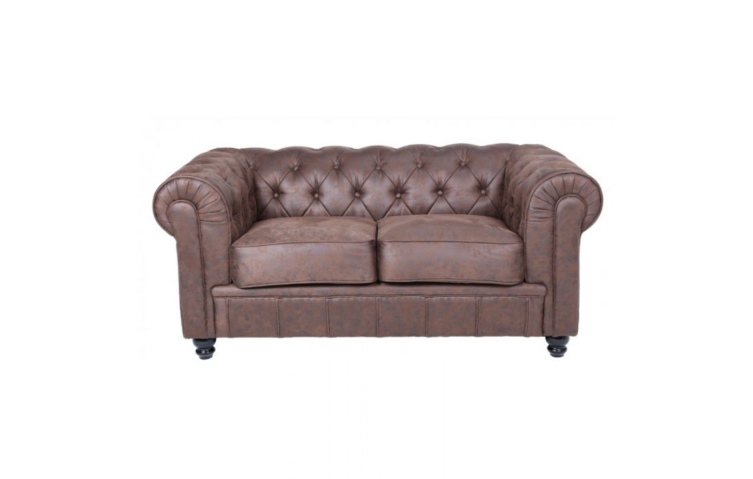 Sofá revestido com pele sintética vintage e estrutura em madeira.