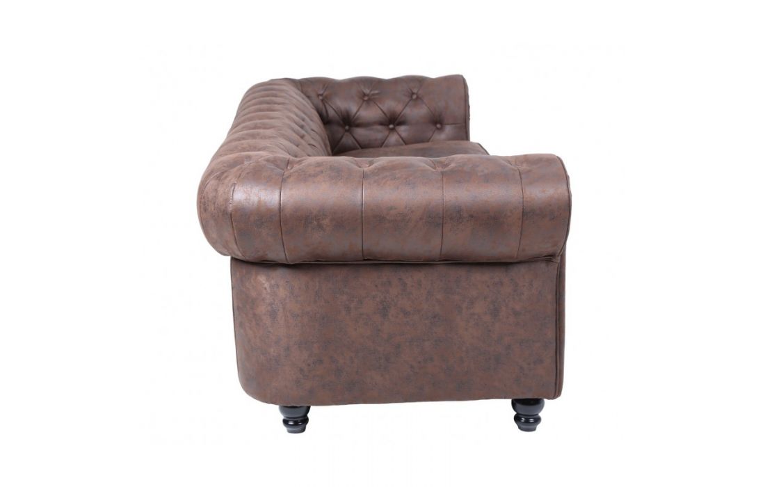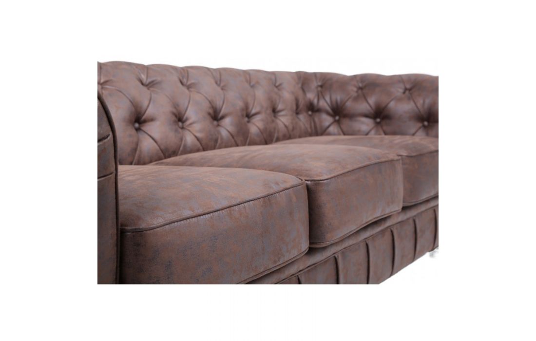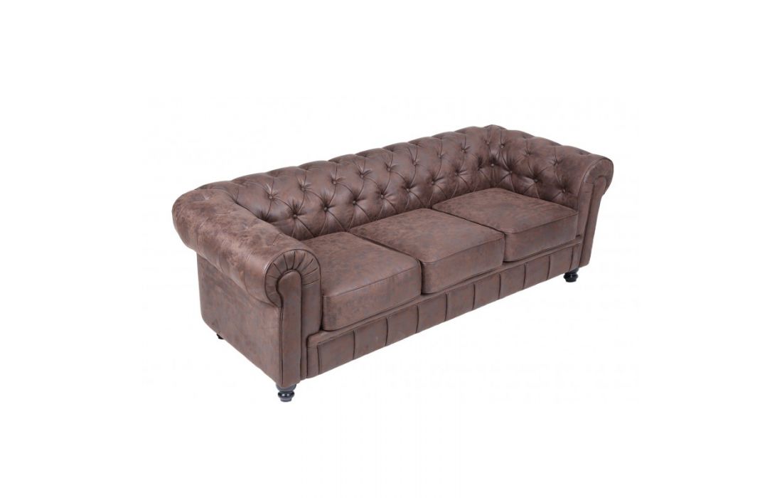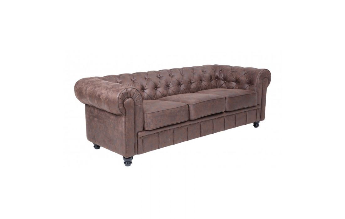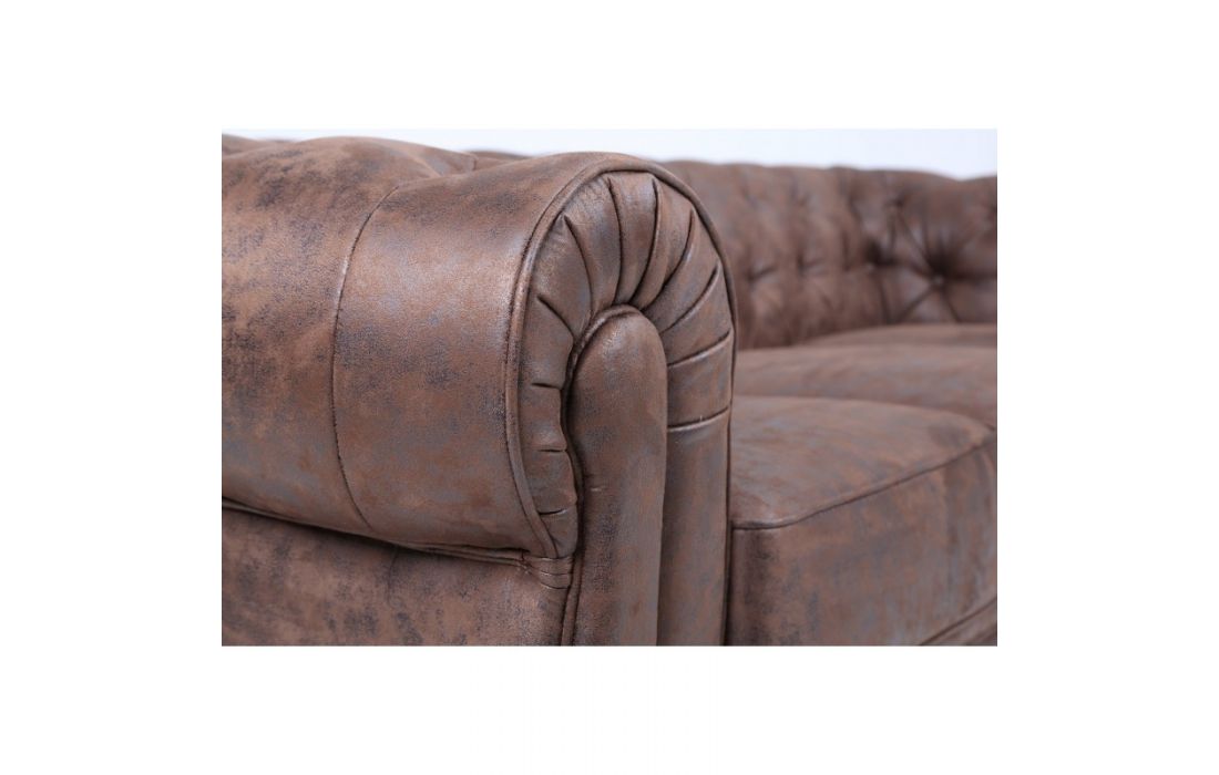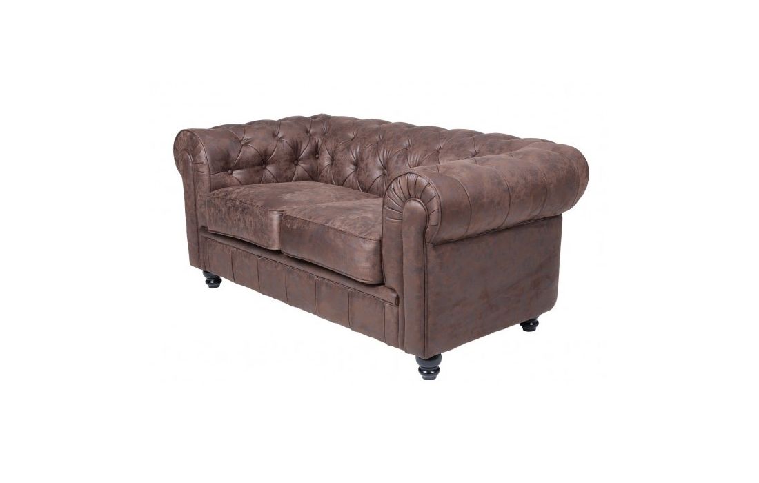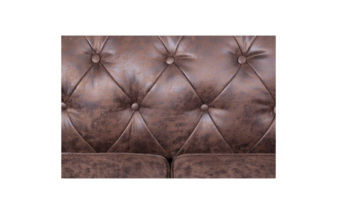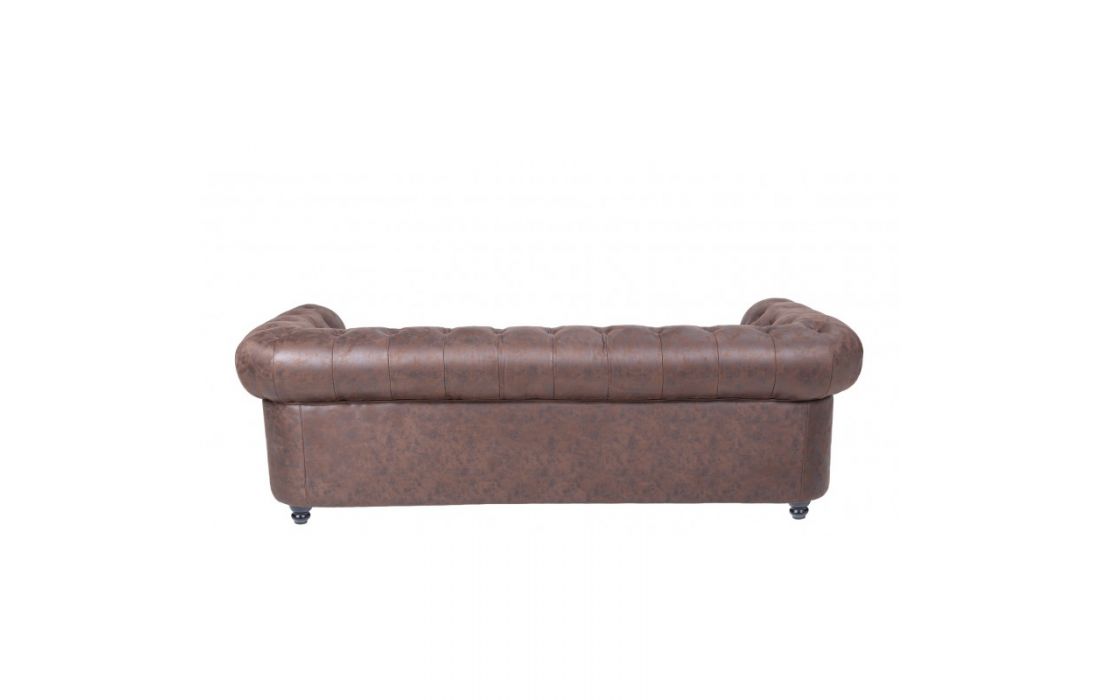 Sofá revestido com pele sintética vintage e estrutura em madeira.