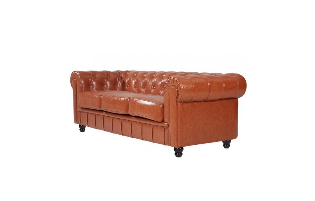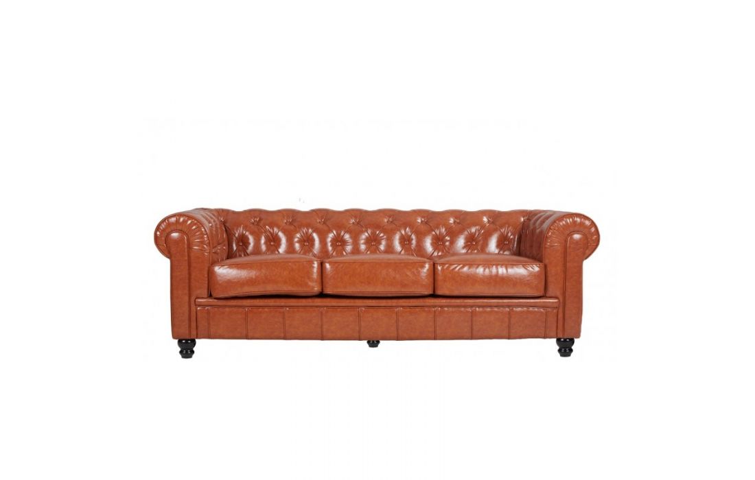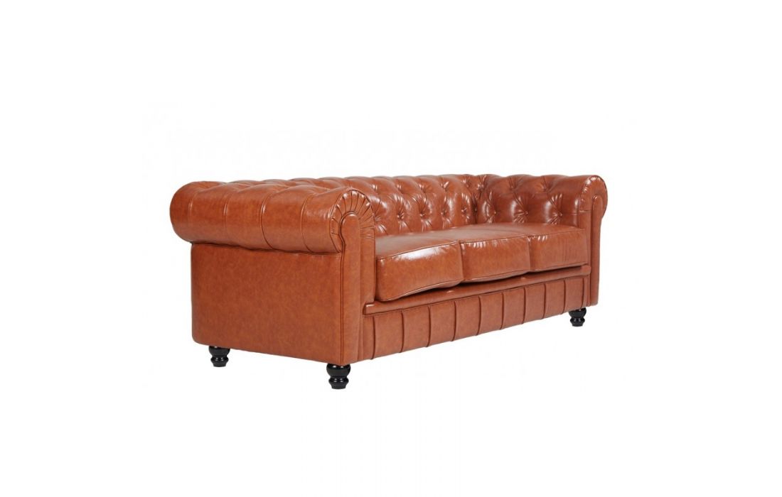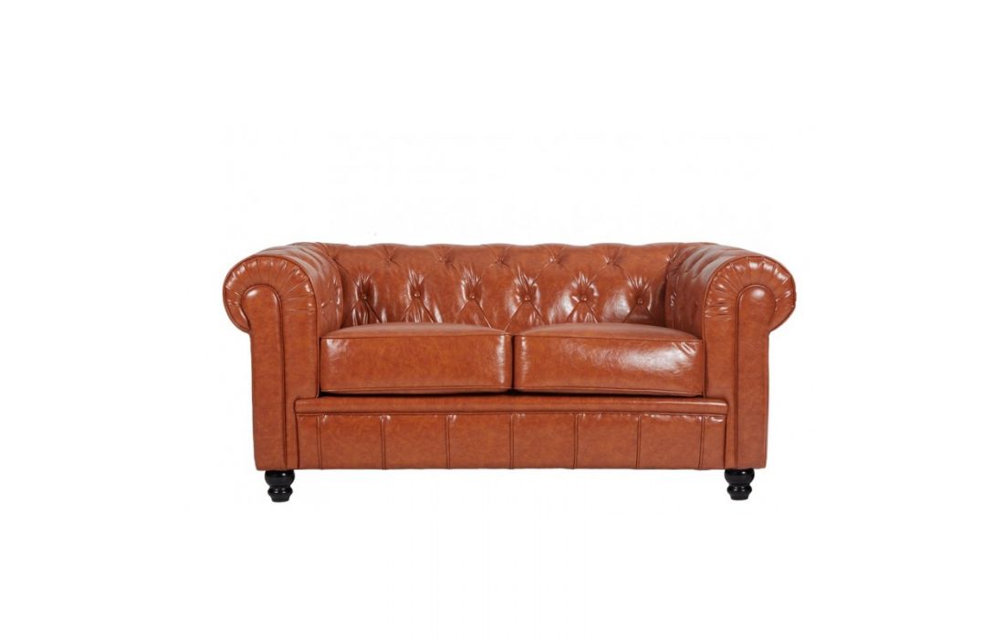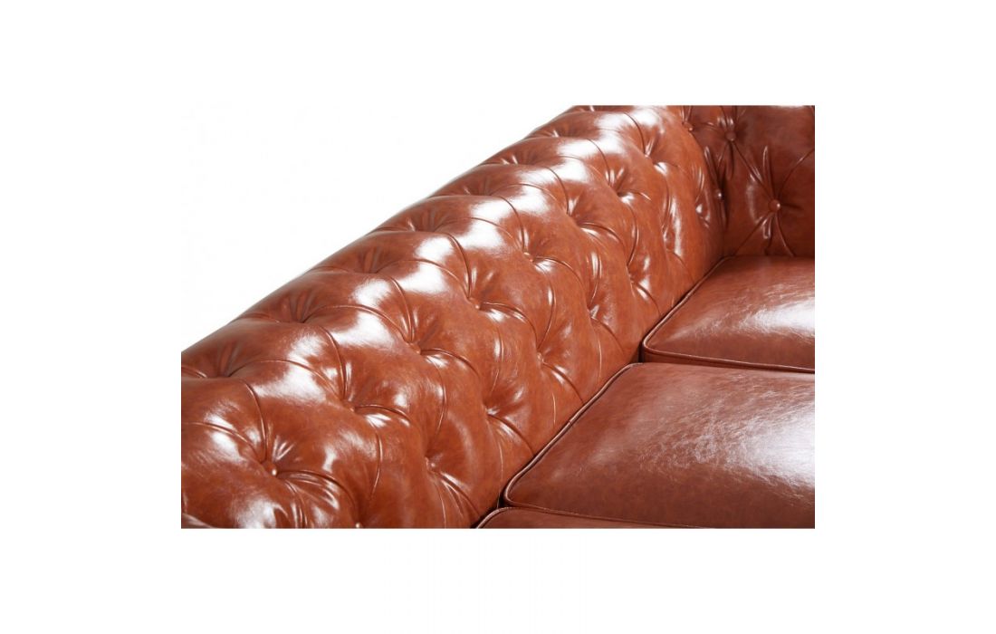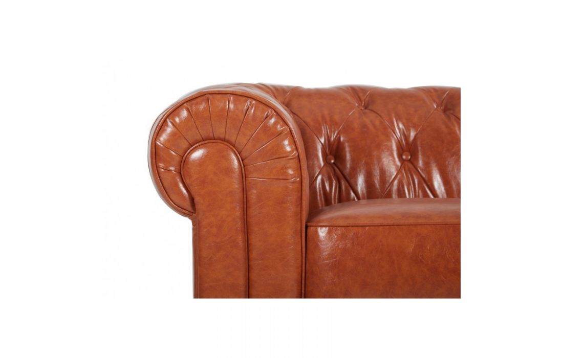 Sofá revestido com pele sintética vintage e estrutura em madeira.