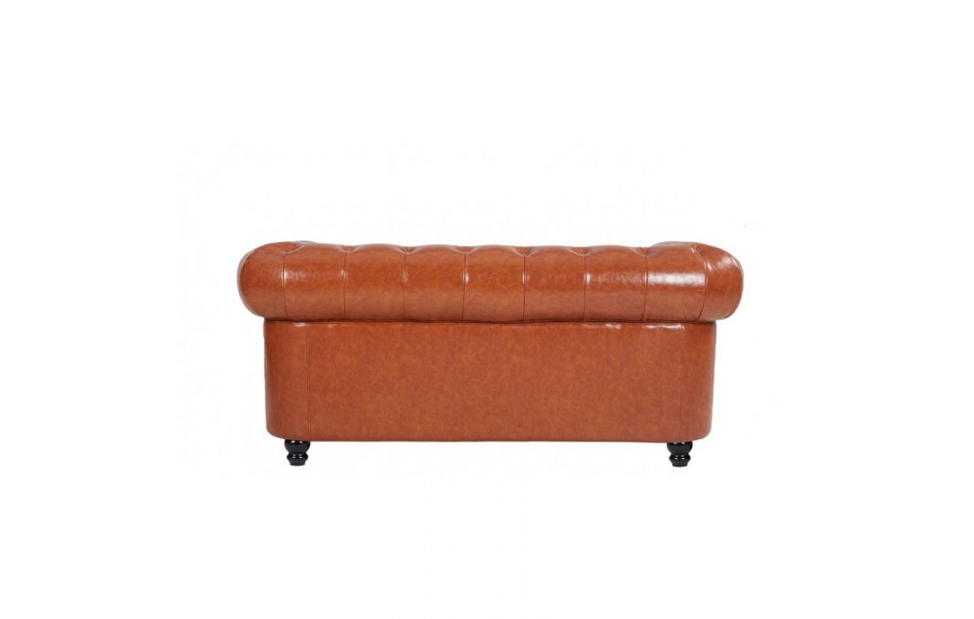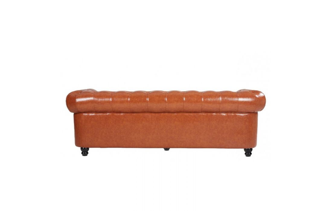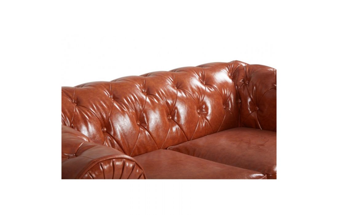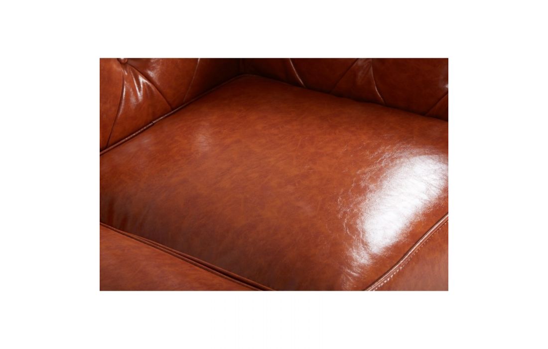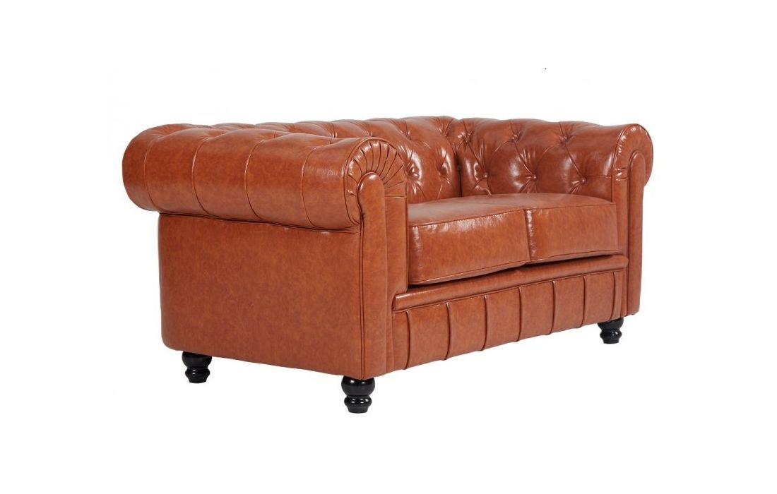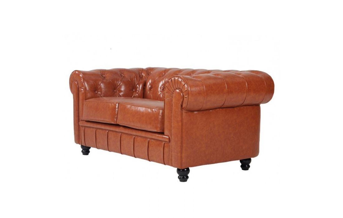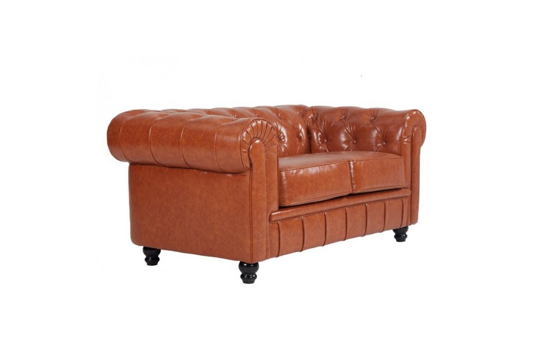 Sofá revestido com pele sintética vintage e estrutura em madeira.